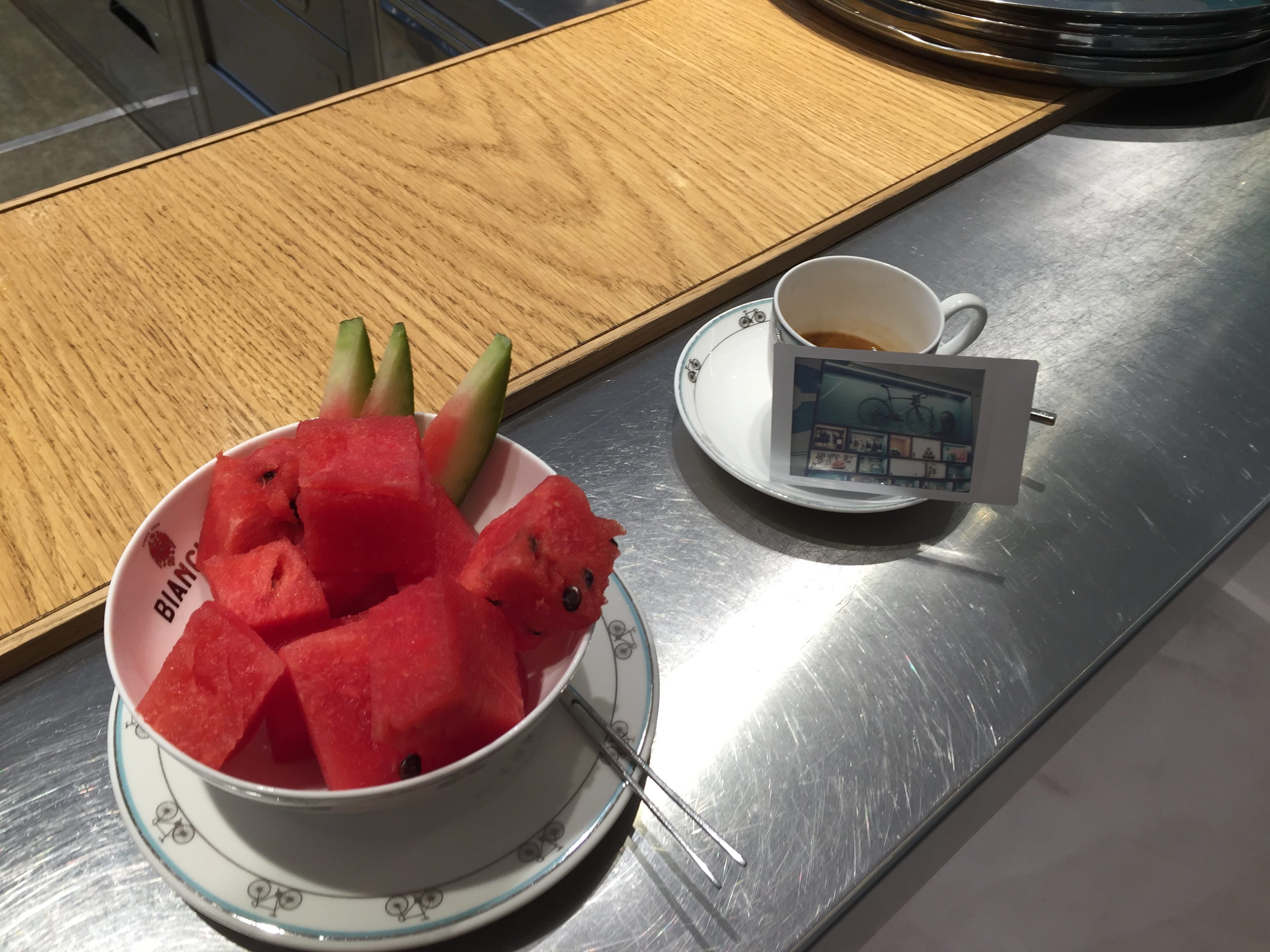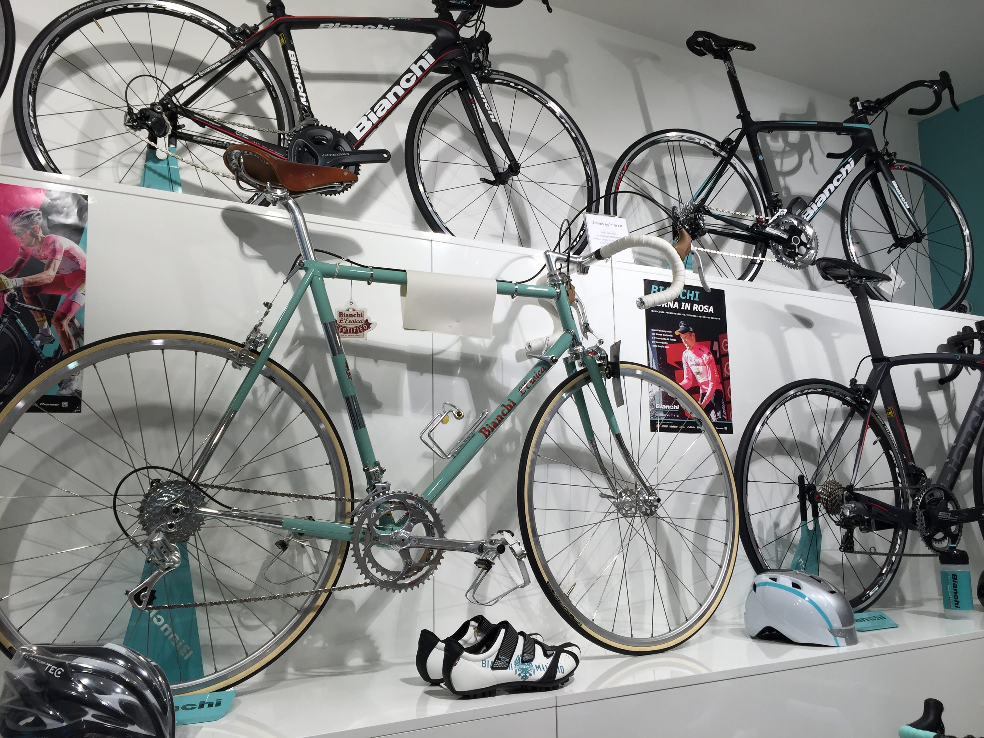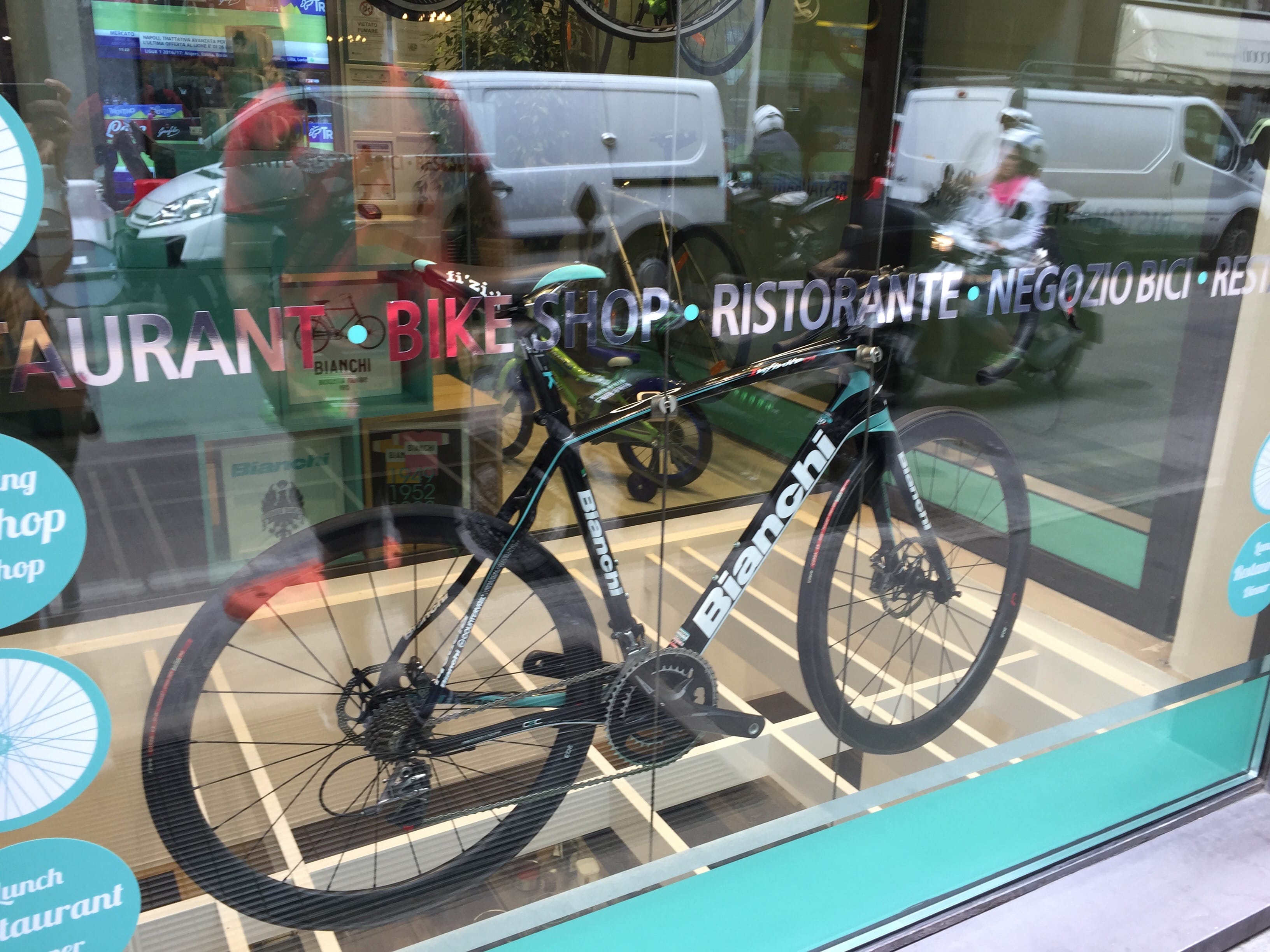 Nous nous baladons ensuite dans la ville à la recherche du café Bianchi. Marque associée principalement au cyclisme, ce lieu est un endroit pour se restaurer et faire des achats liés au vélo… D’après le serveur, le grand patron voulait regrouper dans le même endroit le meilleur de ce que l’Italie a à offrir : le café et ses vélos (il n’y a pas que les Français qui sont un peu chauvins vous voyez…!). Mais l’espresso était parfait et les vélos exposés, ainsi que le store valaient franchement le coup d’œil pour le passionné qu’Il est. Expérience 100% italienne et en dehors des sentiers battus garantie.