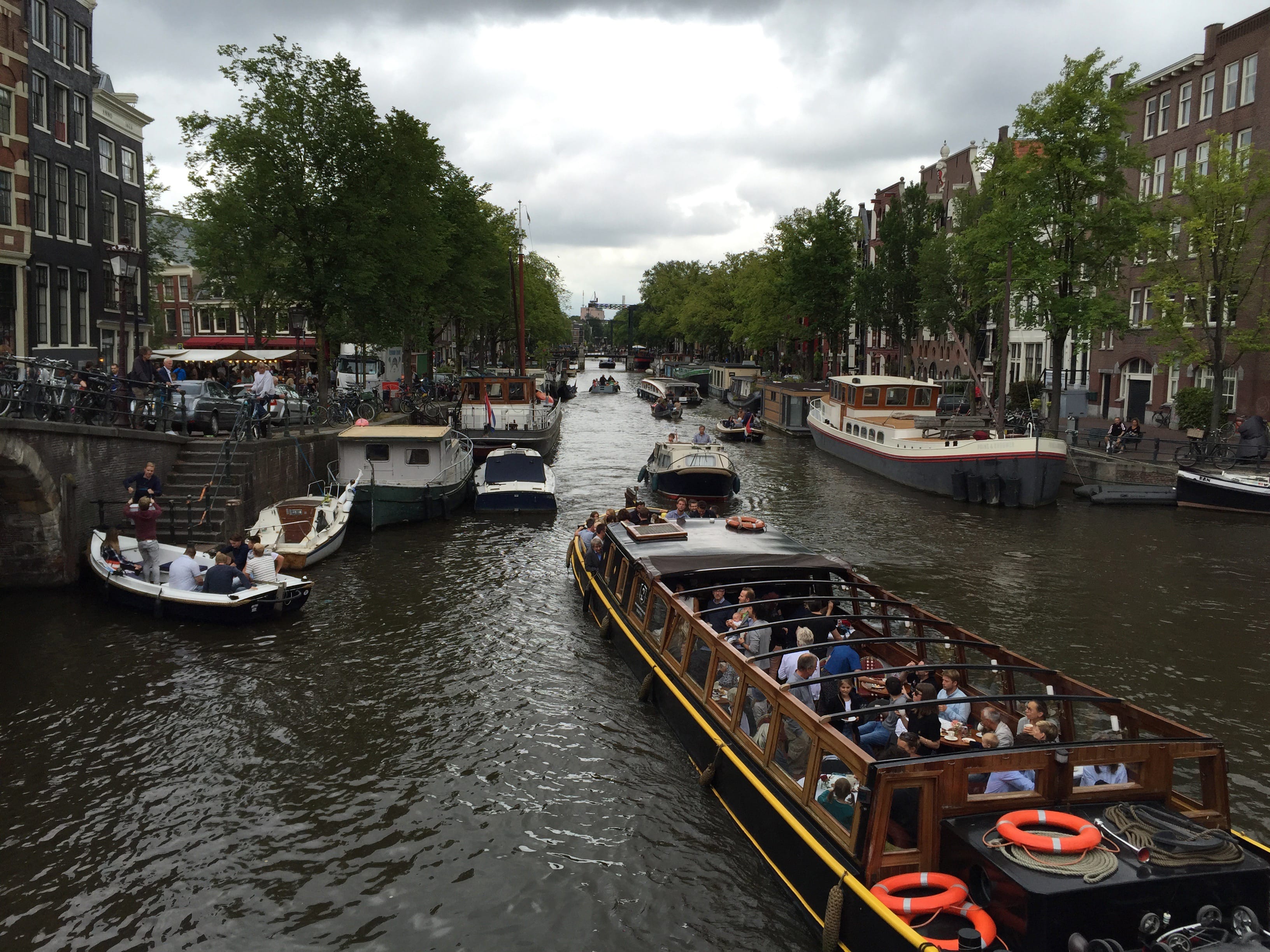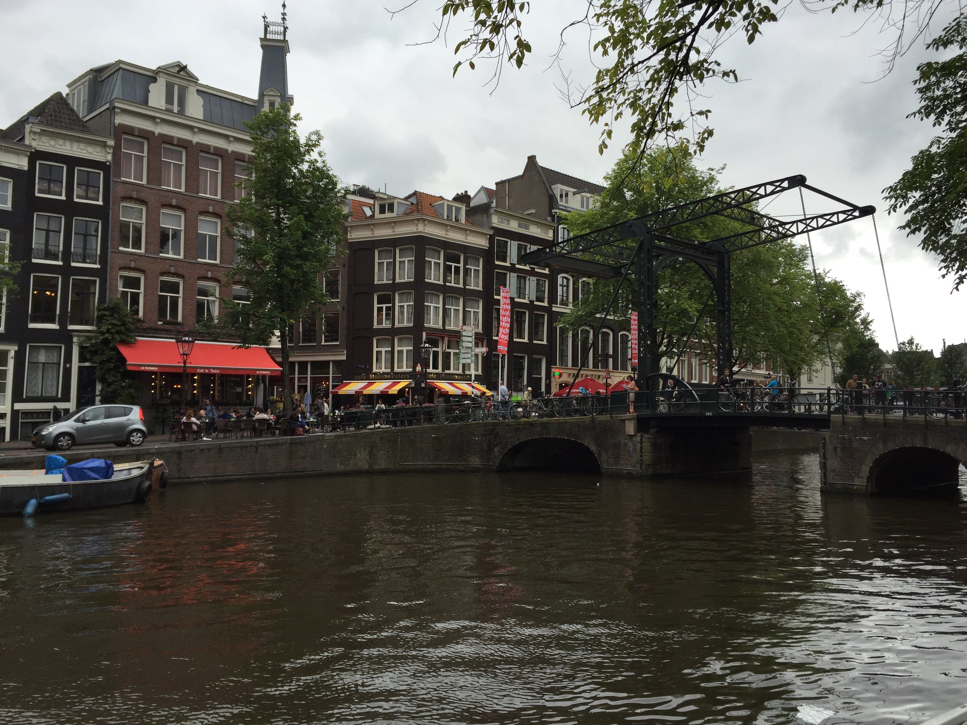 Il ne nous faudra pas longtemps à partir de ce point pour arriver à proximité des premiers canaux, et nous rendre compte de la réelle affluence en cette période estivale, et ce, même si finalement le temps n’était pas tout à fait au rendez-vous ce jour là… On le savait, la météo du 15 août relève toujours d’un certain hasard. Nous en profiterons donc pour nous balader sans réel objectif, sauf peut-être celui de faire un peu connaissance avec la ville, découvrir ses quartiers, et repérer les lieux vers lesquels nous pourrons nous diriger le lendemain. Mais déjà, le dépaysement est au rendez-vous, entre canaux très typiques, bateaux de toutes sortes et magasins de fromages… On en oublie presque les vélos, qui sont vraiment mis à l’honneur dans cette ville. Presque un peu trop, tant ils deviennent limite un danger pour les piétons, non avertis que nous sommes, défilant de tous les cotés, sans trop prévenir. Finalement arrivés, un peu par hasard, devant la maison d’Anne Frank, tristement célèbre, nous souhaitions absolument la visiter. C’est d’abord les yeux rivés sur la façade que nous nous en approchons, avant de nous rendre compte que l’incroyable file, serpentant de la maison jusqu’à la petite place accolée, était en fait la file des visiteurs voulant, comme nous, s’y rendre… Nous avons donc pris la décision de réserver notre visite le lendemain matin et ainsi profiter de la soirée qui s’annonçait pour découvrir un peu plus le reste de la ville. Nous ne pouvons donc que vous recommander de réserver votre visite en ligne…!