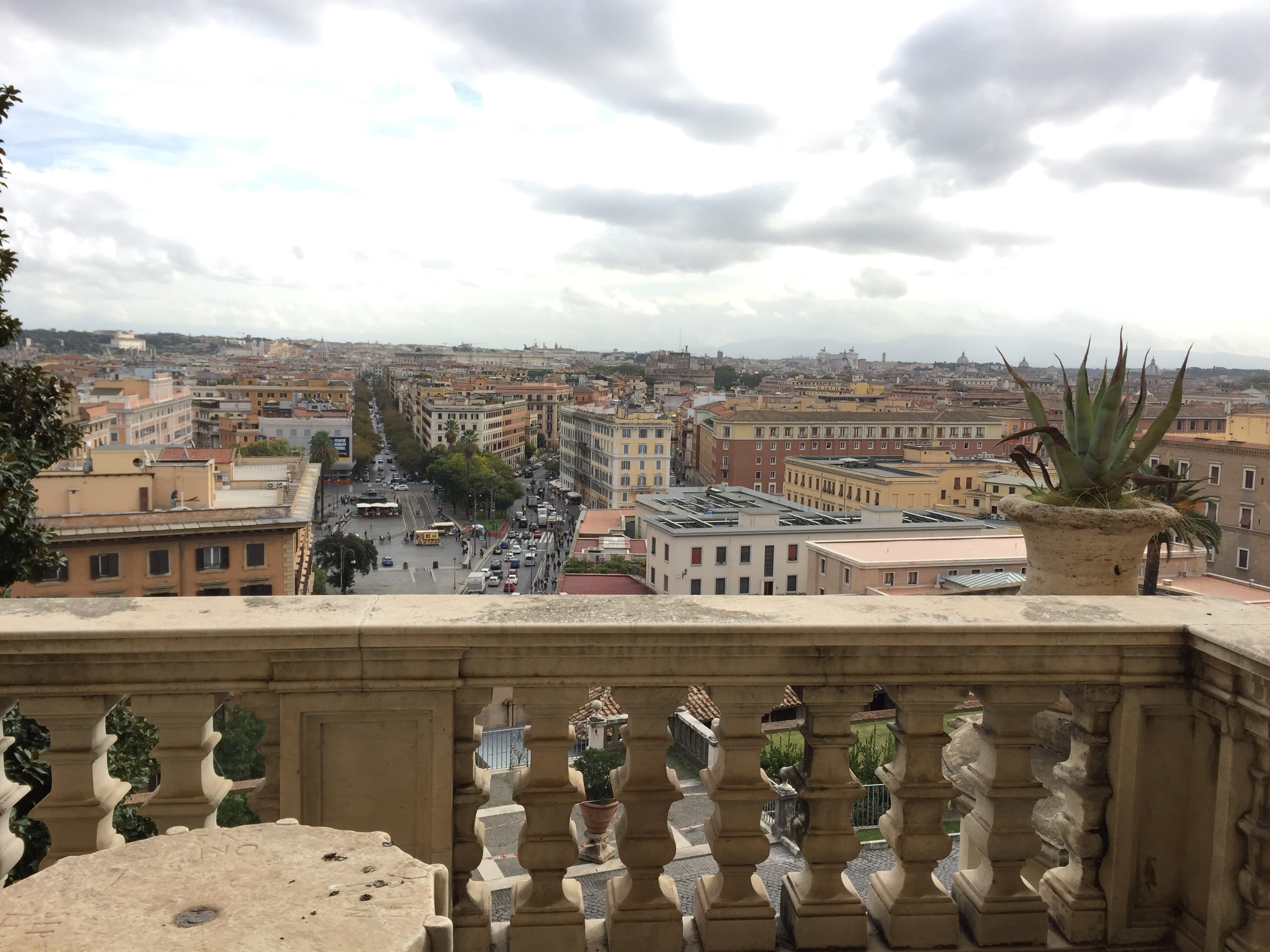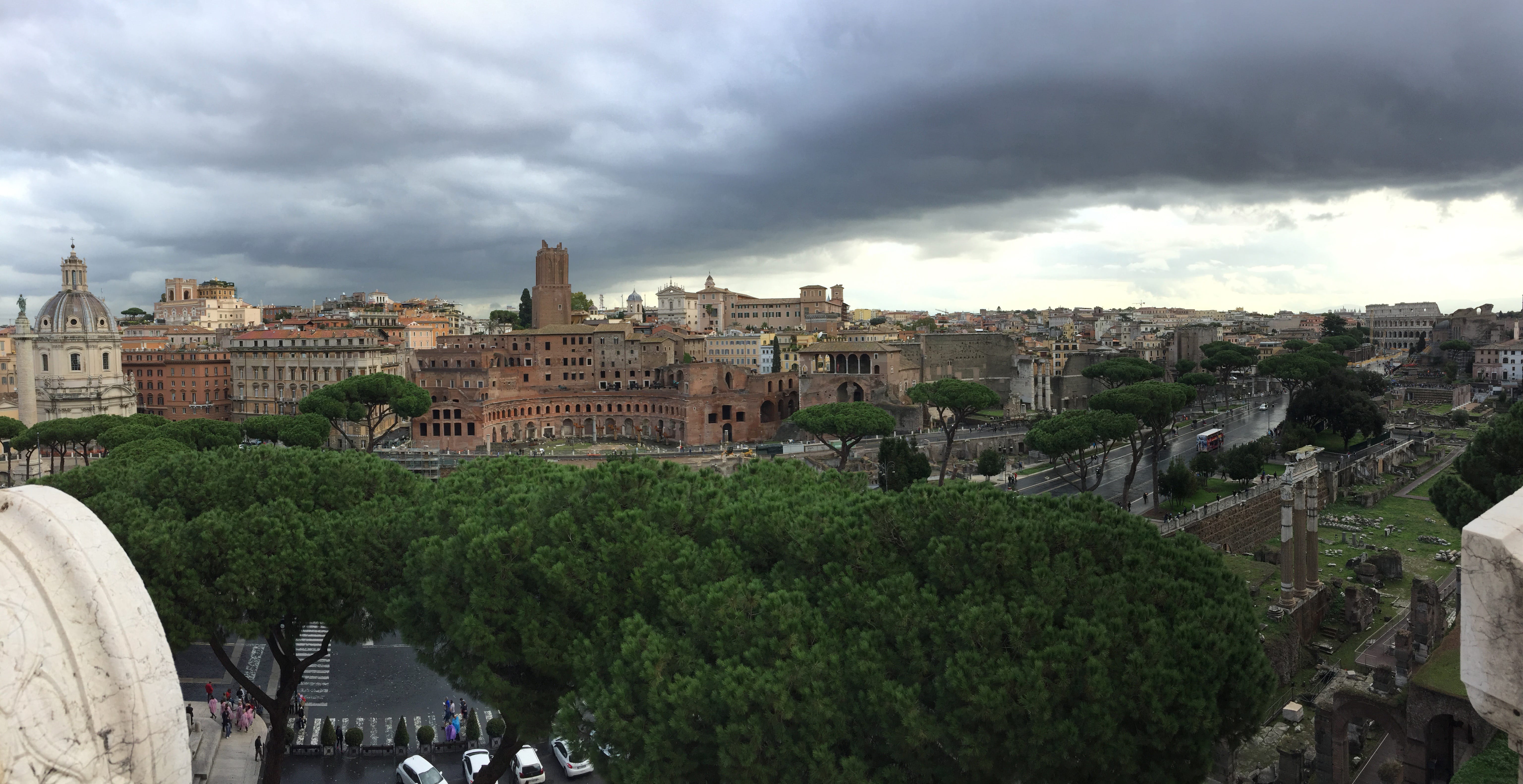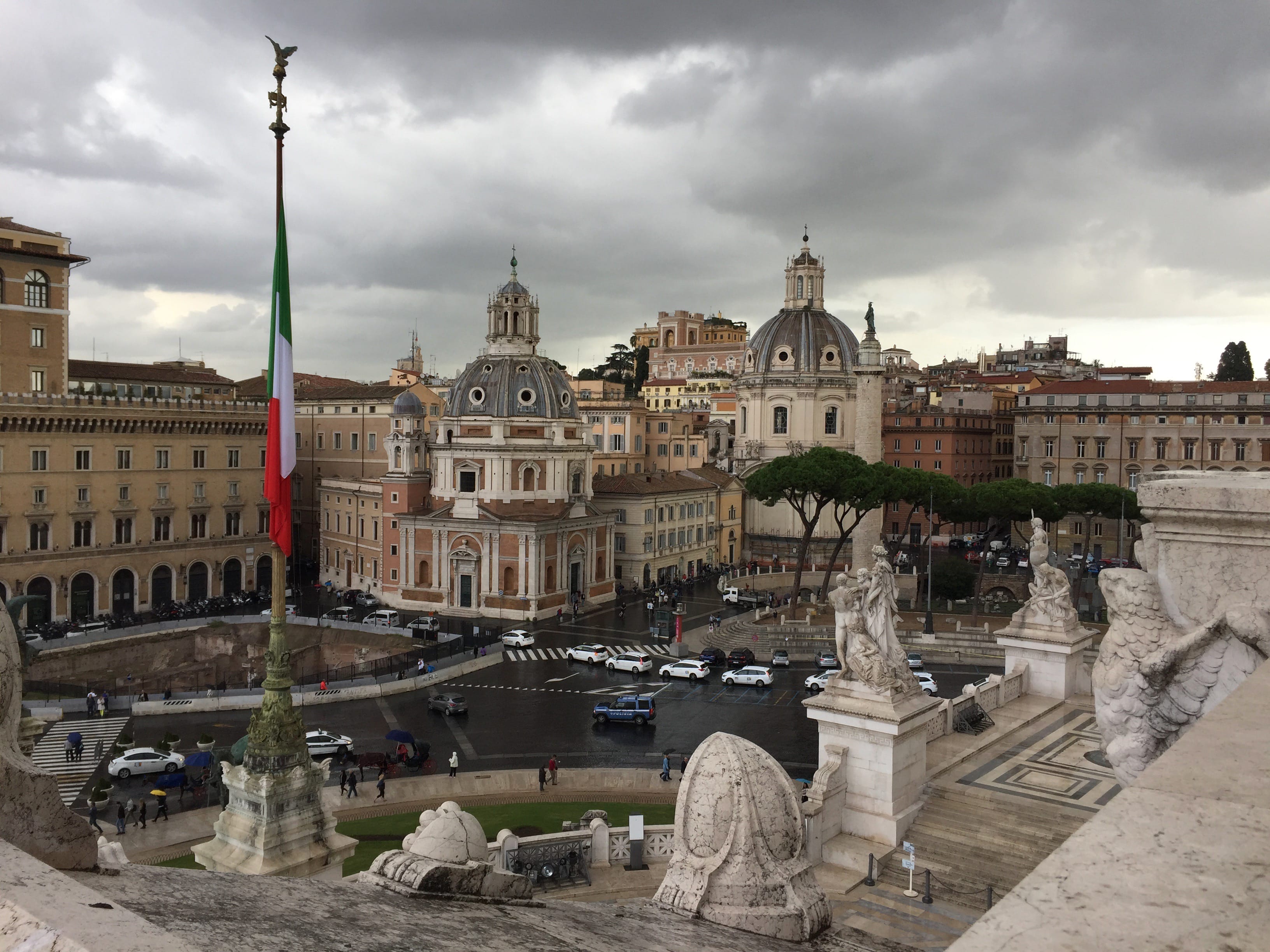 C’est à pied que nous quittons, de bon matin, notre quartier, impatients de découvrir cette ville que nous attendions tant. Au détour de certaines rues, nous apercevons déjà plusieurs statues, vestiges, et autres bâtiments témoins de l’histoire de la ville. Mais c’est en arrivant à la Piazza Venezia que nous prenons la pleine mesure de ce que la capitale a à nous offrir. Nous grimpons les marches du Monument à Victor-Emmanuel II pour profiter d’une vue plongeante sur les quartiers alentours, avant de redescendre et nous diriger vers le Colisée.