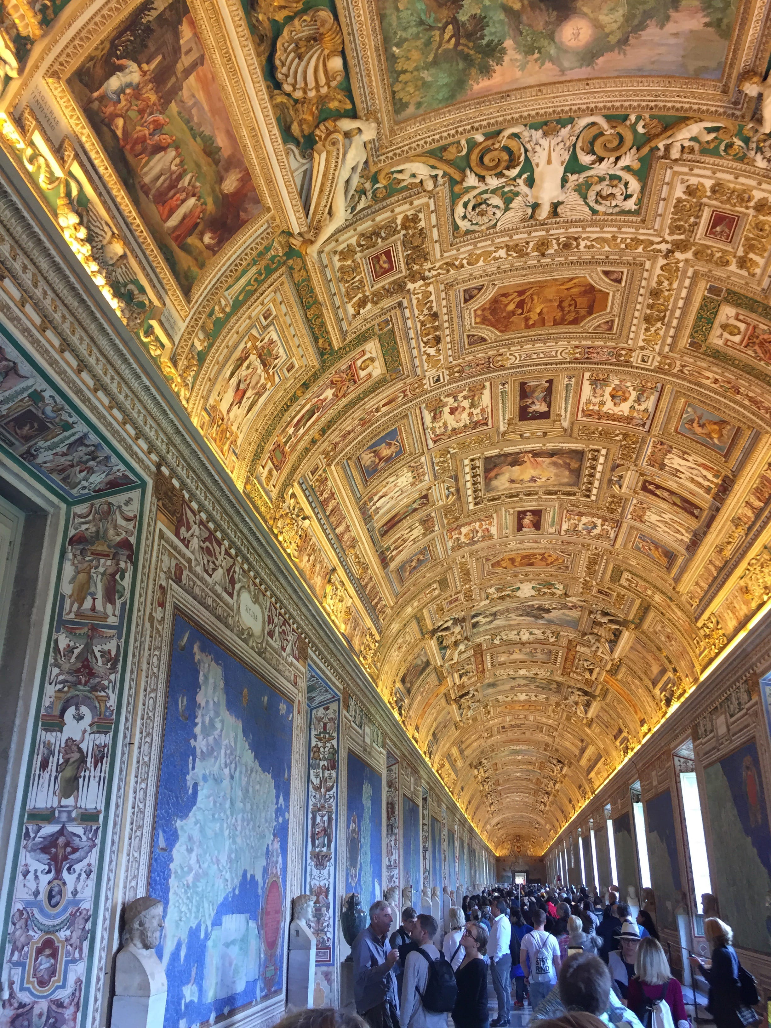 Gonflés à bloc, nous avons cette fois pour objectif de rejoindre le Vatican à pied depuis notre chambre. Pas une mince affaire dans la mesure où nous avions la visite guidée à 10h30. Enfin, c’est ce que l’on croyait. C’est arrivés au point de rassemblement que nous avons appris que la visite était prévue à 10h et que notre groupe était donc déjà parti et avait probablement déjà passé la sécurité. Ne pouvant se permettre de tout décaler, nous avons insisté et avons donc été accompagnés par une jeune femme de l’agence jusqu’à notre groupe, évitant ainsi file d’attente immense, et sécurité… Nous déconseillons cependant d’utiliser cela comme une méthode, à moins de bien parler italien, et d’être convaincants… A vous de voir ! 😜