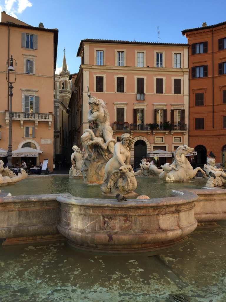 Avant de profiter de notre soirée, nous rejoindrons le centre, en s’arrêtant dans l’une des nombreuses églises de la ville pour allumer un cierge comme nous avons pris l’habitude de le faire, pour une amie, pour nos parents. Nous voyons cela comme une petite pensée pour eux dans nos voyages. Sans davantage de sens qu’un peu de spiritualité et un petite attention. Enfin, nous repasserons par la Piazza Navona, la place d’Espagne et la Fontaine de Trevi, avec pour cette fois l’objectif, pas si facile, d’en atteindre le bord pour y lancer, par dessus l’épaule droite, une petite pièce, dans l’idée d’y revenir, un jour, on l’espère.