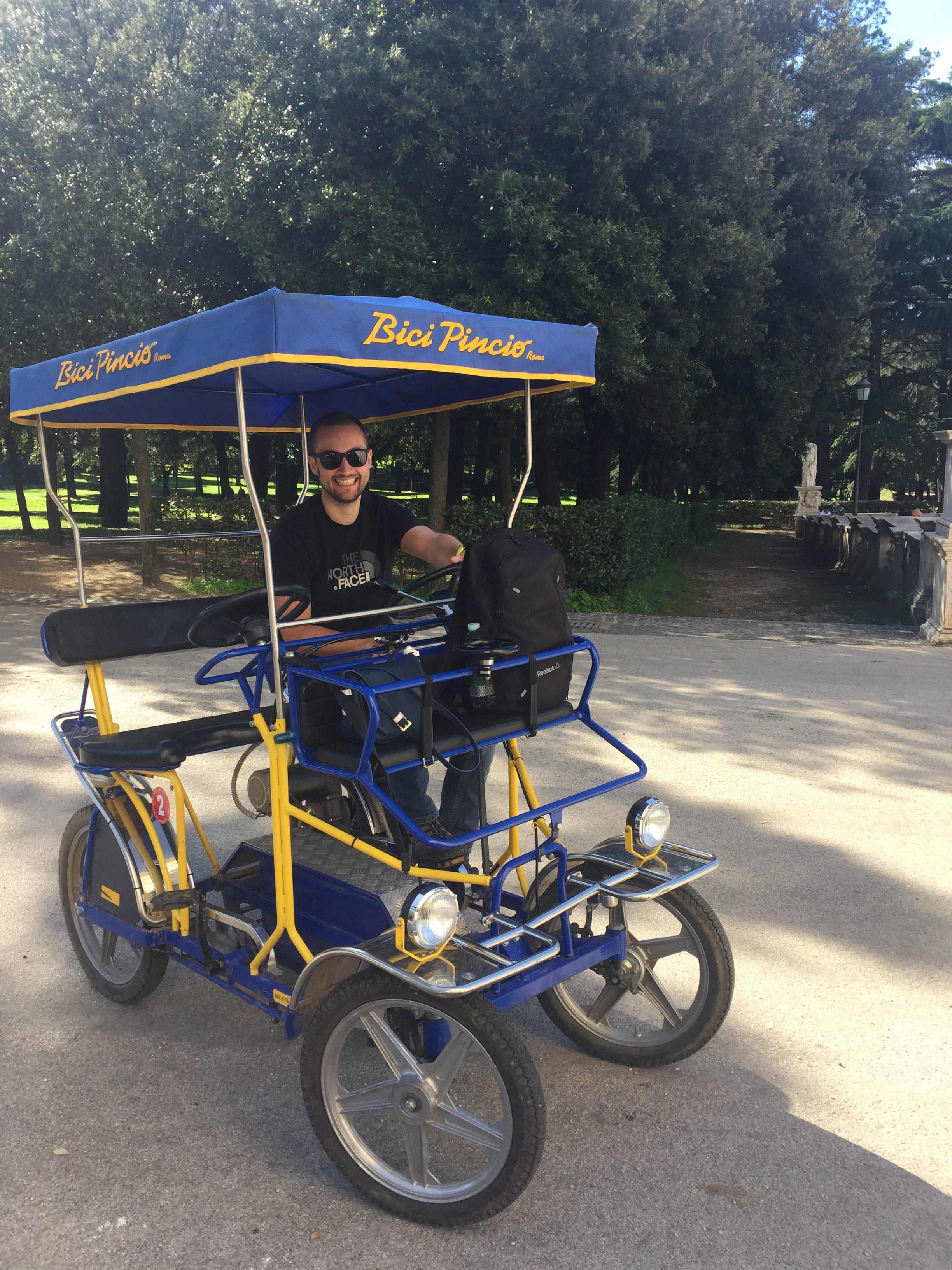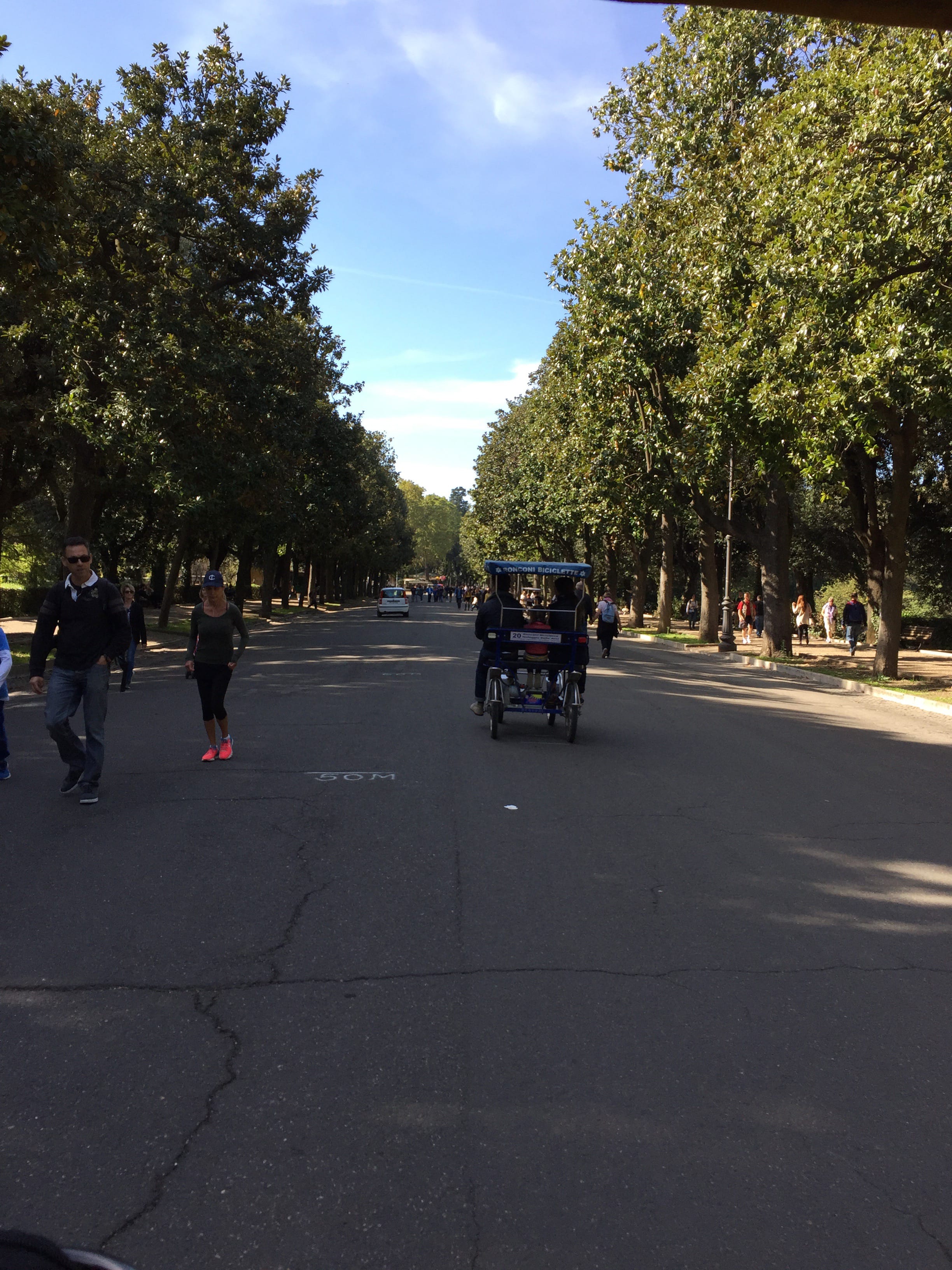 Nouvelle journée dans la capitale italienne, dernière journée entière, malheureusement. Nous décidons de compléter notre séjour, en nous concentrant sur les secteurs n’ayant pas pu être visités avant, en axant la visite sur une autre facette de la ville. En commençant par le parc de la villa Borghese, où nous arrivons après une bonne jonction de marche en sortant des transports (attention ça monte !). Devant l’étendue du parc, et surtout parce qu’elle nous tendait les roues, nous optons pour une Rosalie à assistance électrique. Petit conseil, ne faites pas toujours confiance au loueur, concernant l’activation de l’assistance. Nous nous en sommes rendus compte quand, bien lancés, nous avons failli faire marche arrière à la première montée venue dans le parc ! Heureusement, Il, avait un peu l’habitude et sentait bien que nous pédalions bien seuls…! Une fois l’assistance avec nous, la balade a pris une toute autre tournure et le parc s’est révélé être une agréable découverte, tant pour la villa Borghese que pour les diverses statues et monuments aux quatre coins de l’espace boisé, que pour le sublime panorama sur la ville depuis la terrasse du Pincio.