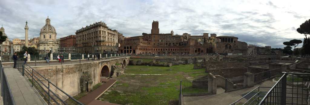 C’est sur le chemin que nous nous rendons compte à quel point l’Antiquité côtoie le monde moderne à Rome. Juste à côté d’une des artères principales de la ville, le Forum Romain siège, impassible ou presque, en contrebas. Finalement, nous comprendrons plus tard que la ville ne s’est pas construite qu’autour de ses vestiges, mais qu’époque après époque, Rome s’est construite strate après strate, en partie sur ses vestiges.