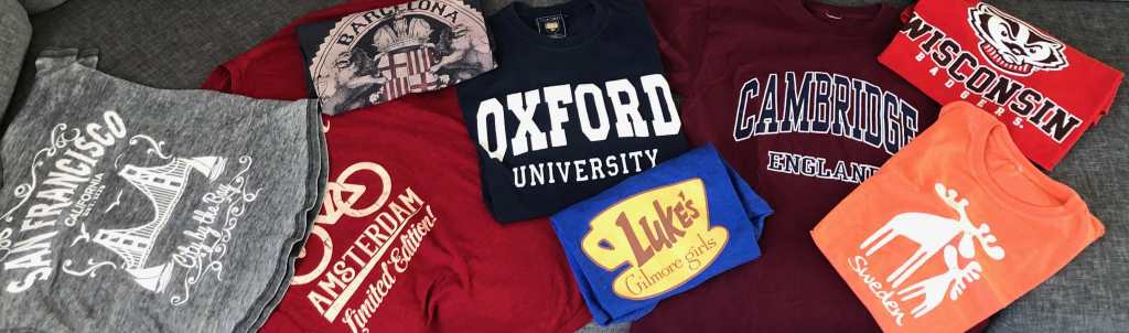 Les T-shirt ont eux-aussi marqué nos débuts ensemble, avec un achat pour Il&Elle à chaque ville traversée. Des souvenirs utiles, que l’on a longtemps portés, et que l’on porte encore aujourd’hui. Bien évidemment, nous n’avons pas fait Oxford ni Cambridge, mais nous les avons visités, et en gardons plein de bons souvenirs, alors pourquoi ne pas porter fièrement leurs couleurs de temps en temps ?