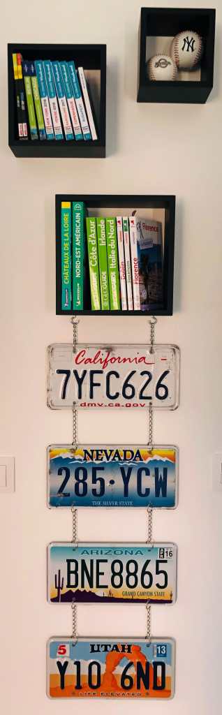 Tant que l’on parle du pays de l’oncle Sam, l’une de plus belles idées de souvenir des Etats-Unis s’est profilée sur la route 66. Nous l’avions à peine rencontrée que nous avons fait une pause dans un « Diner » typique, avec en face un magasin de souvenirs entièrement dédié à la fameuse route, dans lequel nous sommes tombés sur une collection de plaques de voitures américaines. N’ayant pas craqué à ce moment-là, nous avons réfléchi à l’opportunité que nous avions laissé s’échapper, et lors de notre pause goûter, après une bonne portion de route 66, nous avons retrouvé la possibilité d’en acheter. C’est donc pour quatre plaques, une pour chaque état traversé lors de notre voyage 2019 que nous avons craqué. Sachez en tout cas que ce n’est pas si simple que cela d’en trouver, surtout des originales ayant réellement servi, n’hésitez donc pas à vous en procurer lorsque vous en avez l’occasion si vous avez d’éventuels projets de décoration en tête. En ce qui nous concerne, elles sont aujourd’hui un souvenir central de notre maison et autant de moments rien qu’à nous gravés dans nos mémoires à chaque fois que nos yeux se posent dessus.