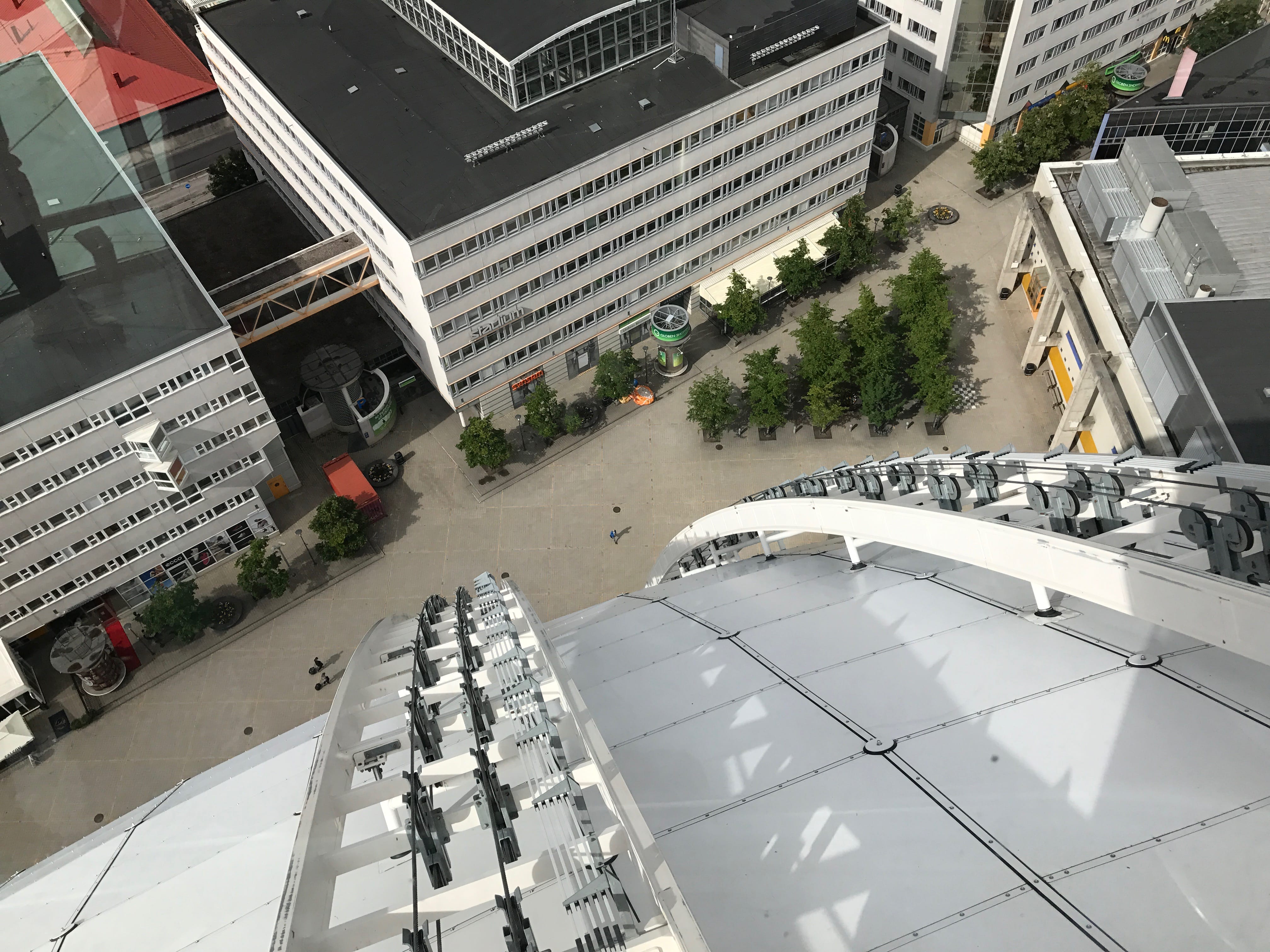 De par sa conception, le globe vous permet via un ascenseur extérieur, de grimper jusqu’à son sommet dans une bulle. Il a cela d’intelligent que, dans son fonctionnement, c’est la bulle en haut qui permet, en grande partie, à la bulle d’en bas de monter, et vice-versa lorsque la seconde bulle a atteint le sommet. Nous avons bien senti que nous nous étions éloignés du centre, les touristes se raréfiant, et le quartier étant très calme. Heureusement cela dit, parce que le nombre de places est limité et en période de forte affluence, la visite doit être bien moins facile à faire. A noter que nous avions un peu d’avance, mais que rien ne nous aura vraiment permis de tuer un peu le temps autour du globe, le quartier devant surtout vivre de cela et comportant de nombreux grands bâtiments devant être des bureaux ou des entreprises. En tout cas, la ville vue d’en haut mérite le petit tour d’ascenseur. L’expérience étant dans le pass, nous ne pouvions passer à côté, surtout parce qu’elle reste assez unique en son genre.