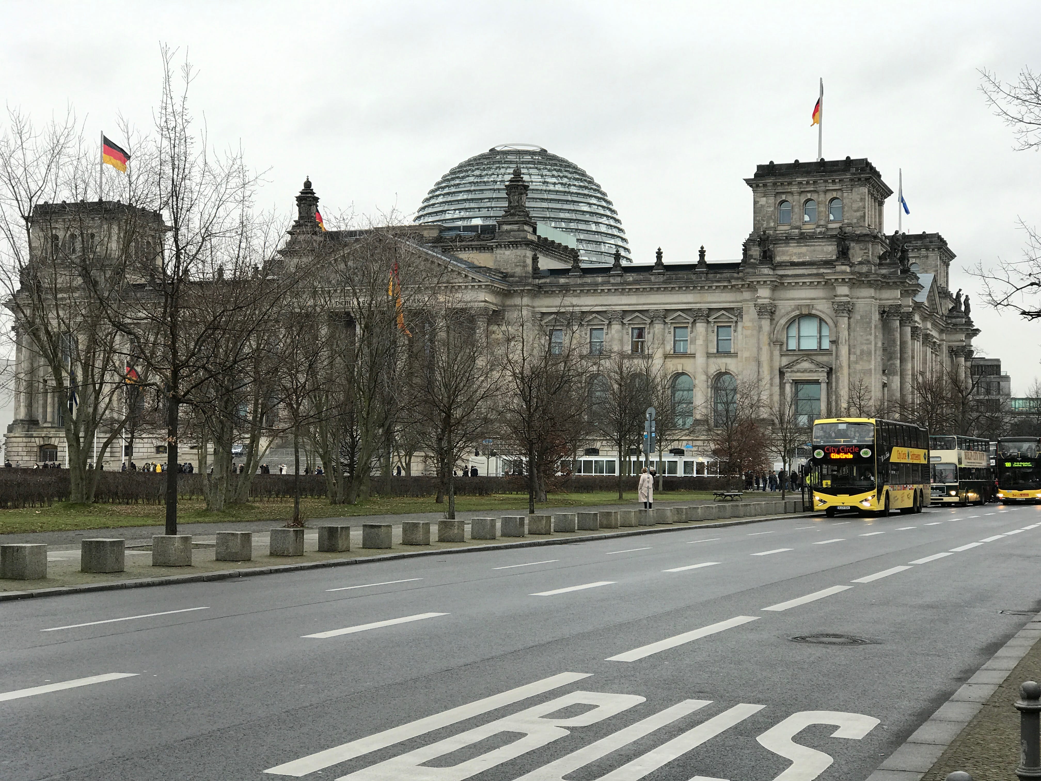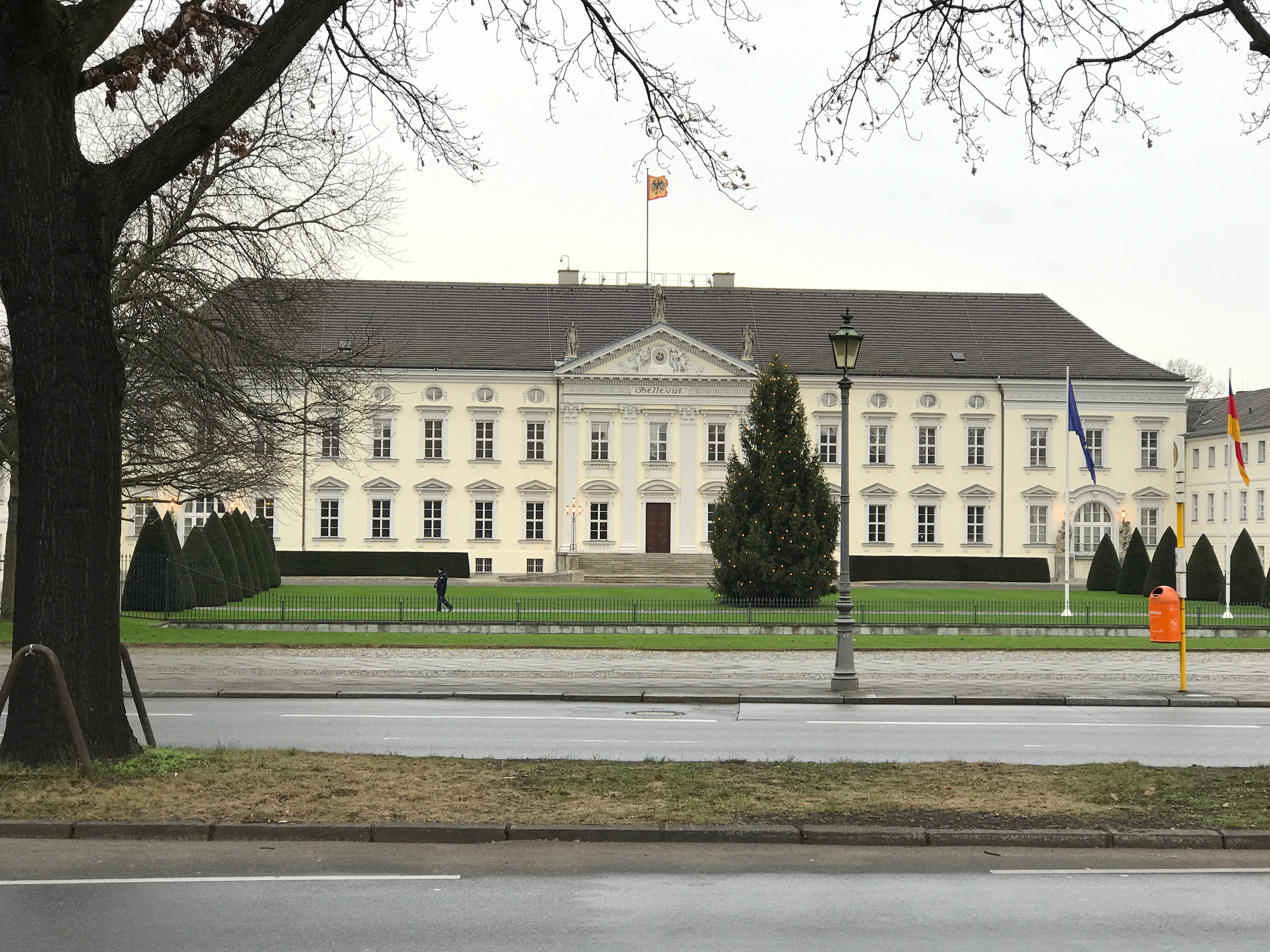 Nous remontons vers le nord jusqu’à passer devant le Château Bellevue, qui offre, quant à lui, une magnifique vue depuis ses grilles. Il n’est de toute façon pas possible d’en visiter davantage en dehors des journées de la Fête Citoyenne. Nous poursuivons donc ensuite vers l’Est jusqu’à passer devant le mémorial soviétique, imposant tant par son architecture que par les statues des soldats Russes trônant au sommet de l’arche que par les deux blindés T-34, parmi les premiers à avoir pénétré dans la ville lors de sa libération. Nous apercevions les préparatifs de la fête du passage à 2018 qui battaient leur plein sur l’avenue encore majoritairement déserte au beau milieu du Tiergarten, et le moins que l’on puisse dire c’est que la fête promettait d’être belle. Juste après un second passage sous la porte de Brandebourg, après avoir pu prendre un cliché du Palais du Reichstag de jour, nous avons repris les transports pour aller jusqu’au Centre de documentation du mur de Berlin.