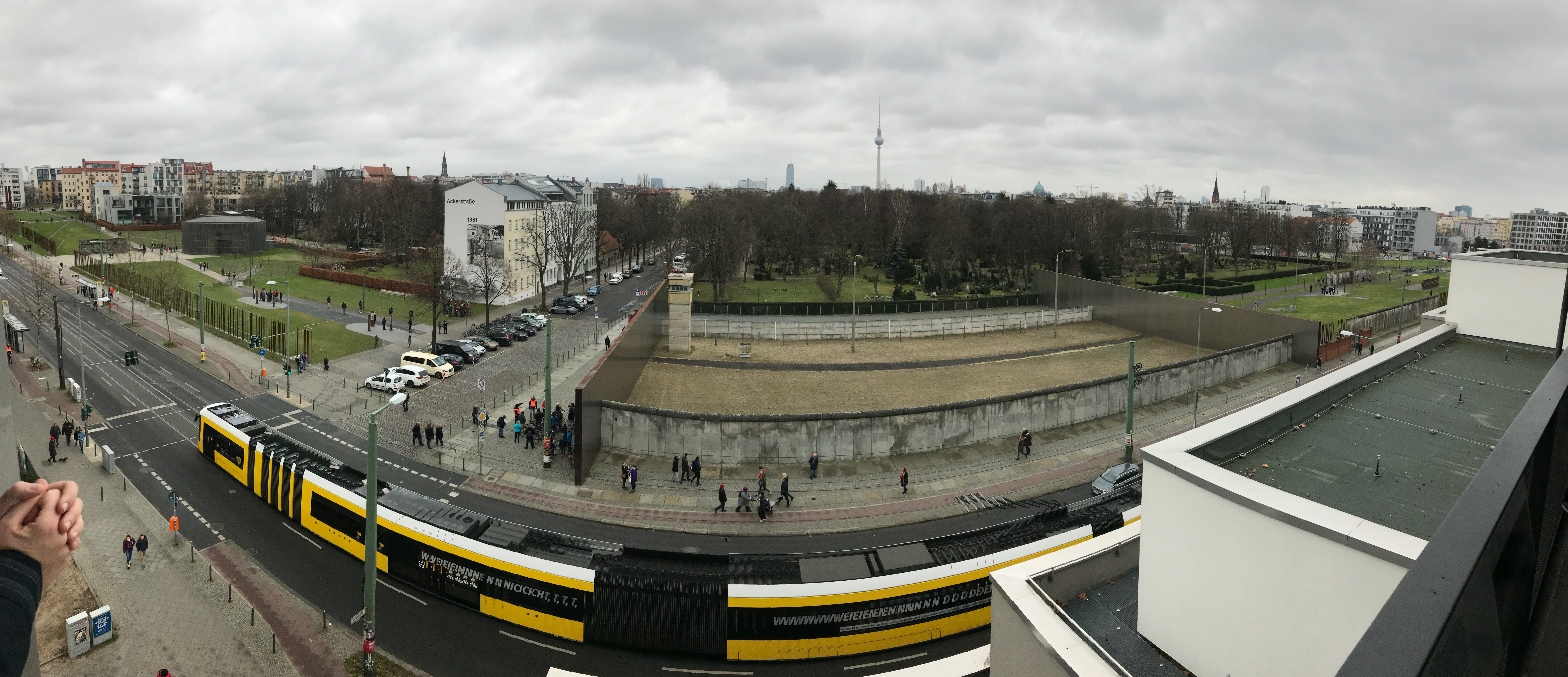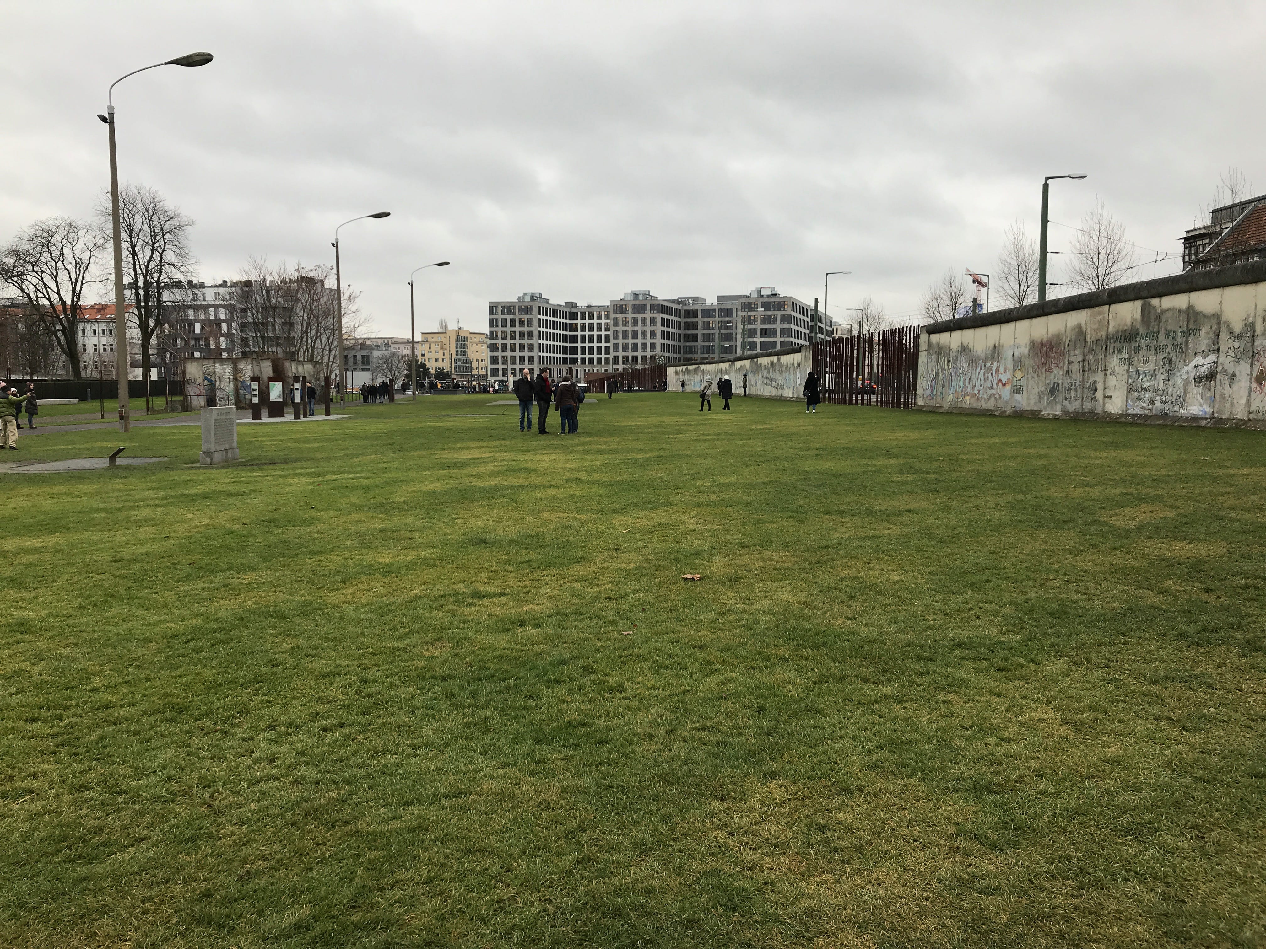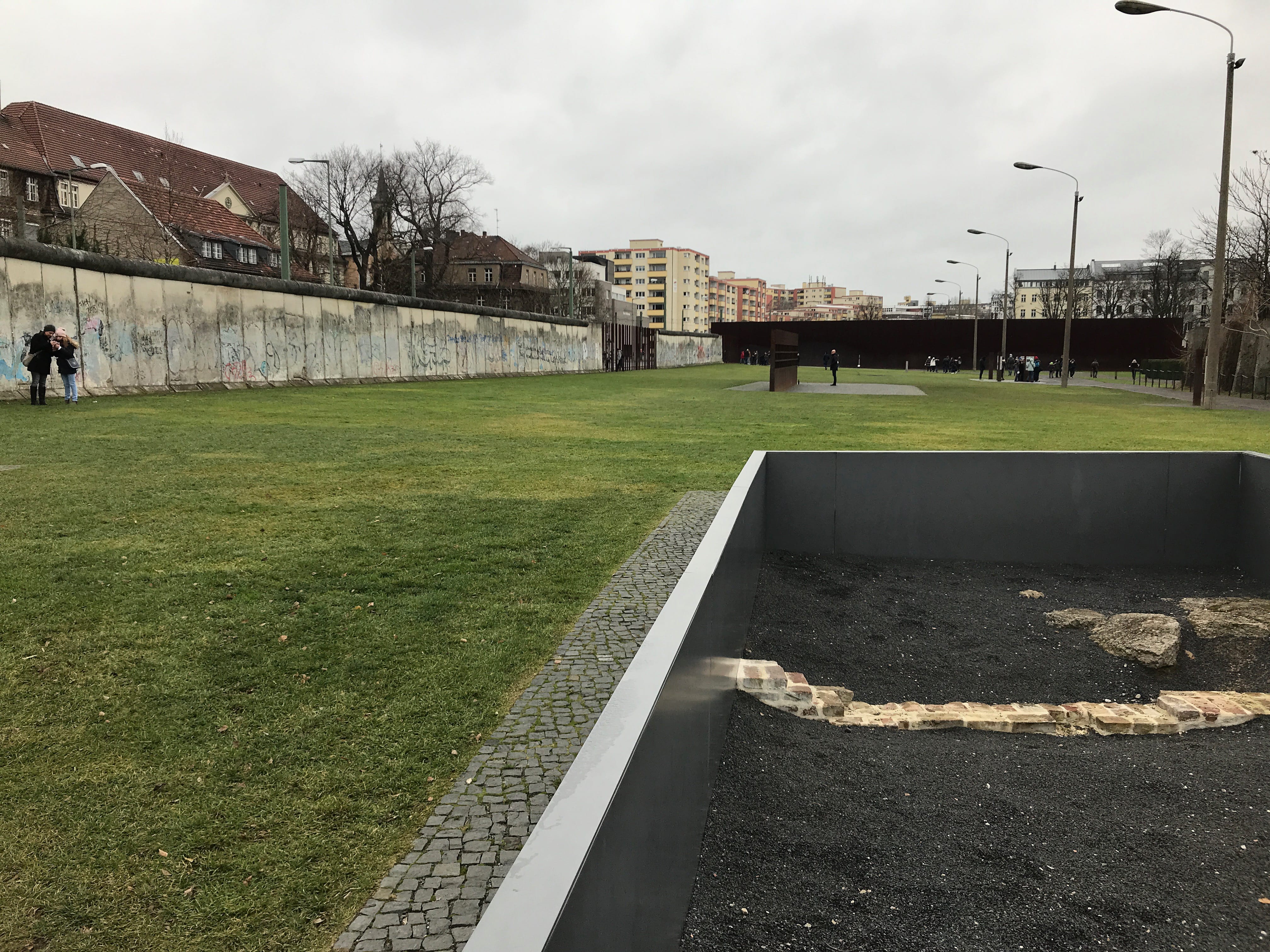 C’est à cet endroit qu’un tronçon complet du mur est conservé. On y retrouve le no man’s land séparant les deux murs, intérieur et extérieur, ainsi que les pylônes d’éclairage et le chemin de ronde. Cet ensemble permet de se rendre compte de ce qu’était la partition de la ville dans les années 1980. Face à ce pan de mur, il est possible d’arpenter les niveaux superposés du centre de documentation qui offre, d’ailleurs, au dernier étage de sa plateforme extérieur une vue imprenable sur ce qu’il reste du mur. La visite du centre mérite également quelques minutes de votre temps car sans elle, difficile de bien appréhender ce que pouvaient vivre les Berlinois à cette époque. Le tronçon conservé se poursuit d’ailleurs au delà par une représentation plus artistique de la ligne du mur, elle est ainsi visible directement depuis votre sortie du métro situé non loin lorsque vous arrivez du centre.