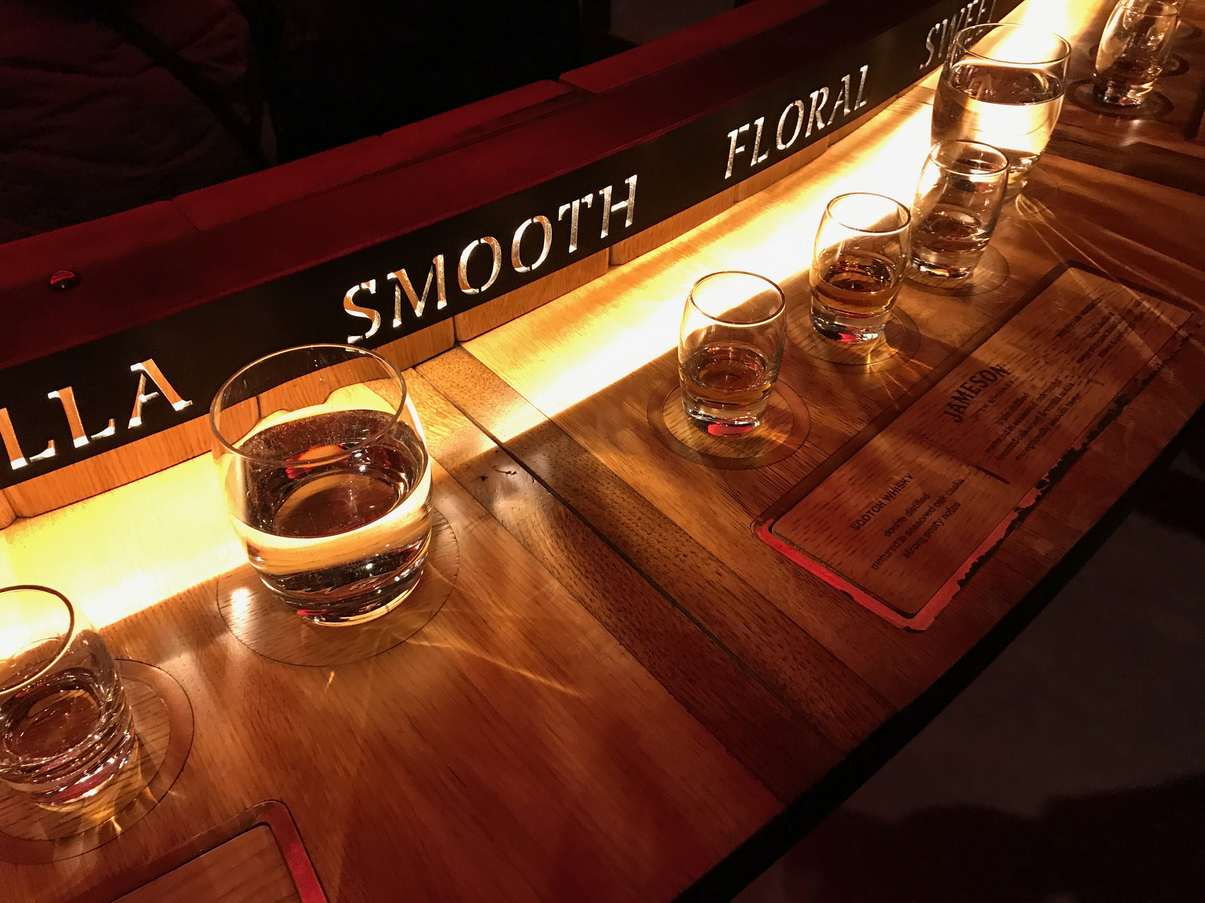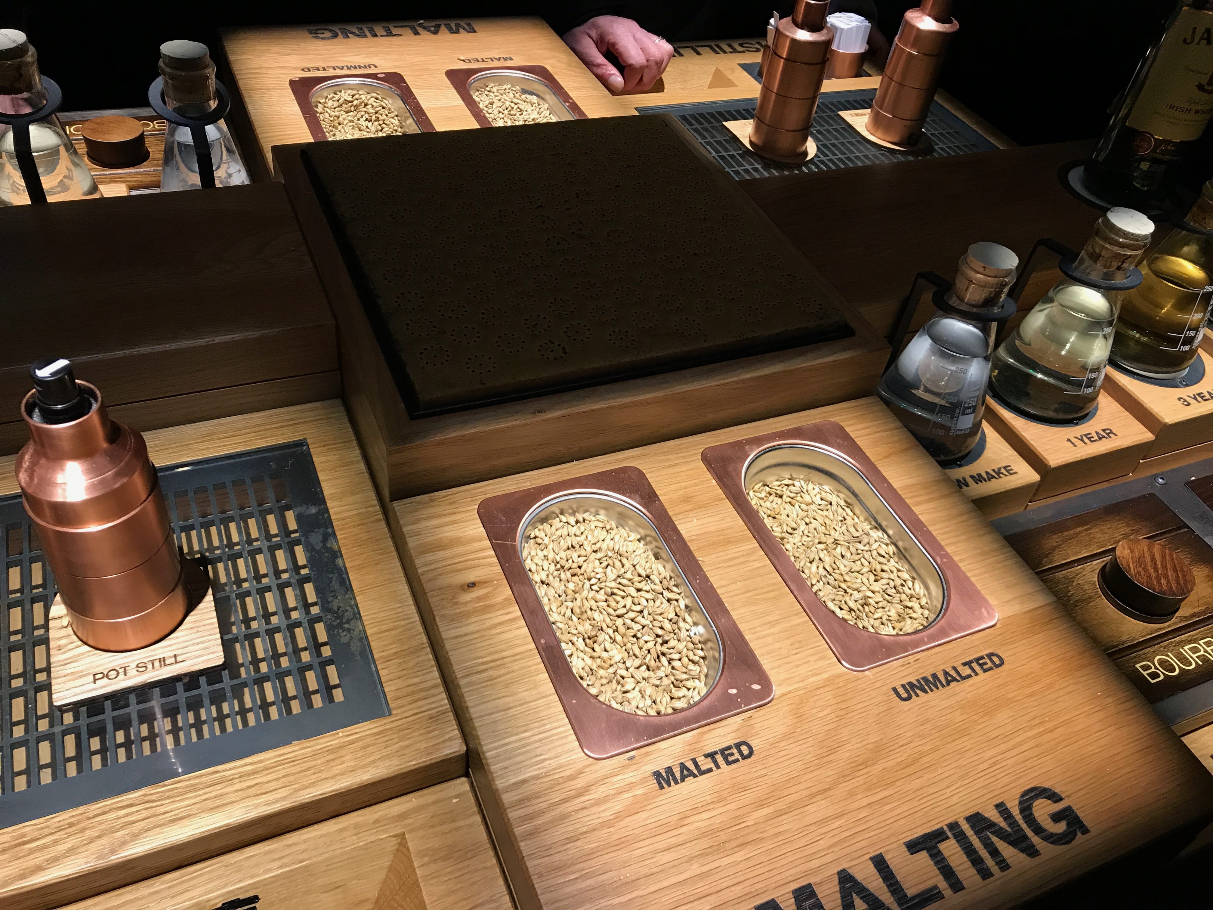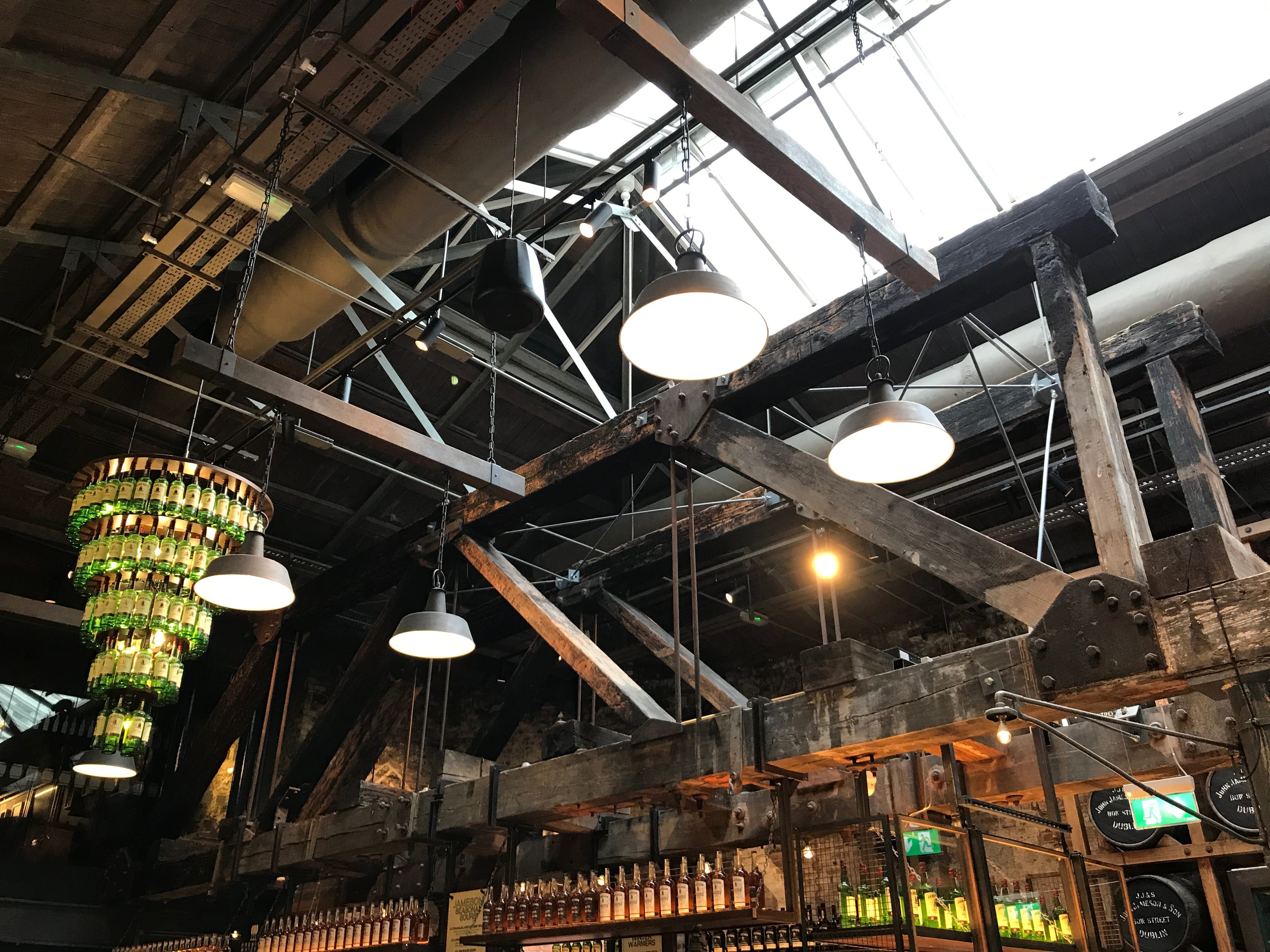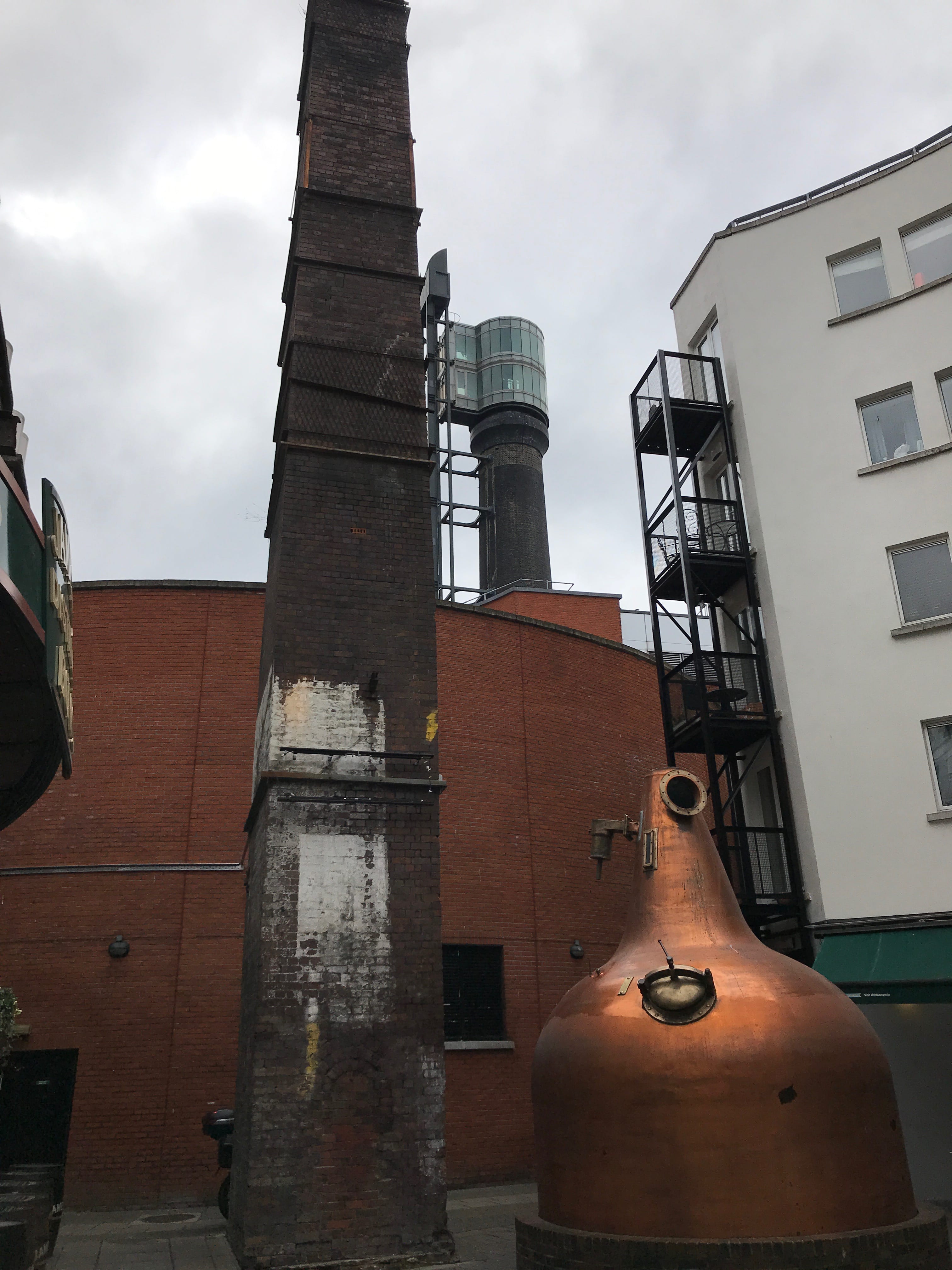 Il est maintenant l’heure en ce début d’après-midi de nous diriger vers l’une des visites qu’Il, attendait avec impatience : la Distillerie Jameson. Cette maison du whisky, vieille de plus de 200 ans, produisait son whisky à Dublin jusqu’en 1971, avant de le délocaliser en périphérie. Dès l’entrée, l’alambic et l’impressionnante cheminée nous mettent dans l’ambiance. Le site de Bow Street permet, grâce à une visite guidée de découvrir les quelques secrets qu’ils veulent bien révéler de la fabrication de ce spiritueux. La visite commence par un film sur l’histoire de John Jameson et la naissance de son whisky avant de découvrir les alambics et les cuves qui ont jadis servis à la production de la fameuse boisson. Ensuite, nous sommes guidés dans une salle à l’ambiance tamisée, où chacun se place devant une table présentant les ingrédients utilisés, et dans laquelle le guide nous en dit un peu plus sur les origines et les choix faits par l’entreprise pour obtenir le goût particulier qui définit leur marque. L’expérience que nous avions choisie nous emmenait ensuite dans une salle très théâtralisée, où nous étions invités à goûter et comparer différents whiskys pour bien comprendre l’importance de la triple distillation du Jameson (il faut bien donner un argument de vente avant le passage par la boutique souvenir !). Elle, ne buvant pas, Il, fera la dégustation, pour deux, tout seul, même si quand même accompagnés de nos voisins de visite, dont certains avaient très soif. Le billet inclus dans le Dublin Pass donne également droit à un verre, offert par la maison, de leur plus grand classique. Etant un peu trop en avance par rapport à l’heure de notre visite initiale, Il, aura choisi de profiter de ce bonus avant de la débuter. Pour conclure sur cette visite, nous dirions qu’elle était probablement trop axée sur la publicité du whisky que sur sa fabrication, et le côté commercial était trop présent pour que celle-ci soit complètement plaisante. Le lieu reste néanmoins mythique et l’aura bien entretenue par la décoration et les dégustations.
