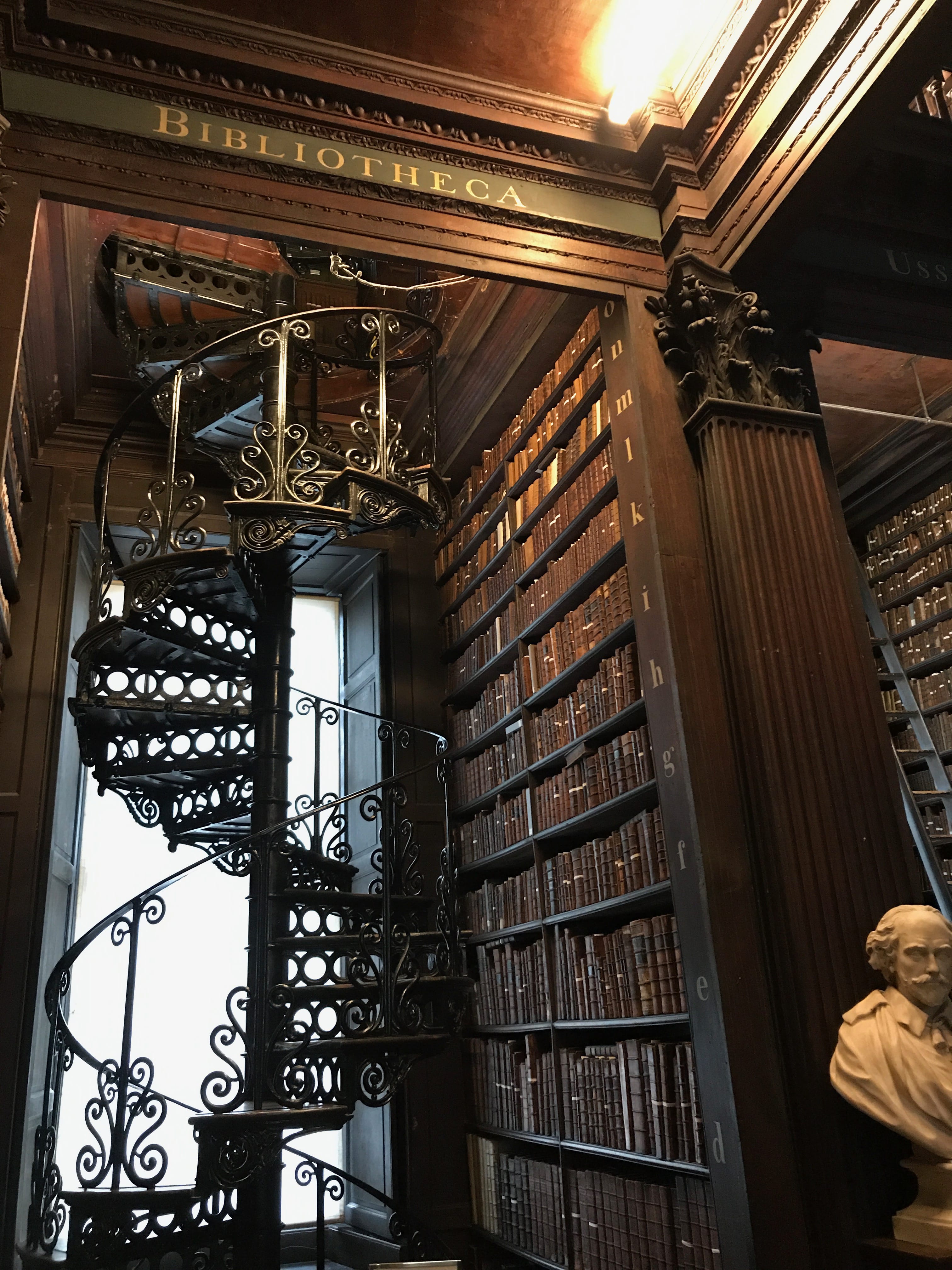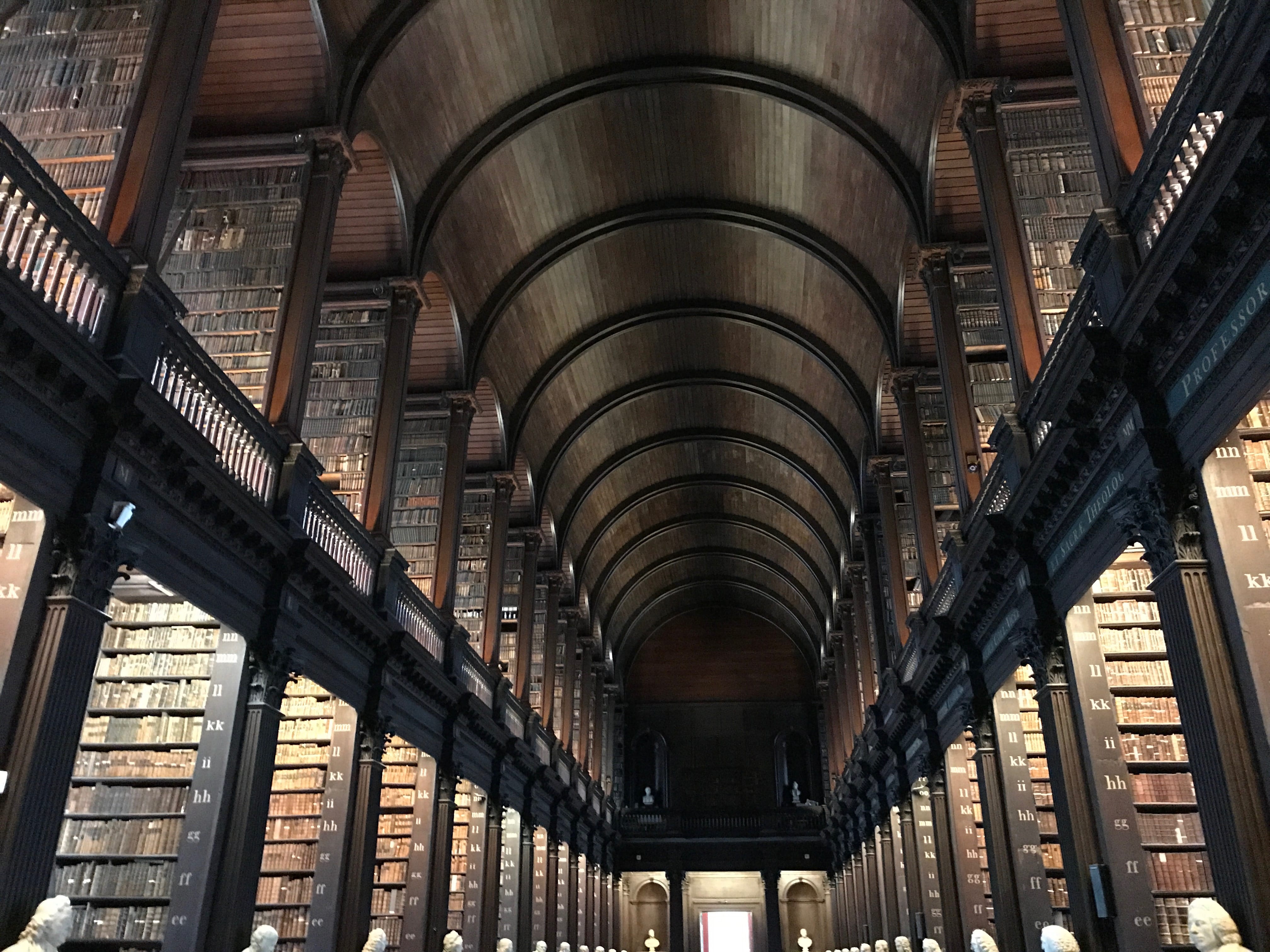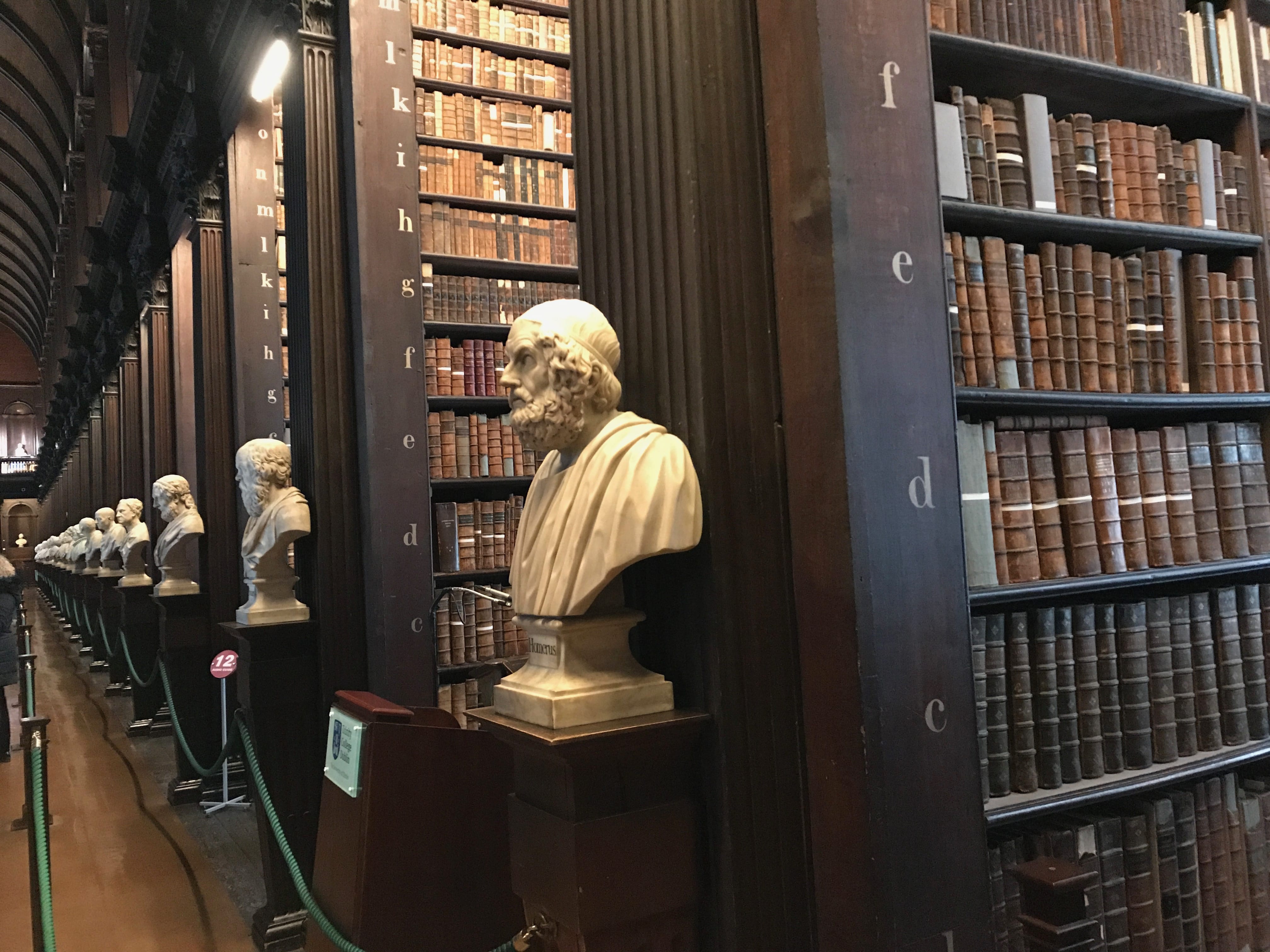 Afin de compenser un peu notre déception, nous nous sommes ensuite rendus à la célèbre bibliothèque du Trinity College, dont nous ne doutions pas cette fois de la beauté. Les photos ne rendent pas assez justice à la grandeur et à la richesse du lieu. Les bâtiments extérieurs, les différents bustes des grands auteurs et la sublime harpe exposée, valent également le coup d’œil. C’est également le lieu où est entreposé le Livre de Kells, manuscrit illustré réalisé par des moines de culture celtique aux alentours de l’an 800. Il est considéré comme un chef d’oeuvre du christianisme irlandais et reste l’un des plus précieux héritages médiévaux existants. Si l’on peut avoir du mal avec le côté spirituel, il faut reconnaître que toute l’exposition gravitant autour ainsi que les pages exposées sont indubitablement superbes.