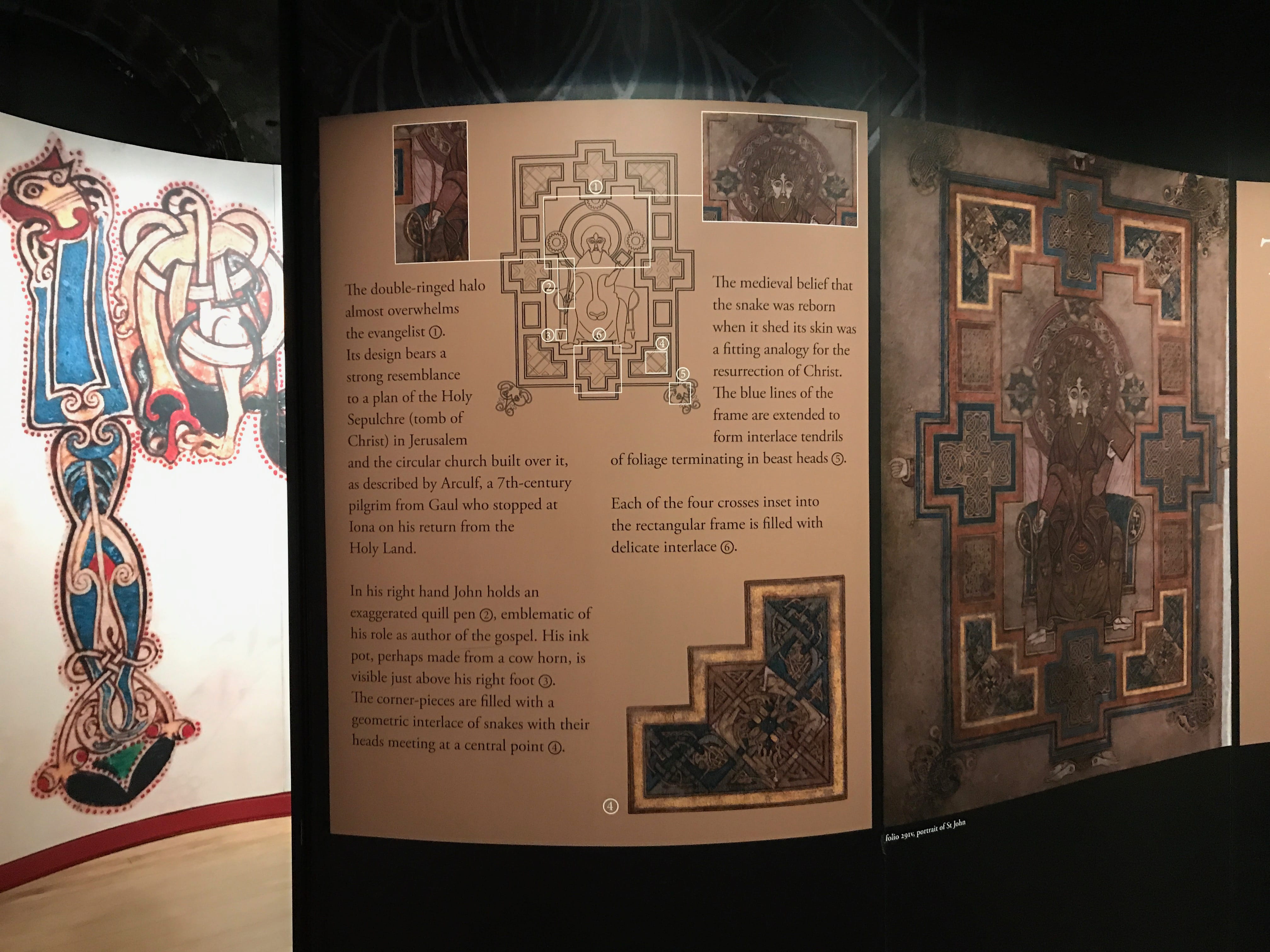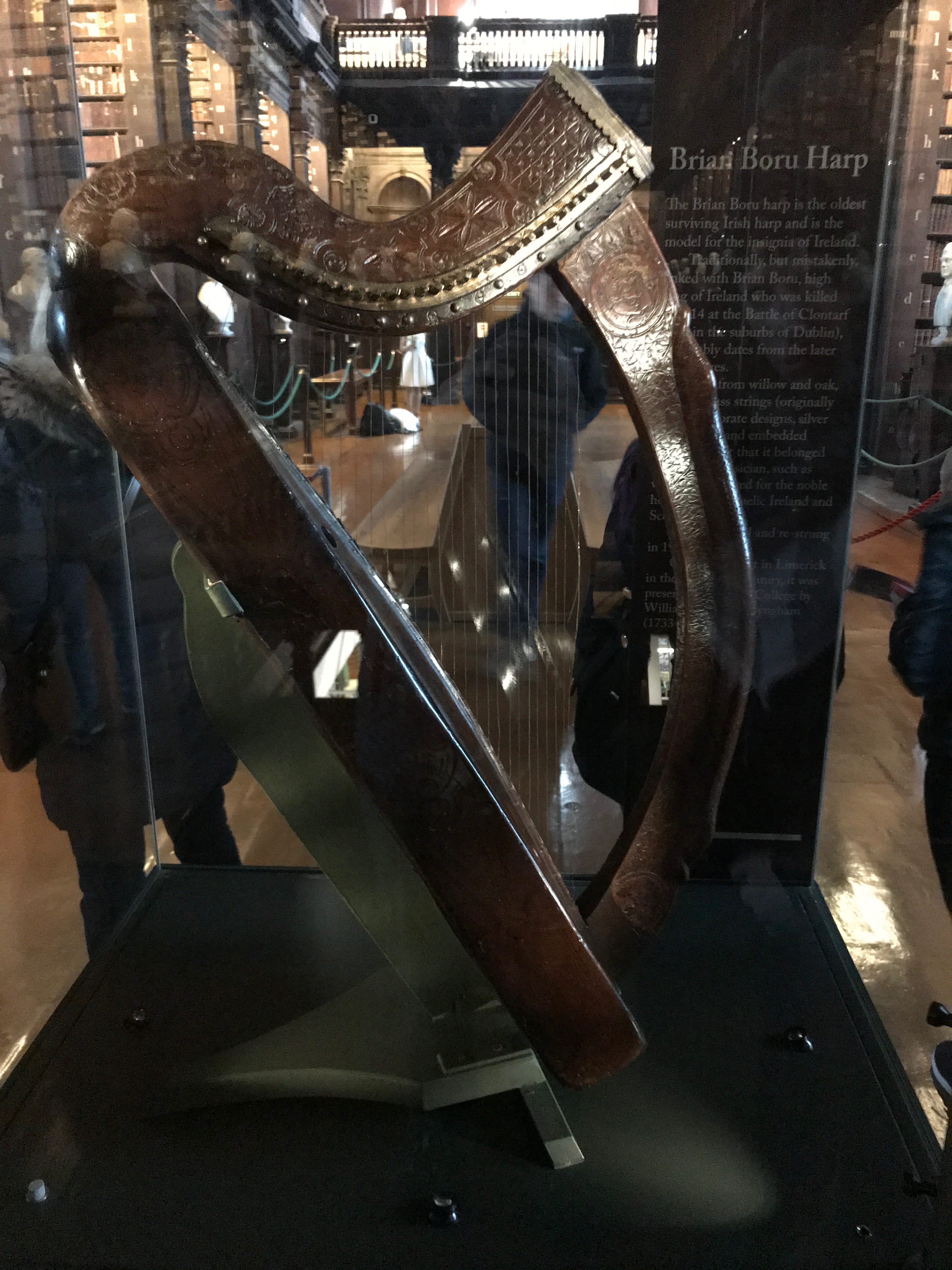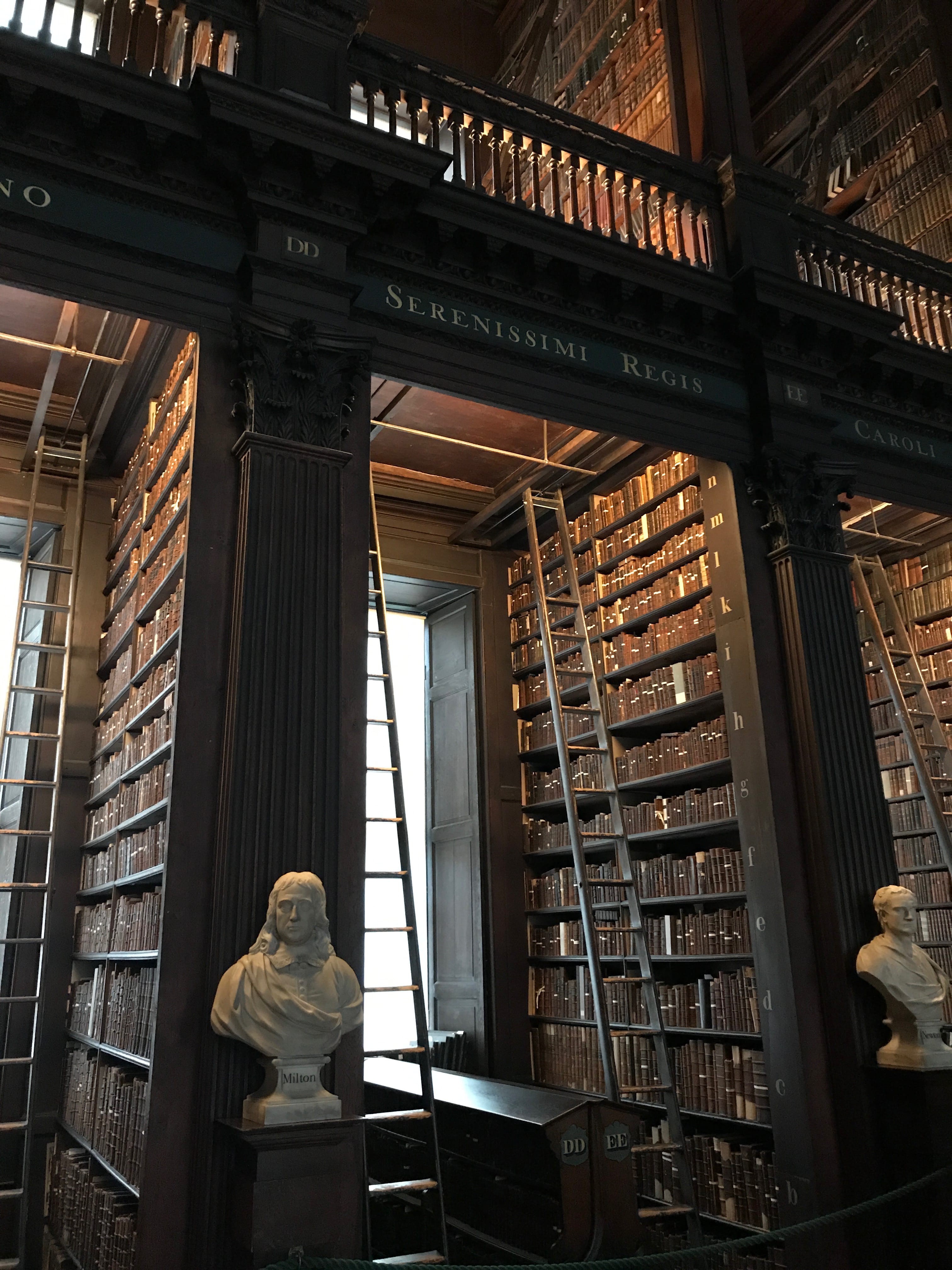 Afin de compenser un peu notre déception, nous nous sommes ensuite rendus à la célèbre bibliothèque du Trinity College, dont nous ne doutions pas cette fois de la beauté. Les photos ne rendent pas assez justice à la grandeur et à la richesse du lieu. Les bâtiments extérieurs, les différents bustes des grands auteurs et la sublime harpe exposée, valent également le coup d’œil. C’est également le lieu où est entreposé le Livre de Kells, manuscrit illustré réalisé par des moines de culture celtique aux alentours de l’an 800. Il est considéré comme un chef d’oeuvre du christianisme irlandais et reste l’un des plus précieux héritages médiévaux existants. Si l’on peut avoir du mal avec le côté spirituel, il faut reconnaître que toute l’exposition gravitant autour ainsi que les pages exposées sont indubitablement superbes.