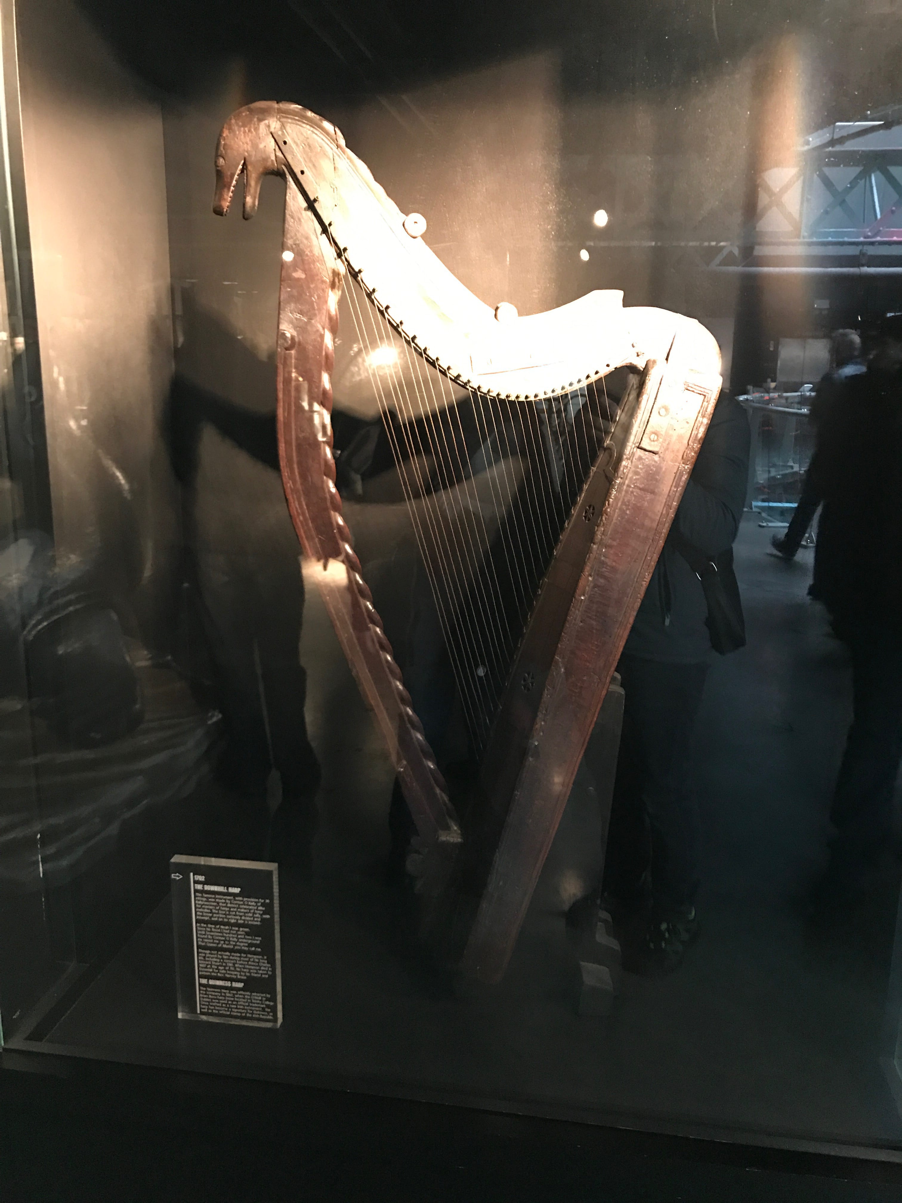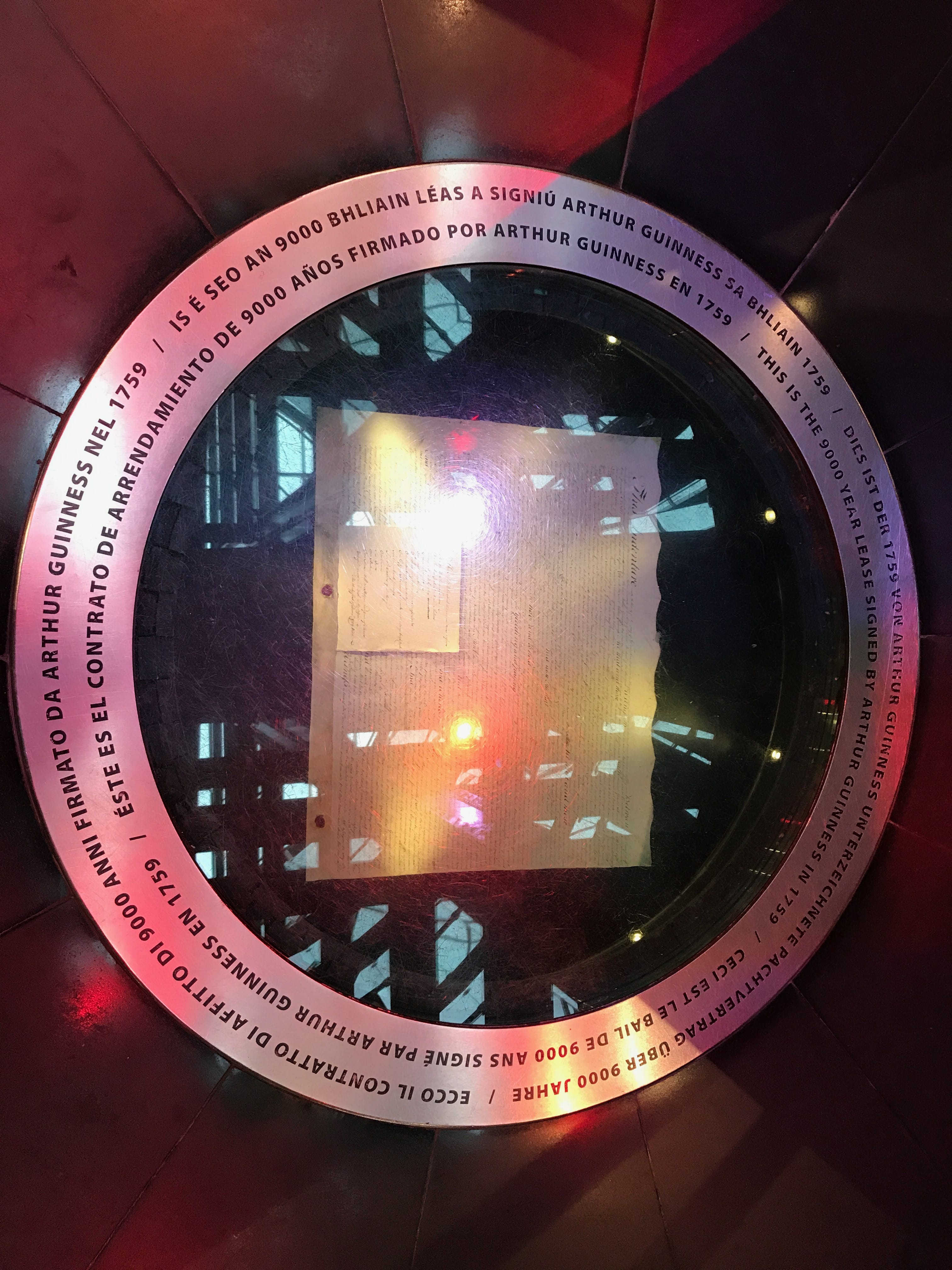 Au premier niveau sont présentés les tonneaux et leur importance dans le transport de la célèbre bière brune. Mais avant de la transporter, il faut la produire. Au deuxième niveau, ce sont les sens qui sont mis en éveil. Les arômes et goûts clés de la Guinness y sont présentés avant, pour les plus patients, de proposer une expérience dans la Velvet Room afin d’apprendre aux visiteurs comment la déguster, pour en apprécier toutes les subtilités, dans de mini-verres de la marque. Le troisième étage est, quant à lui, consacré à la publicité et à toutes les campagnes, plus ou moins connues, qui ont participé à sa renommée mondiale. En ce qui nous concerne, nous ne nous sommes pas attardés au quatrième niveau : l’Académie Guinness qui permet de se servir sa propre pinte grâce aux conseils avisés des serveurs. La faim nous tiraillant, nous préférerons nous rendre au cinquième étage pour nous restaurer au Arthur’s Bar. Des plats traditionnels y sont proposés et certains même agrémentés de Guinness comme exhausteur de goût. C’est à ce moment également qu’Il, choisira de profiter de la pinte incluse dans le billet d’entrée. La visite se termine par un passage au septième étage, où se trouve le Gravity Bar, bien plus chargé que la salle où nous avons mangé. Ce niveau offre une vue panoramique à 360° sur la ville et la possibilité de boire un verre en l’admirant. Avant de quitter la Brasserie, nous passerons par la boutique de souvenirs et devant le bail de location de 9000 ans (rien que ça !) signé par Arthur Guinness en 1759 !