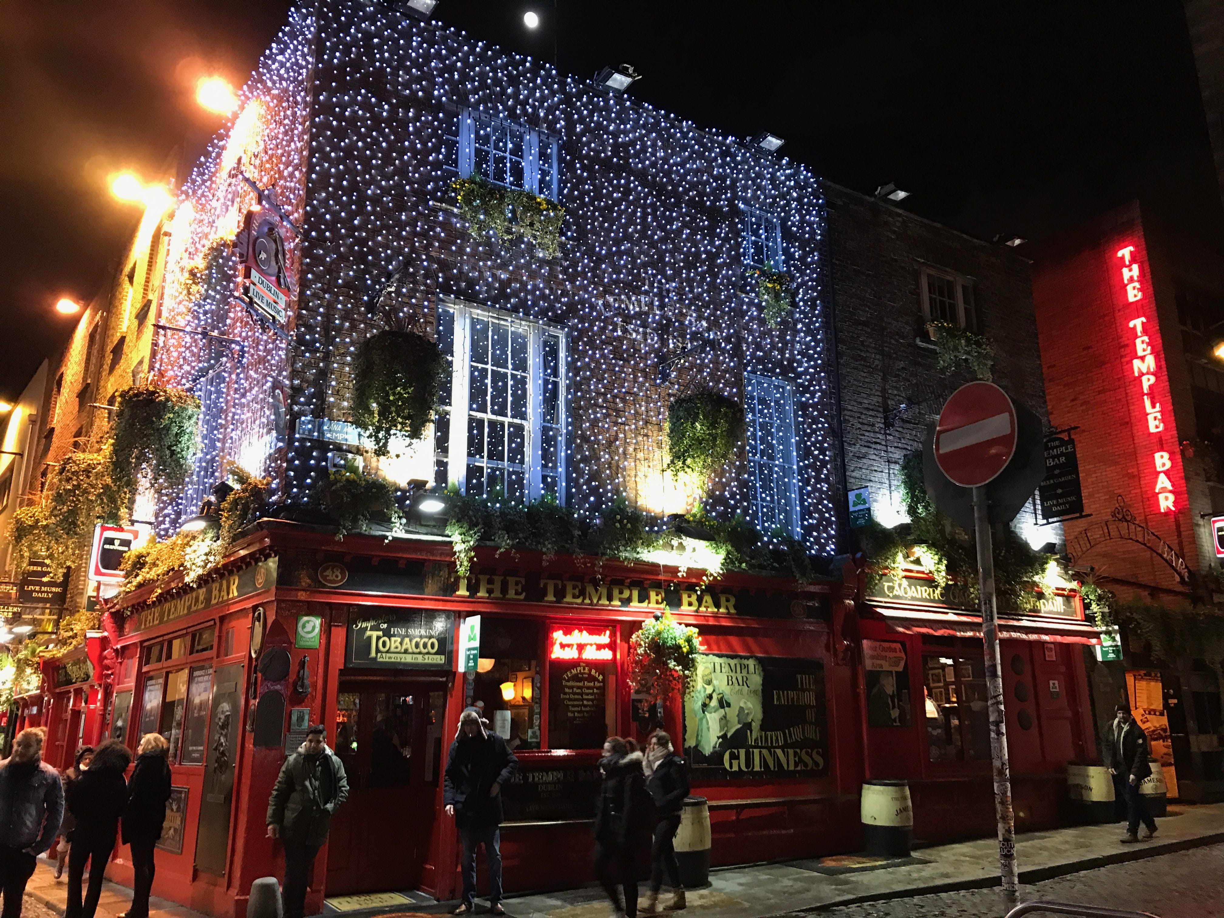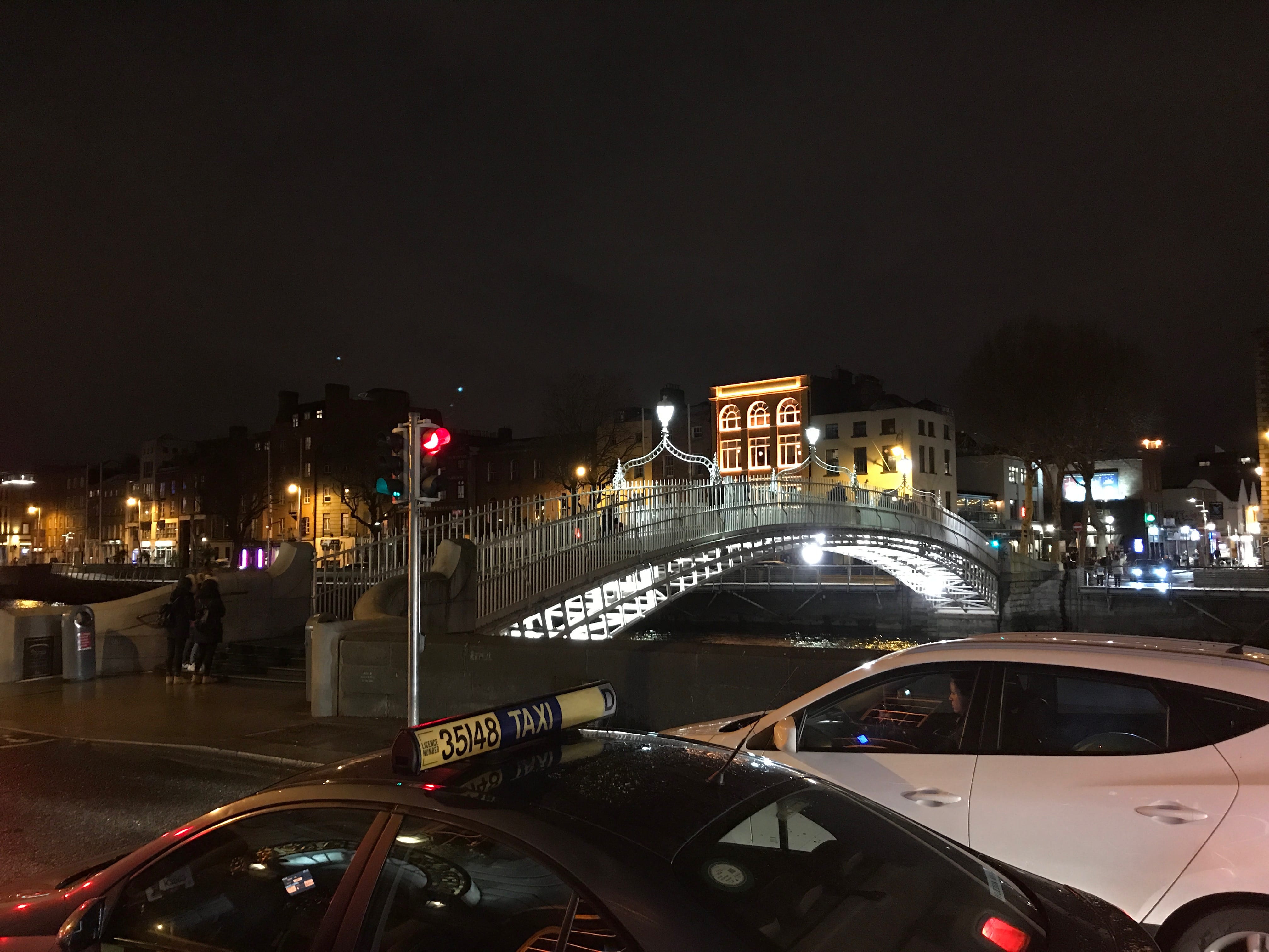 Finalement de retour à Dublin en pleine nuit, malgré l’horaire pas si avancé, nous nous sommes rendus devant le célèbre Temple Bar même si, épuisés comme nous l’étions et peu fêtards comme nous le sommes toujours, nous avons préféré ne pas y entrer et profiter d’une soirée plus calme. Nous aurons pu également admirer à proximité du Ha’Penny Bridge, pont datant de 1816, édifié en fonte, et qui rejoint les deux rives de la Liffey River.