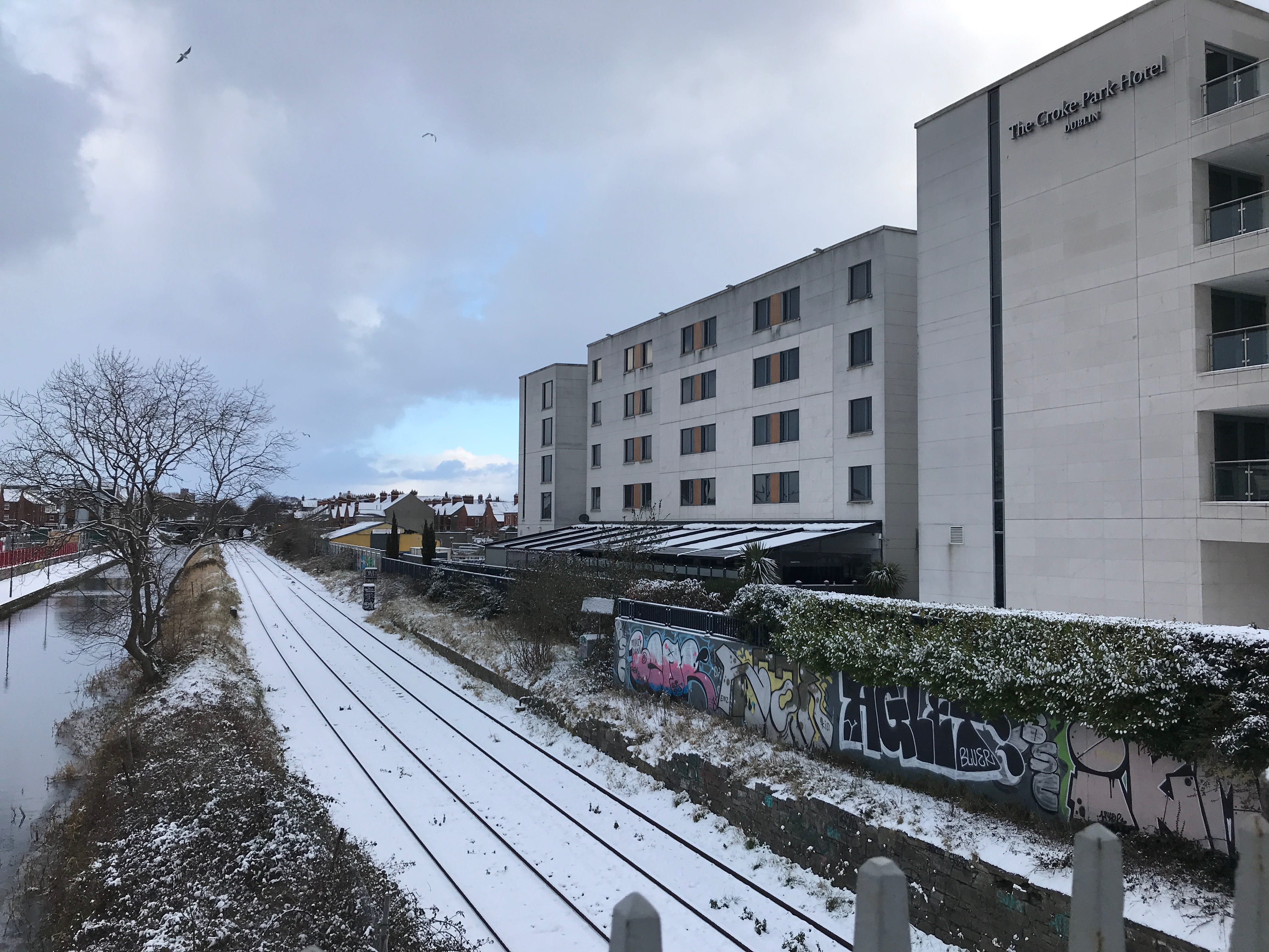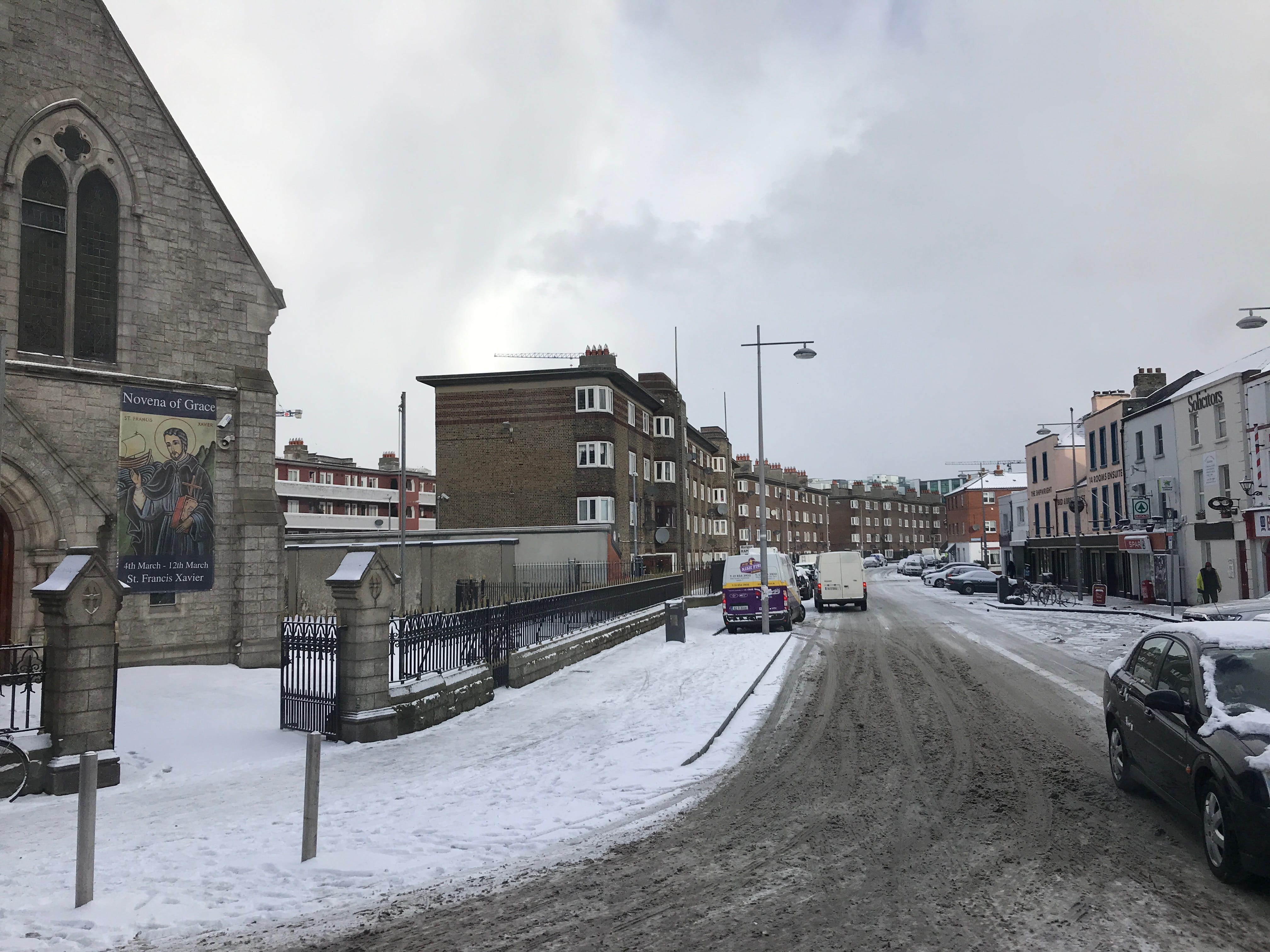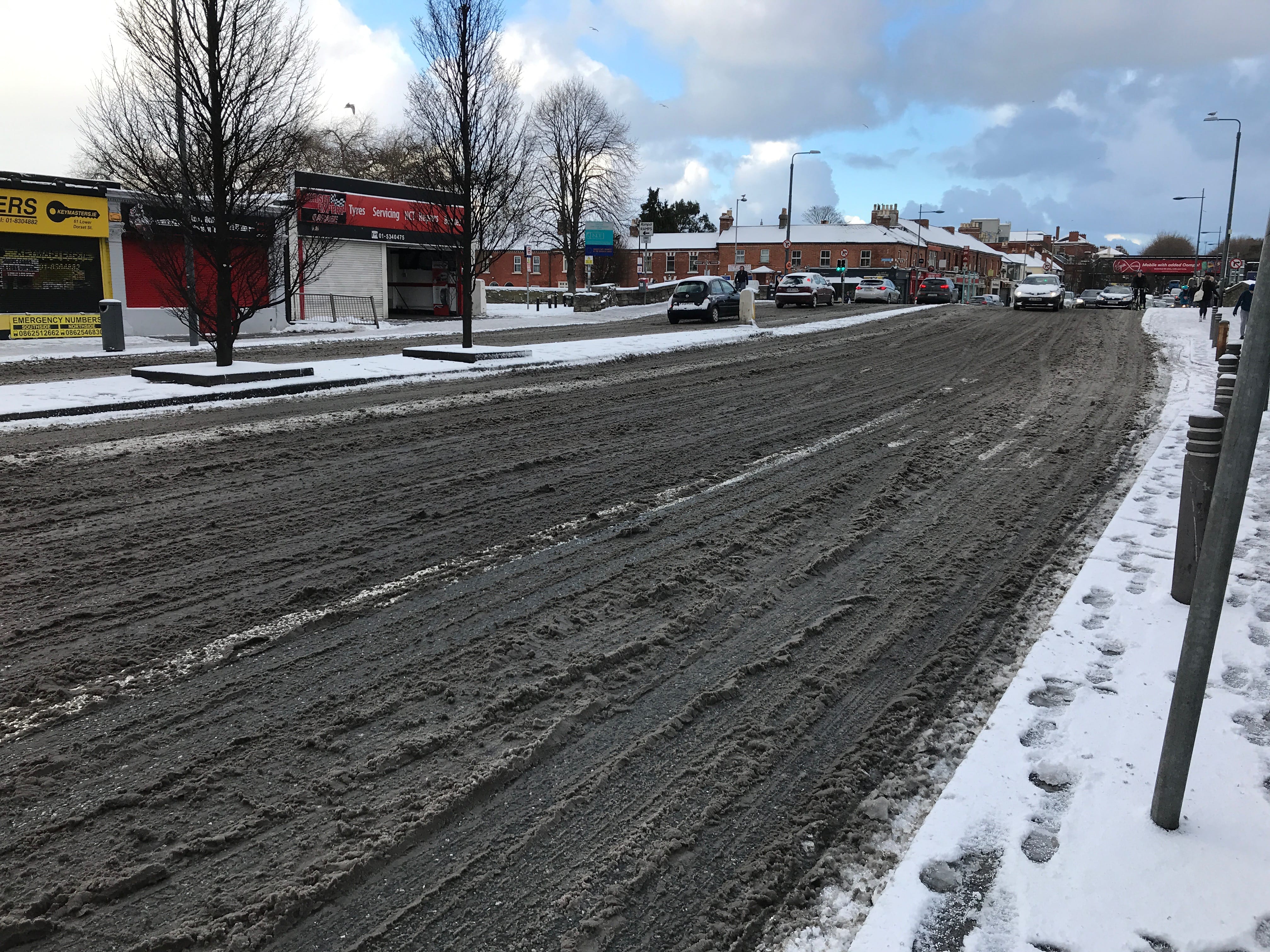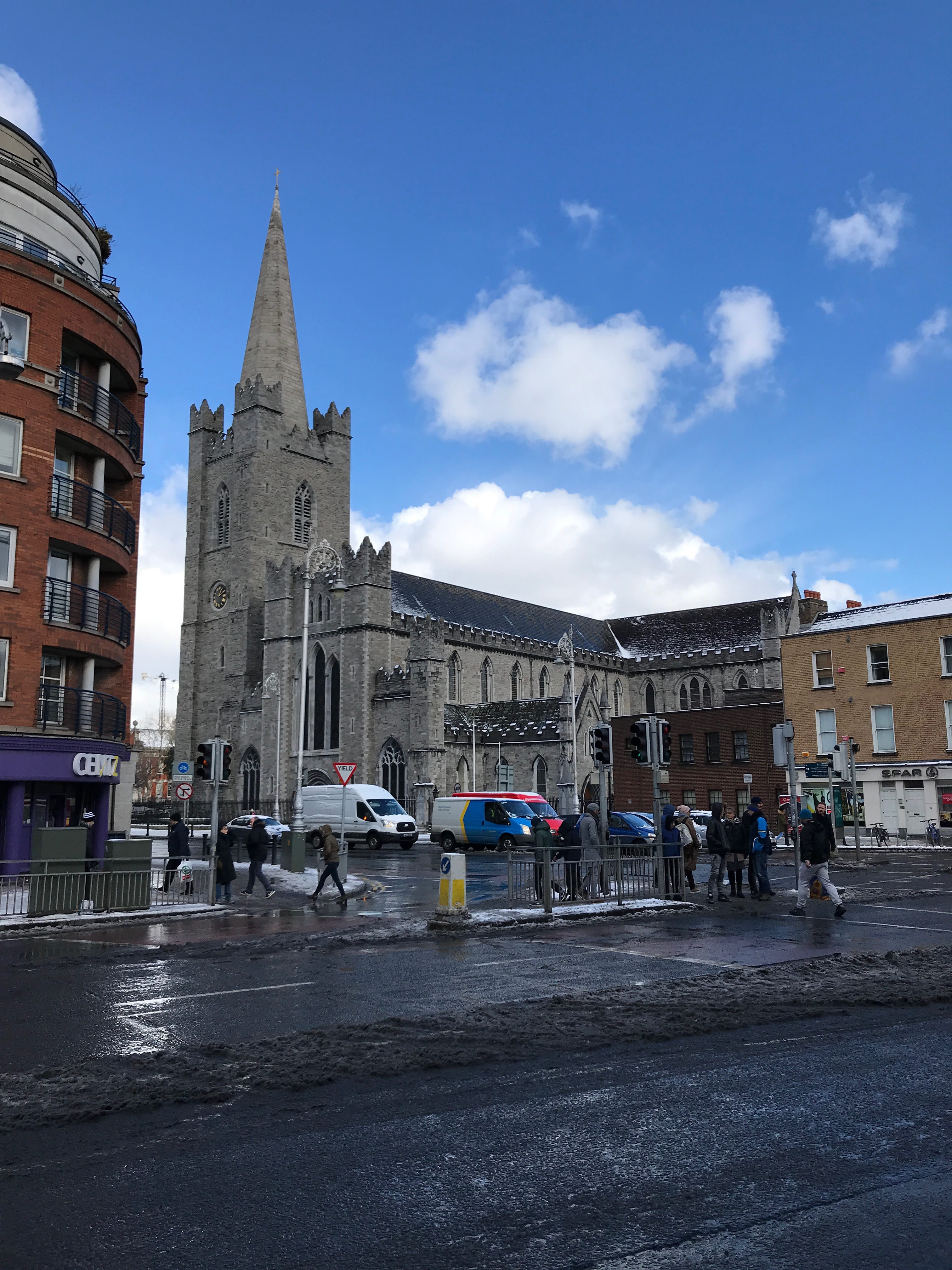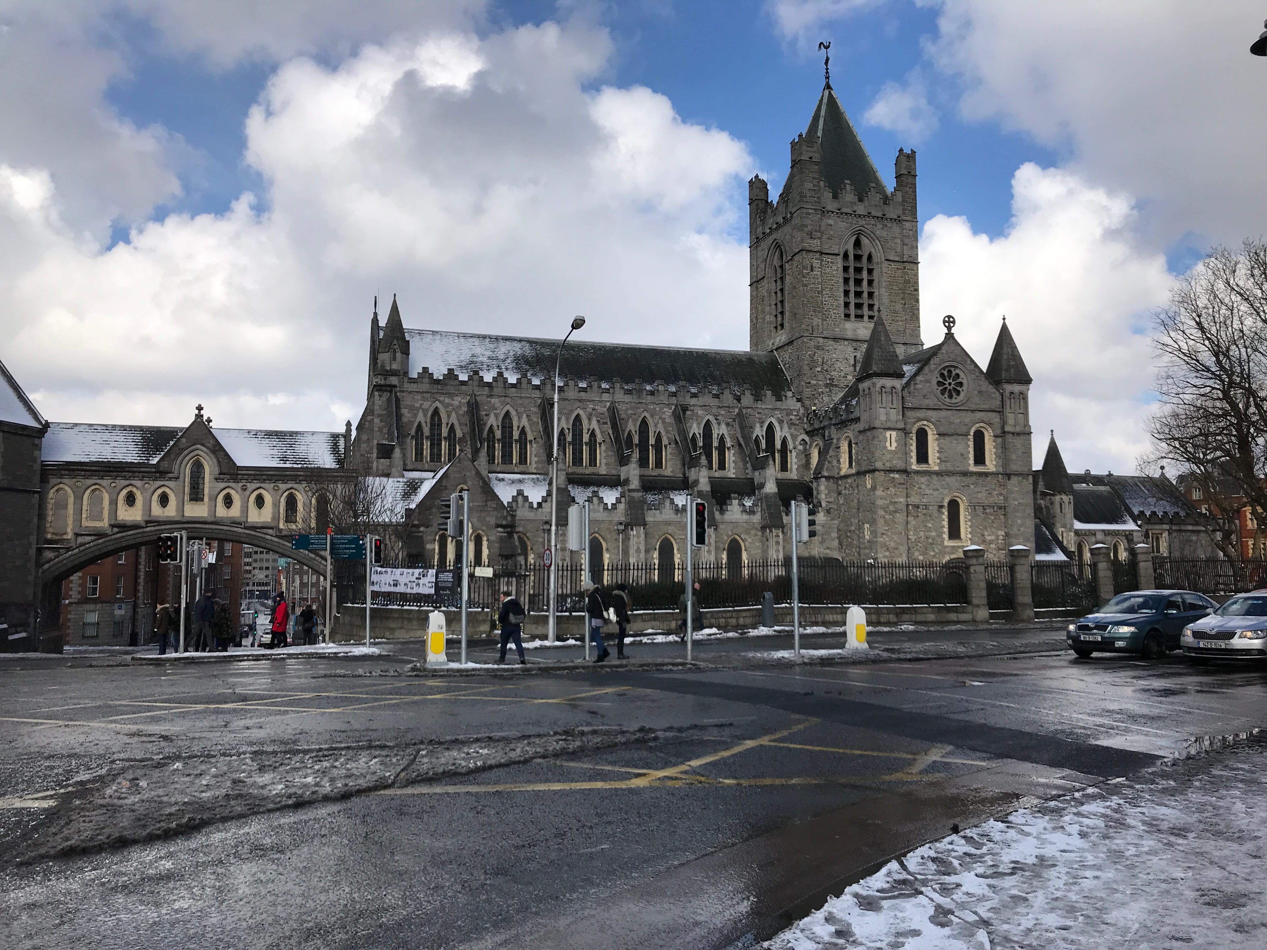 Vous vous souvenez de la surprise de la dame voyant la neige pendant la journée d’hier? Et pour cause ! Dublin est une ville côtière, qui ne connait pas la neige, et ne sait pas y faire face. Tout a commencé au petit matin, alors que l’on trouvait qu’il faisait assez froid et clair dans notre chambre. Quand nous avons ouvert les rideaux, nous nous sommes rendus compte que la rue avait revêtu son manteau d’hiver. En sortant de notre hôtel, en ce dernier jour, nous avons été surpris par l’état des routes. Le déneigement là-bas, ils ne connaissent pas et le sel non plus ! Ils n’ont ni le matériel ni les compétences adéquates pour gérer un phénomène qui s’est avéré d’une grande ampleur. Car pendant la nuit, ce ne sont pas de petits flocons qui sont tombés mais plusieurs centimètres de neige et d’autres à venir, et qui s’apprêtaient à paralyser la ville.