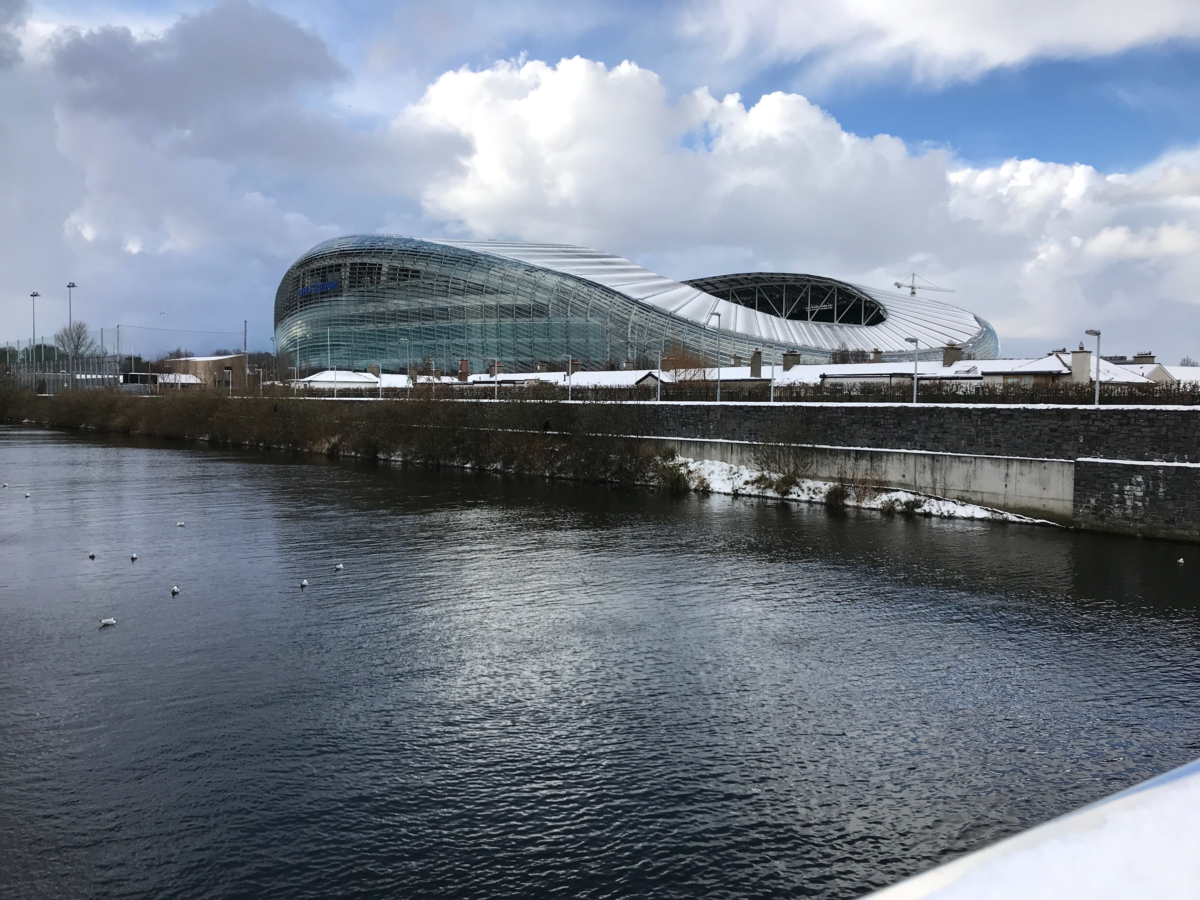 La progression jusqu’à l’arrêt de bus fut compliquée, mais ce n’était que le début. Nous cherchions à trouver une station de DART, afin de nous rendre au Aviva Stadium, pour en faire la visite comprise dans notre Pass. Après la neige, deuxième complication, trouver l’entrée du stade, et ce, si possible sans glisser sur les plaques de verglas de la taille de la chaussée. Nous avons d’ailleurs failli nous faire faucher par une voiture dont le conducteur en perdait le contrôle à une intersection. Après avoir, enfin, trouvé l’entrée du Stade, nous nous sommes finalement fait refouler par une employée, car suite aux événements climatiques, le stade avait été fermé. Nous aurions au moins apprécié qu’elle vienne jusqu’à la porte pour nous l’expliquer, plutôt que de juste nous balayer d’un geste de la main, alors que nous étions glacés par les rafales le long du stade. Nous étions à ce moment-là, en pleine tempête de neige, nous demandant ce que nous allions faire. Encore une fois, c’est une des activités de notre Pass qui aura occupée la fin de notre matinée.