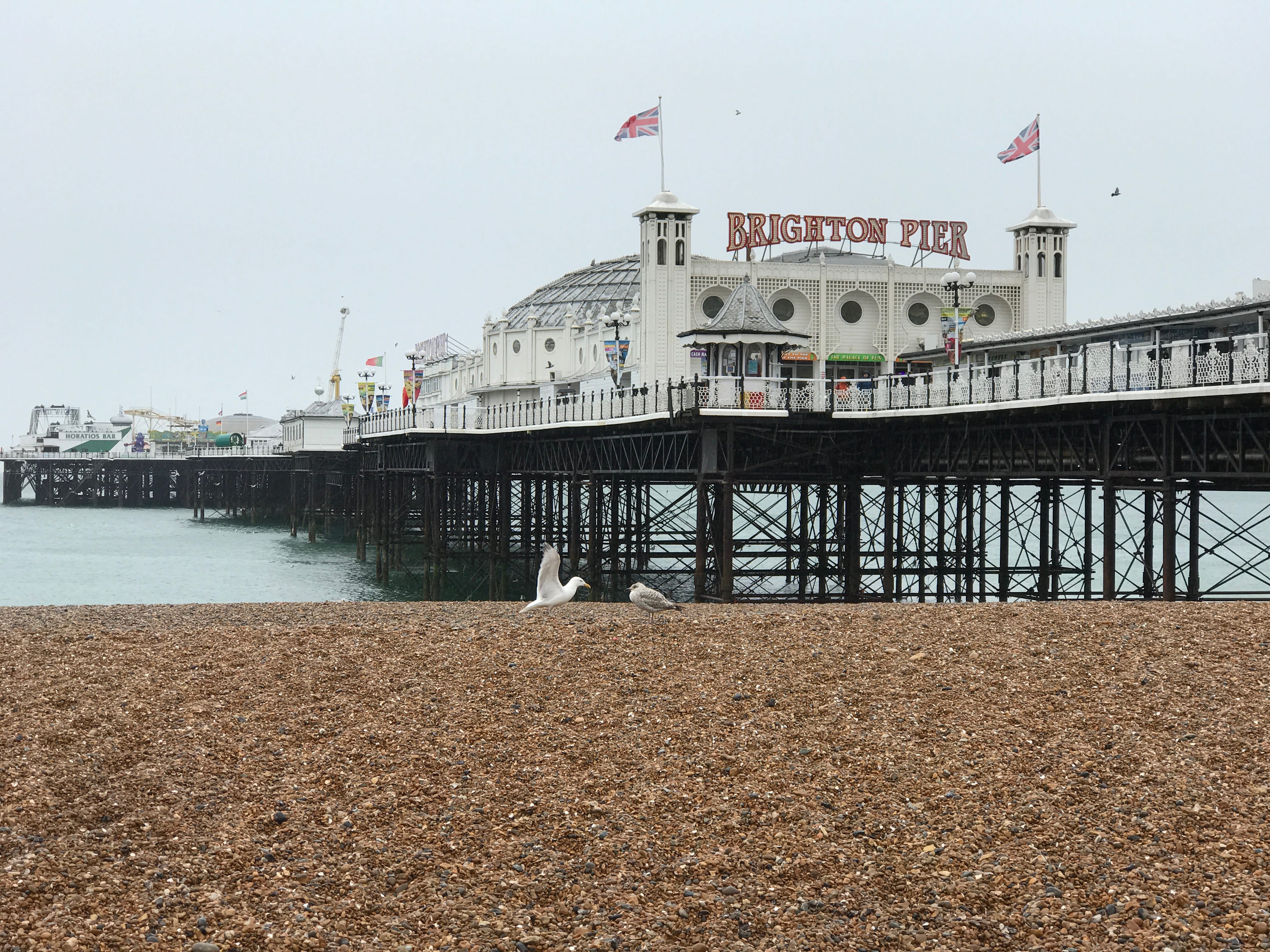 Pour ce quatrième jour, c’est pour Brighton que nous montons à bord d’un train au départ de la gare de London Bridge. Cette visite aurait pu être magnifique si la météo n’avait pas été complètement morose, et le mot n’est pas assez fort… Il pleuvait lorsque nous avons quitté le quai, il pleuvait lorsque nous avons posé le pied sur le quai à Brighton, et il n’aura jamais cessé de pleuvoir lors de notre passage près du Royal Pavilion, dans le pourtant superbe et étriqué quartier de North Laine. L’arrivée sur le front de mer était aussi éprouvante que perturbée par la pluie. Nous apercevions à peine l’ancienne jetée entre les gouttes, et arriver jusqu’à la zone couverte de la nouvelle n’aura pas été sans sacrifier nos vêtements, pas aussi adaptés à la terrible météo de la journée que nous l’aurions souhaité.