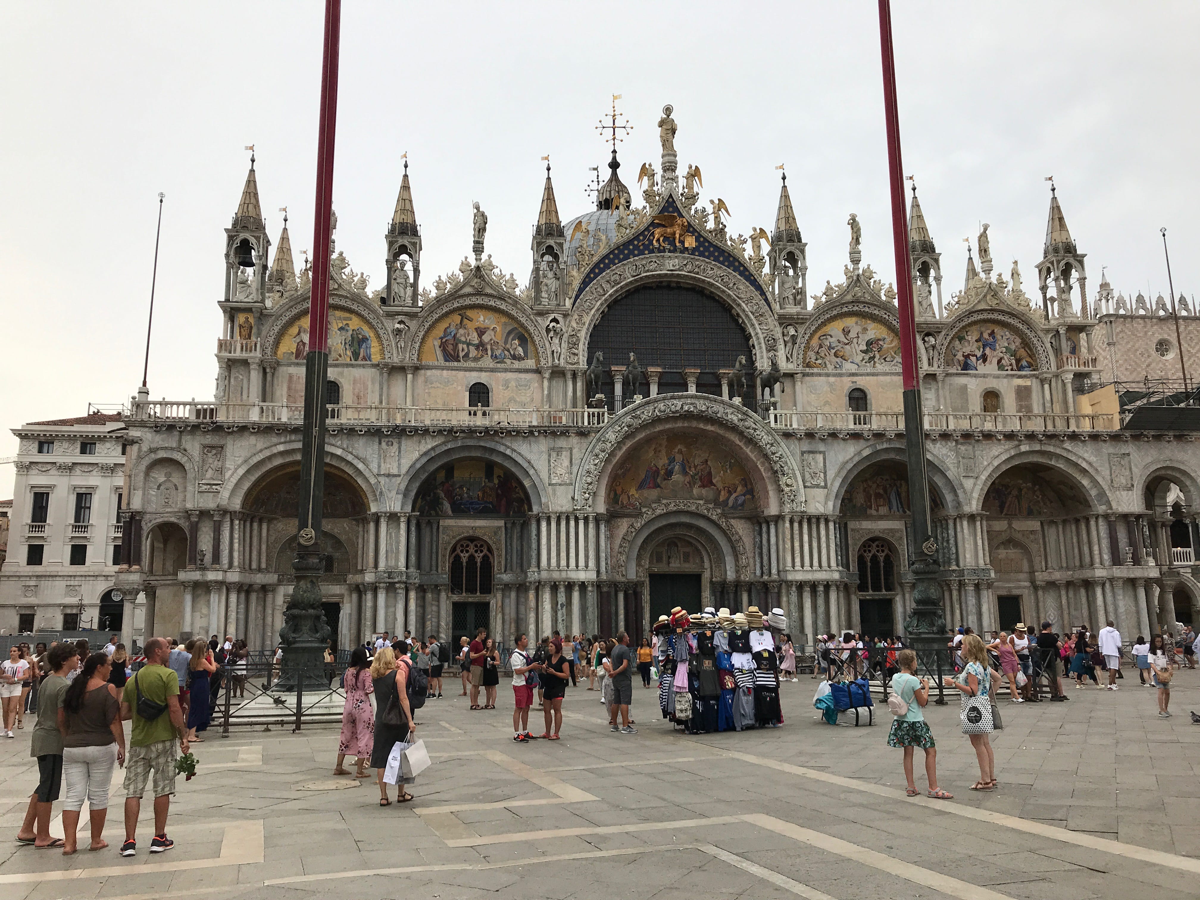 En ce quatrième jour, nous avions prévu des visites culturelles et historiques. Les croisiéristes débarquant aux alentours de 10h, notre objectif était d’arriver dans la file d’attente pour atteindre l’intérieur de la Basilique Saint-Marc avant eux. Et malgré cela, la foule était déjà bien présente alors que la Basilique venait à peine d’ouvrir ses portes. La visite n’est pas très longue. Notez que les photos y sont interdites et une tenue correcte est exigée, comme dans toutes les églises en Italie. En parlant de code vestimentaire, ne comptez pas non plus pouvoir visiter Venise en maillot de bain. Cela peut paraître être du bon sens, mais quand il fait une chaleur comme celle que nous avons connue en y étant, tout est à envisager. Cependant, la police veillait particulièrement au respect de ce point.