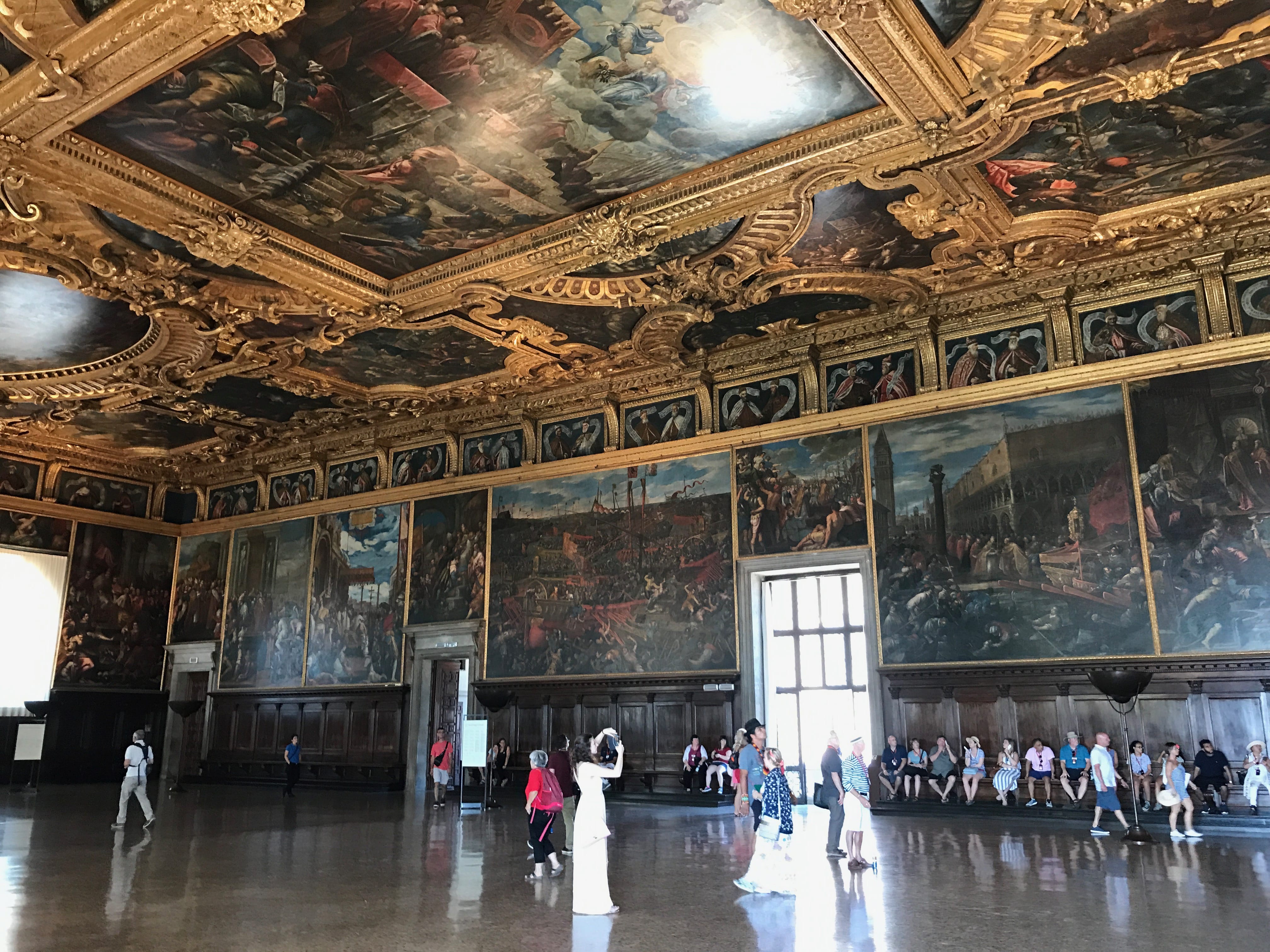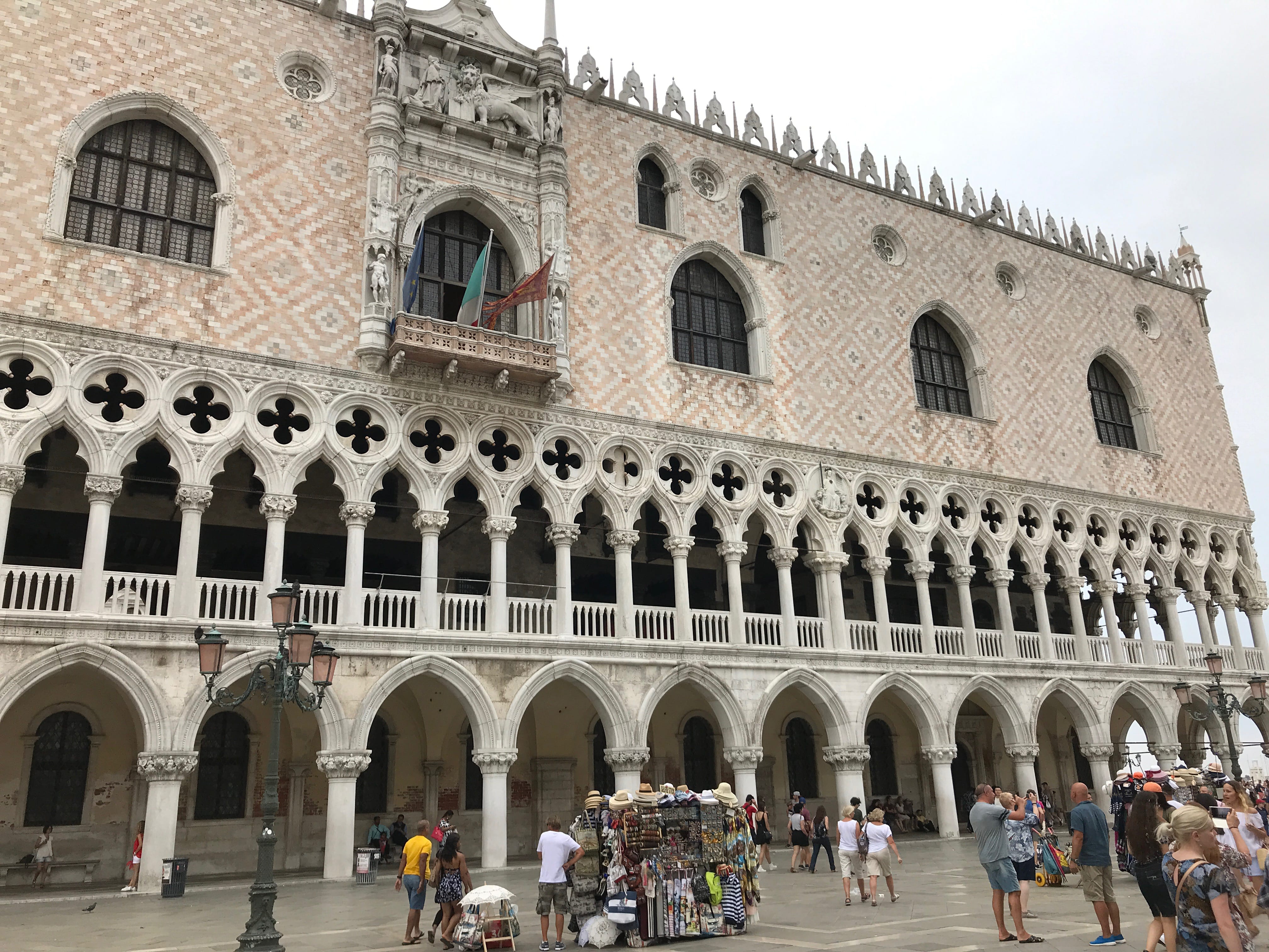 Juste à côté de la Basilique se trouve le Palais Ducal. Pour pouvoir le visiter et en apprendre plus sur son histoire, nous avions réservé une visite guidée à 10h20, en français : Les itinéraires secrets. Cette visite nous permettra de traverser des passages qui ne sont pas ouverts au public n’optant pas pour le circuit guidé, de passer par l’intérieur du Pont des Soupirs, et d’en apprendre plus sur l’histoire de Casanova (et nous faire notre propre avis sur son évasion assez rocambolesque).