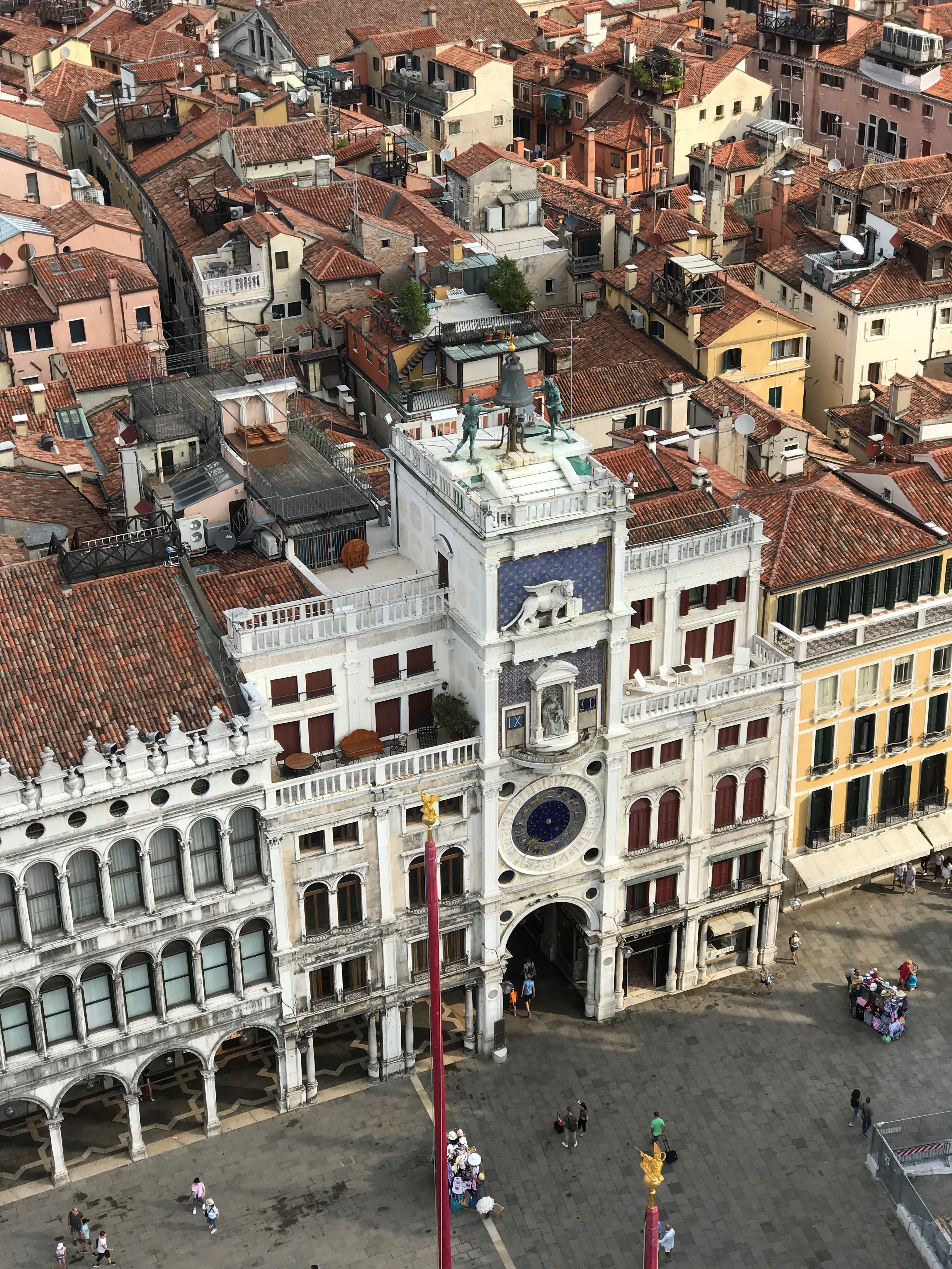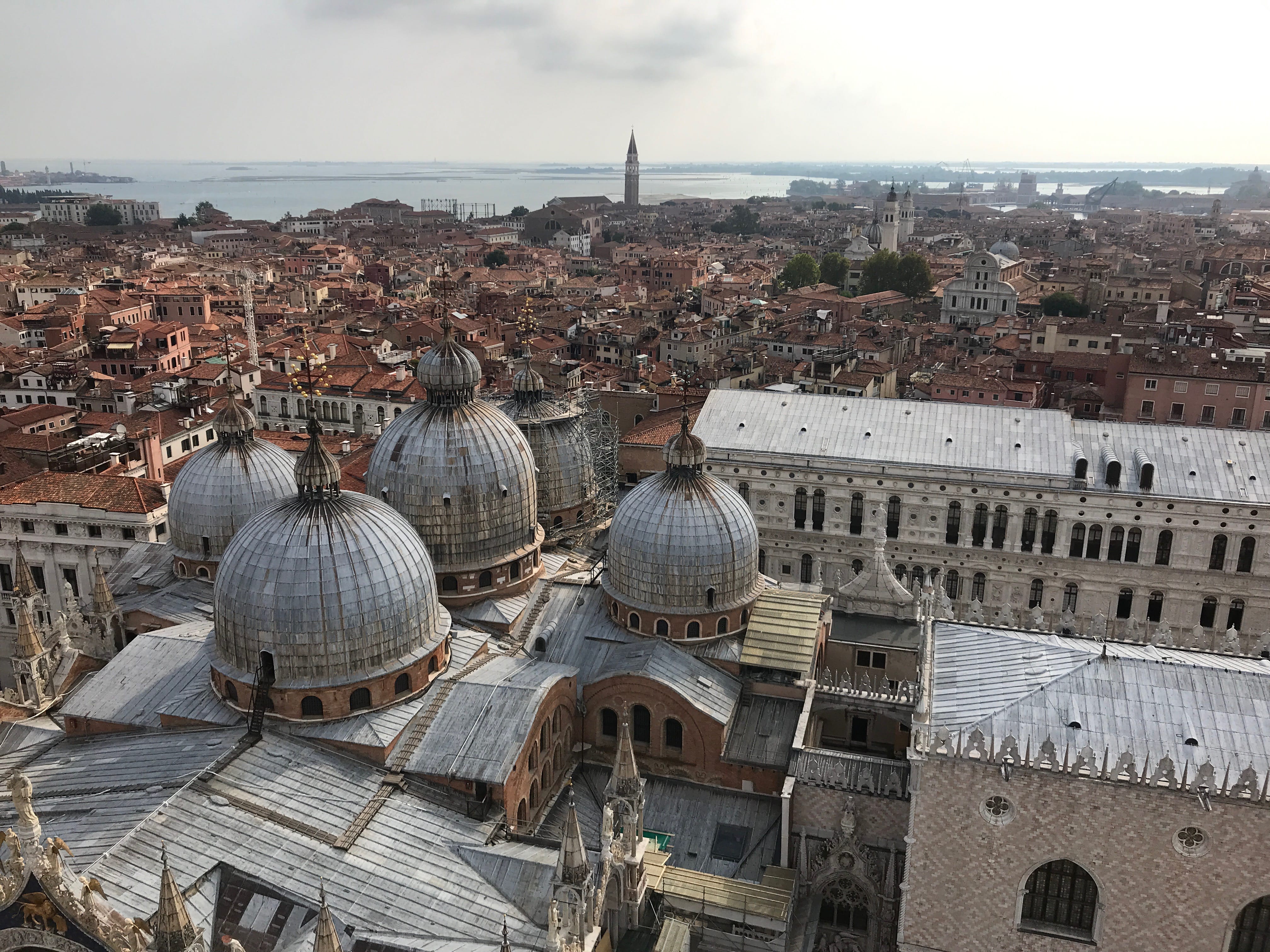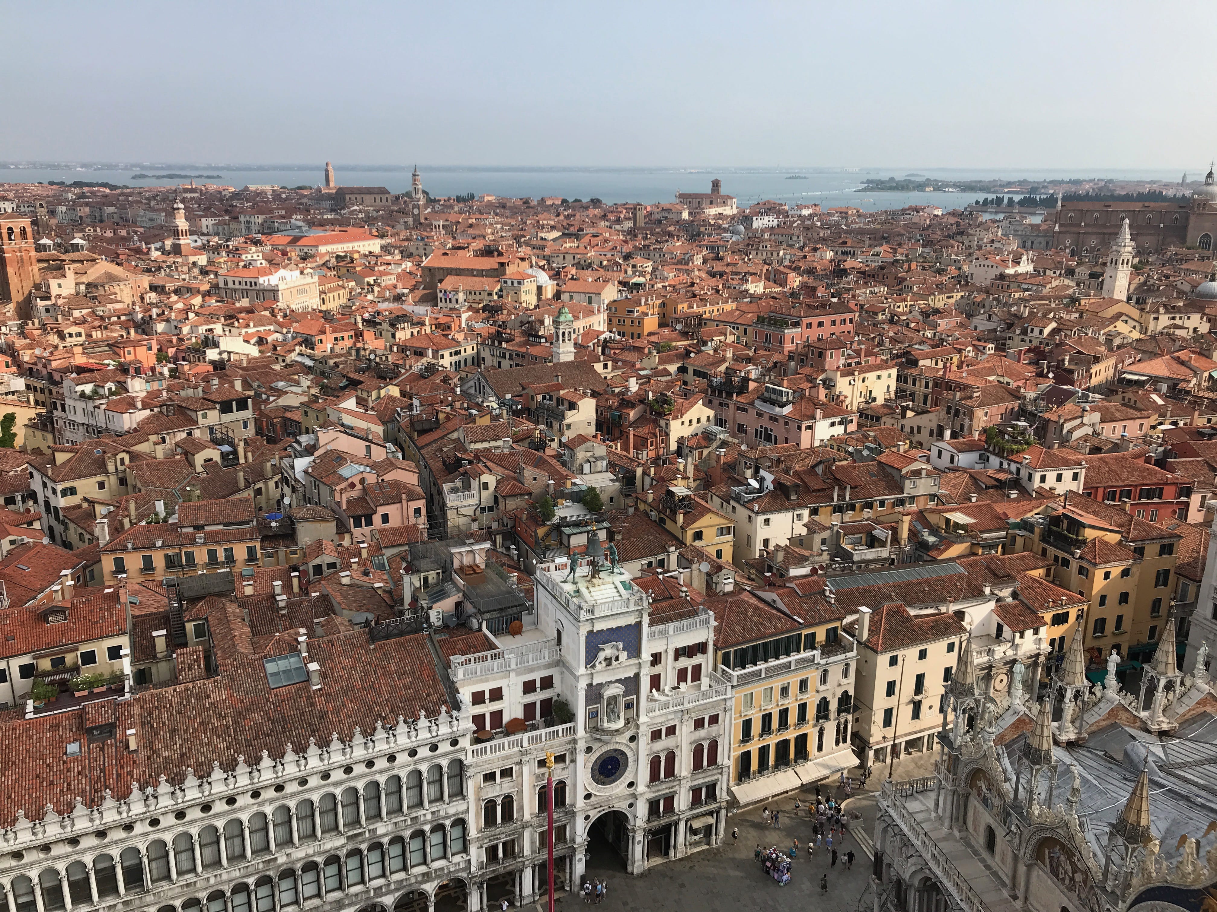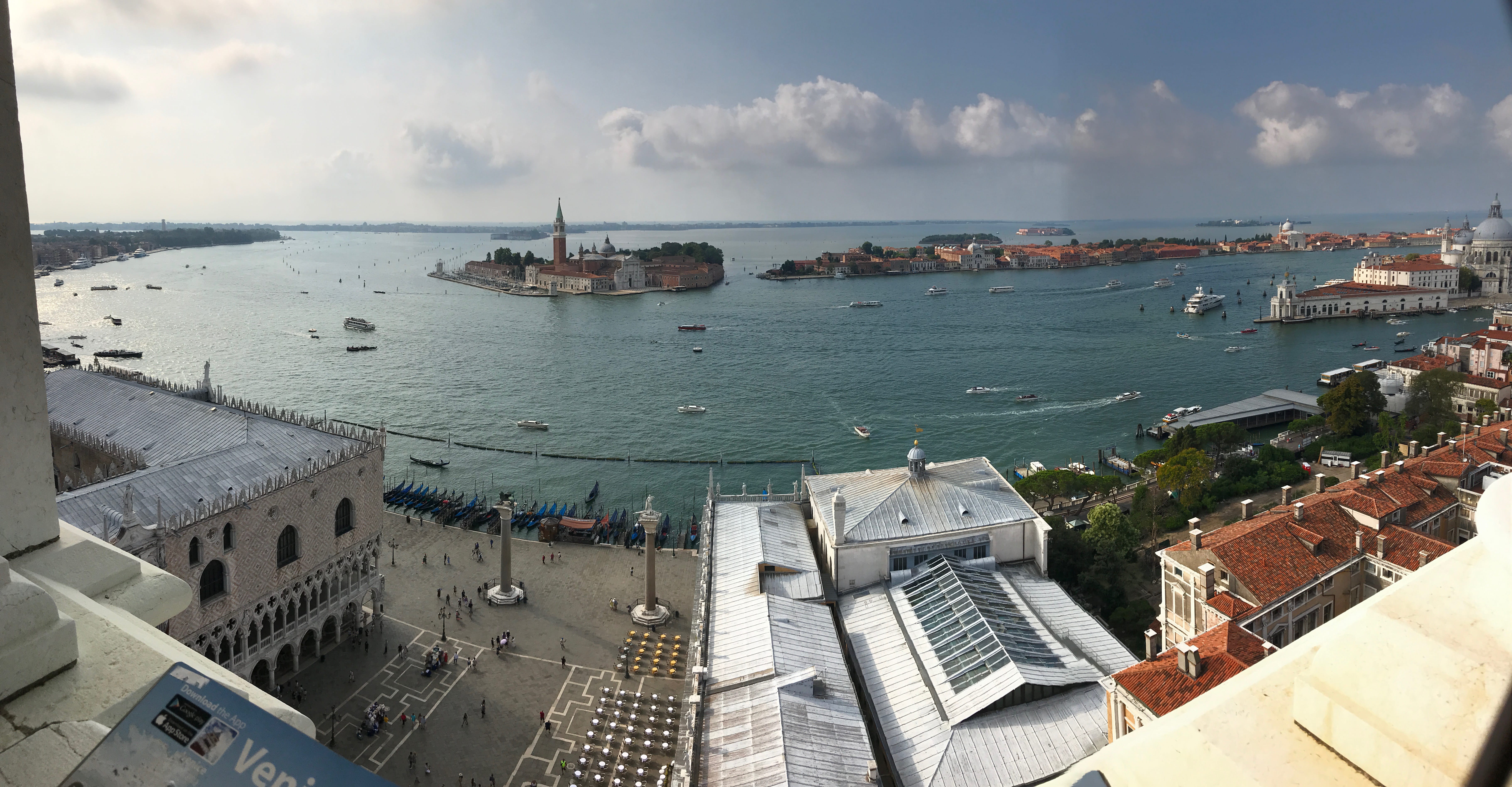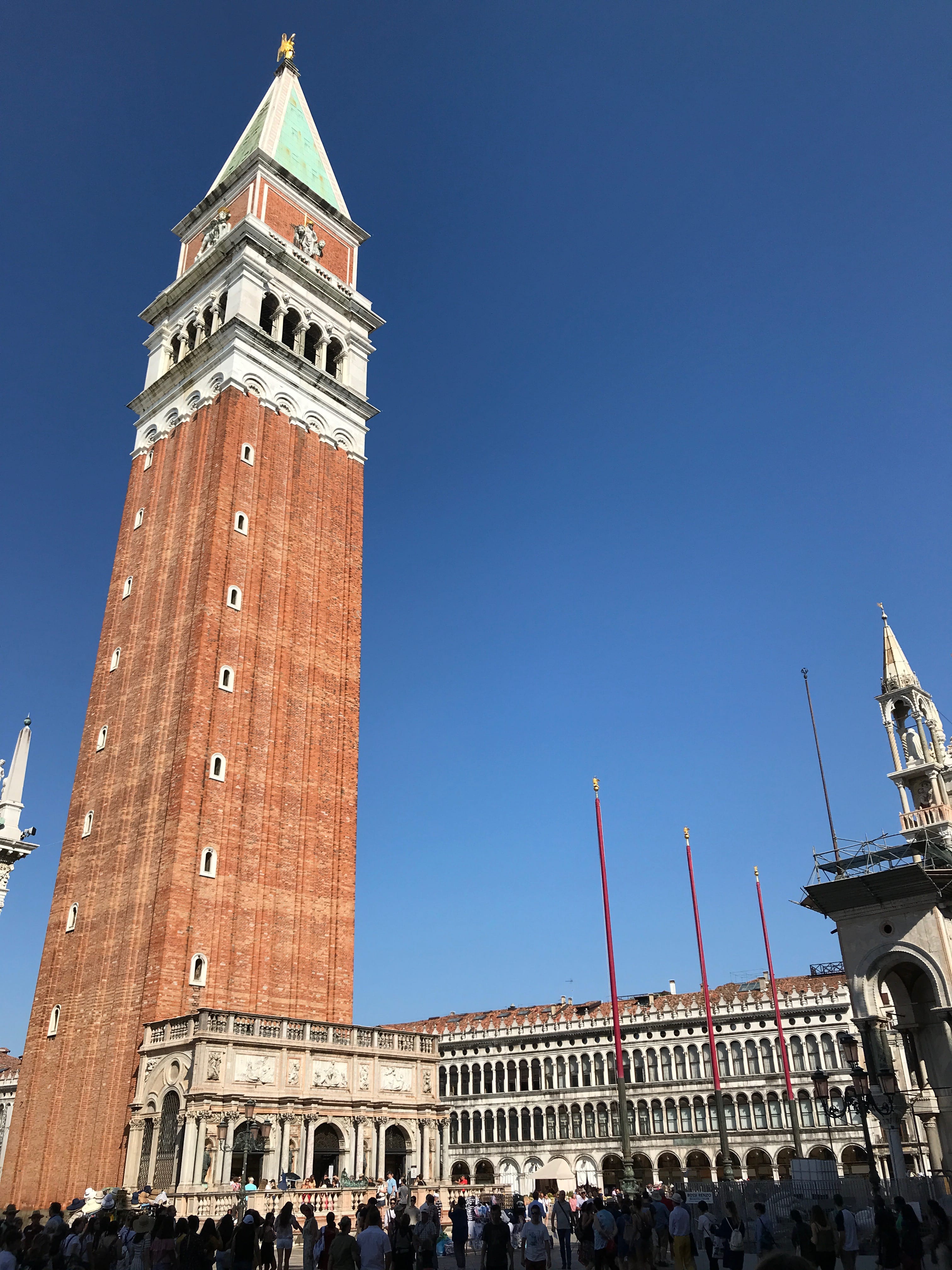 En cette dernière matinée sur place, nous avons choisi de faire l’ascension du Campanile de la place Saint-Marc pour profiter, encore une fois, de la vue magnifique qu’on pouvait s’offrir sur la ville. Nous ne le savions pas avant, mais il n’est pas possible de monter autrement qu’en prenant l’ascenseur. Une arrivée très matinale permet d’éviter une foule importante.