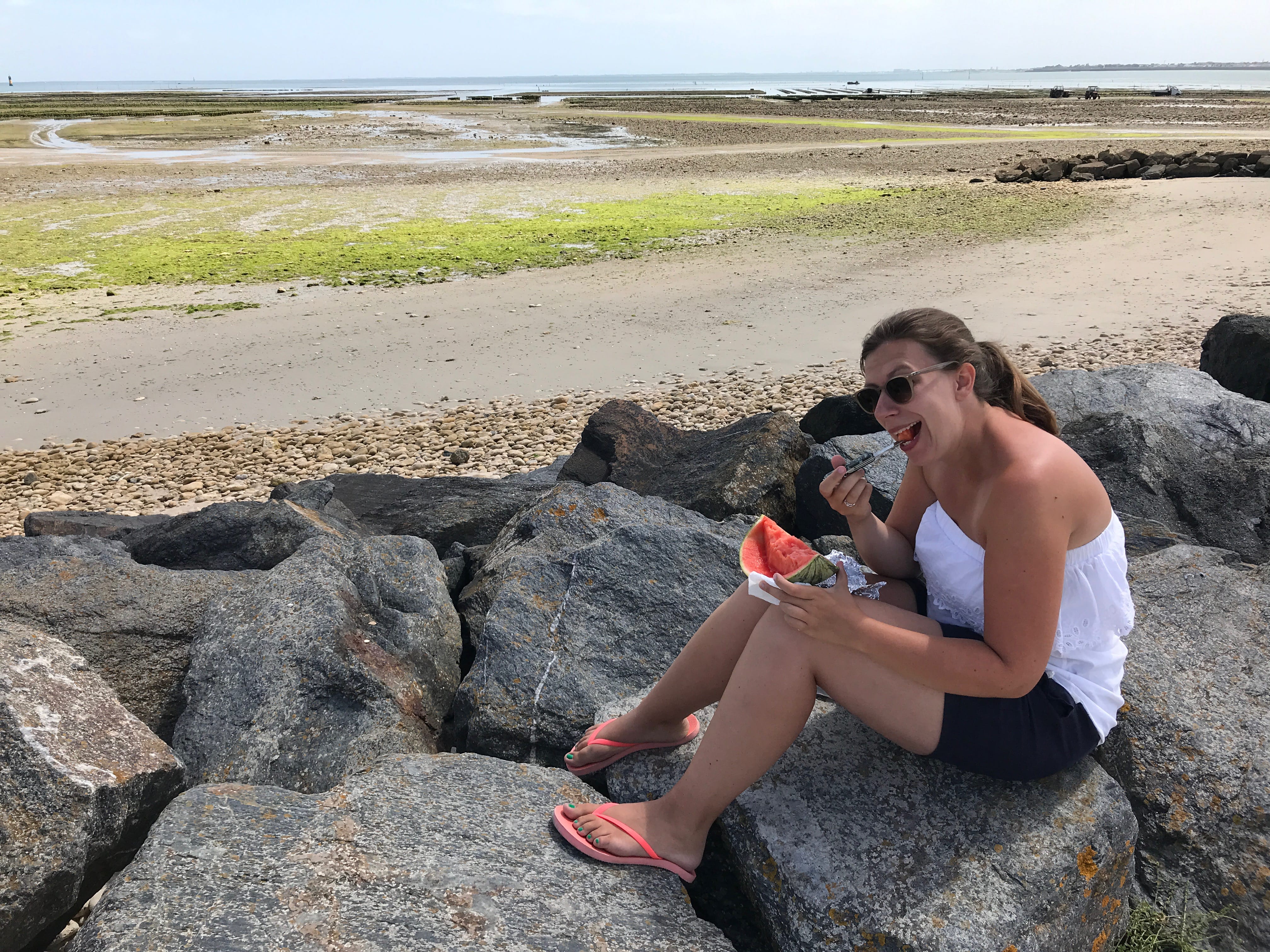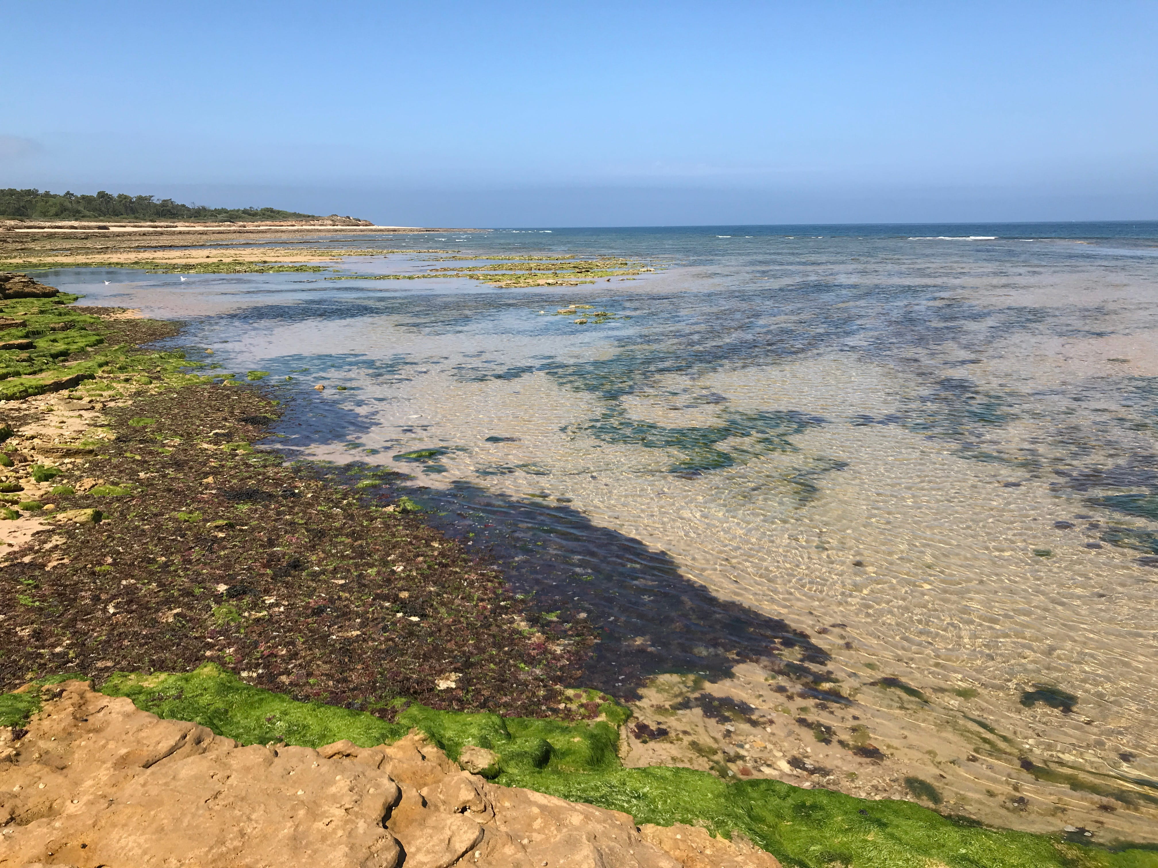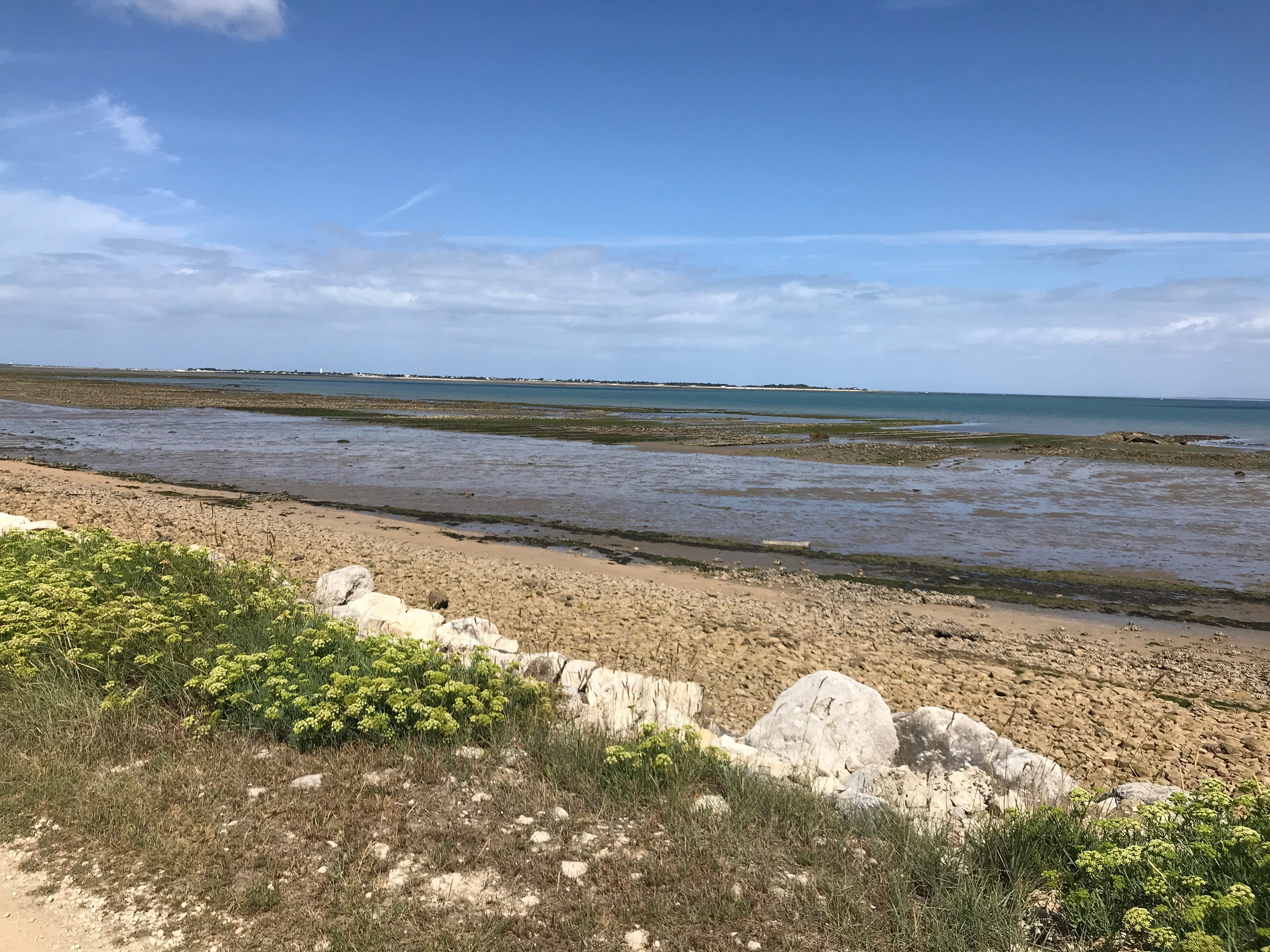 Le troisième jour sur l’île, c’est avec une troisième option que nous sommes montés dans la navette, bien décidés à prendre notre mal en patience pour avoir l’occasion d’aller découvrir le bout du bout de l’île, les Portes en Ré. On sent clairement que c’est l’extrémité de l’île, dans le sens où la majorité des touristes n’arrivent pas jusque là, ou du moins pas aussi rapidement que ceux qui décident comme nous de rester dans la navette jusqu’au terminus. Ce jour-là, c’est probablement le visage préféré de l’île que nous avons retrouvé, celui d’une plage complètement déserte, rien qu’à nous, certes, en grande partie à marée basse à notre arrivée, mais de quoi profiter des autres plaisirs de la plage, la lecture, le paysage, et la chasse aux coquillages. Si nous avons bien croisé quelques badauds, pouvoir déjeuner tranquillement rien que tous les deux, avec un paysage de cette beauté n’était vraiment pas pour nous déplaire. Nous avons ensuite profité d’avoir été jusqu’au bout de l’île pour en rejoindre la pointe, à quelques arrêts de là, et voir le phare, et la plage à ses pieds. Nous avions à ce moment-là bien retrouvé les touristes, que nous ne manquerons pas de fuir rapidement en nous réfugiant à la plage de Saint Clément des Baleines, pas la plus jolie, mais tellement plus calme.