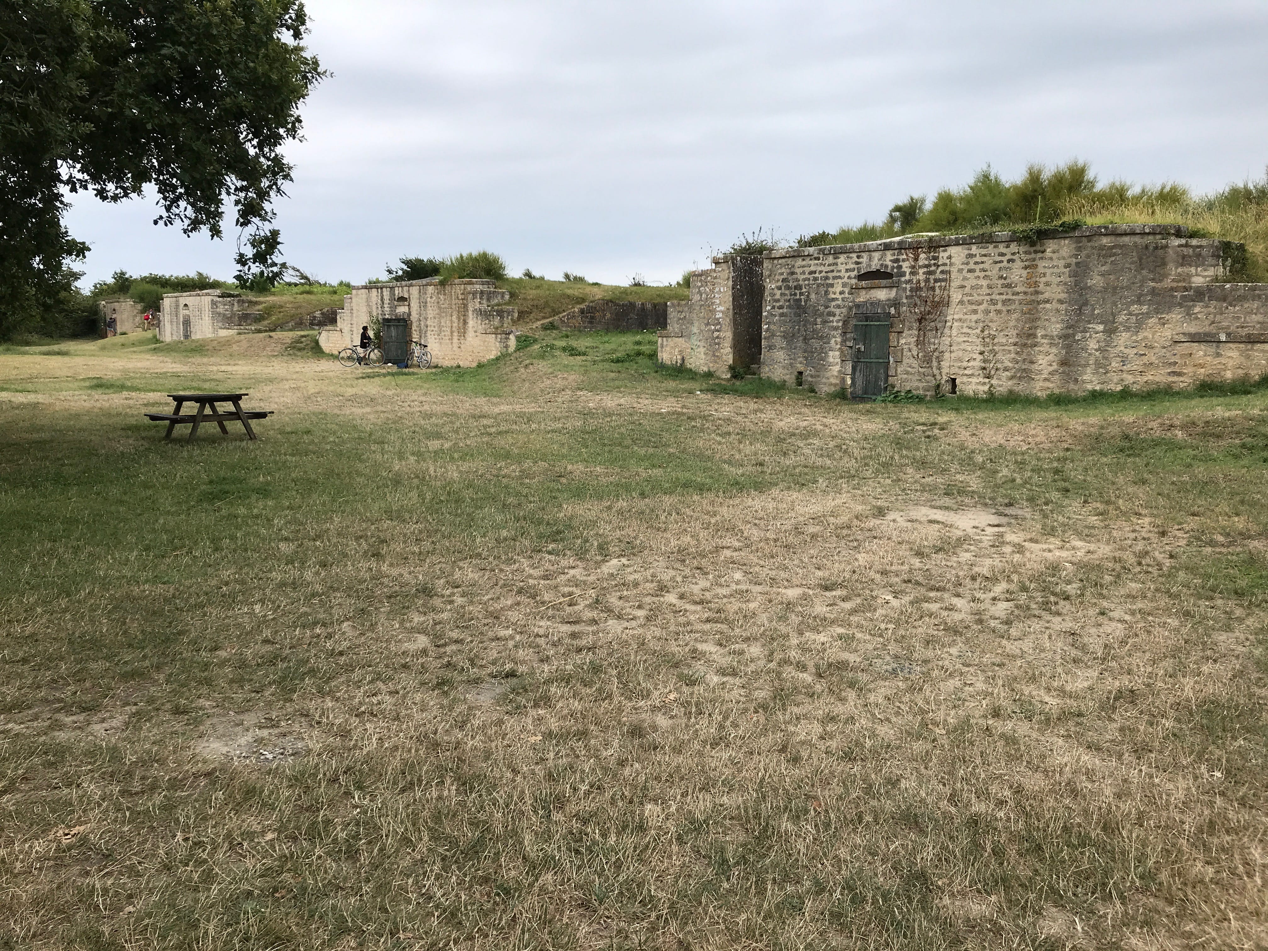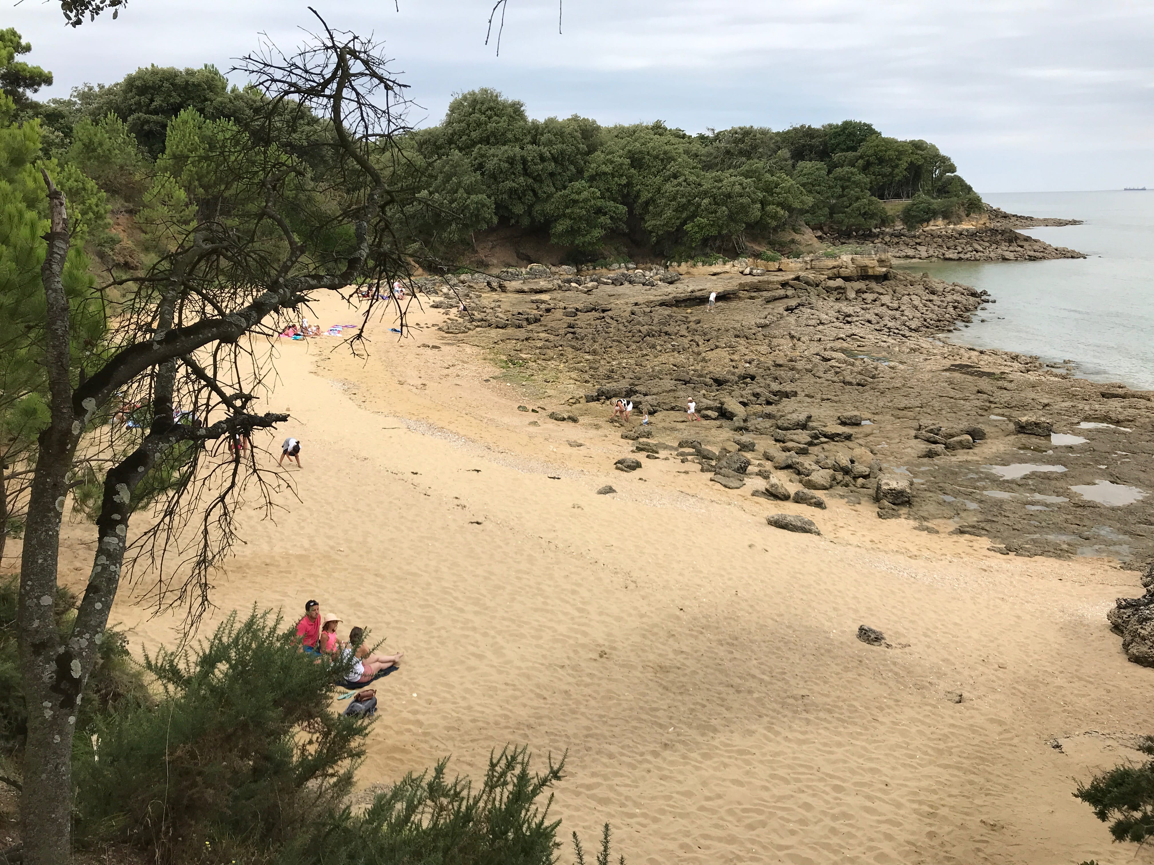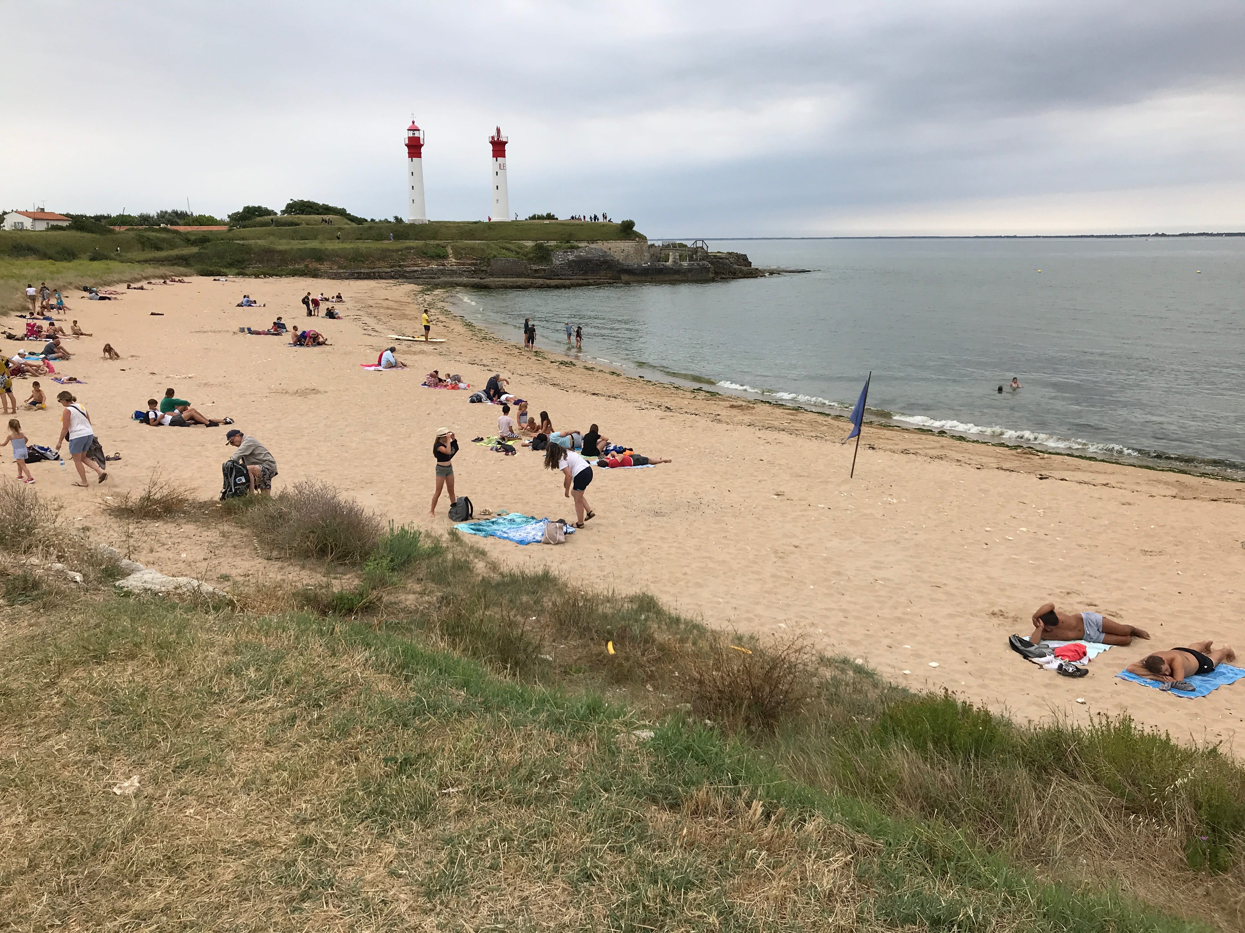 C’est donc quasiment jusqu’à la pointe que nous sommes allés, avant de nous poser sur une petite plage bien encaissée, et pas si facile que ça à atteindre, malgré plusieurs familles ou couples déjà présents sur place, pas vraiment pour se baigner vu la température et la météo du jour, simplement pour profiter du lieu, le temps de grignoter ou de profiter d’un jeu de plage. A l’aller jusqu’à cette plage, nous avons pu observer les paysages très différents de l’île, entre le port, le petit village, les zones plus ouvertes et découvertes, et la zone boisée au fur et à mesure qu’on s’éloignait du village. Nous avons ensuite pris le chemin du retour, longeant cette fois le littoral, sur des sentiers beaucoup plus petits, presque escarpés, moins fréquentés, avec une vue imprenable sur le côté plus sauvage de l’île. Nous atteignons bientôt la Batterie de Jamblet, dont il est possible de pénétrer à l’intérieur de certains ouvrages pour en apprendre un peu plus. Il s’agit en fait d’un ouvrage qui était destiné à protéger la rade de Rochefort dans laquelle de nombreux navires de guerre mouillaient. Elle fut détruite par les navires Anglais en 1757. Elle sera ensuite reconstruite et restera ainsi en fonction jusqu’à sa prise de retraite après la seconde guerre mondiale. Elle marquait en fait, pour nous, la fin de la partie plus sinueuse et le début de la grande plage du Tridoux, sur laquelle nous remonterons jusqu’au village.