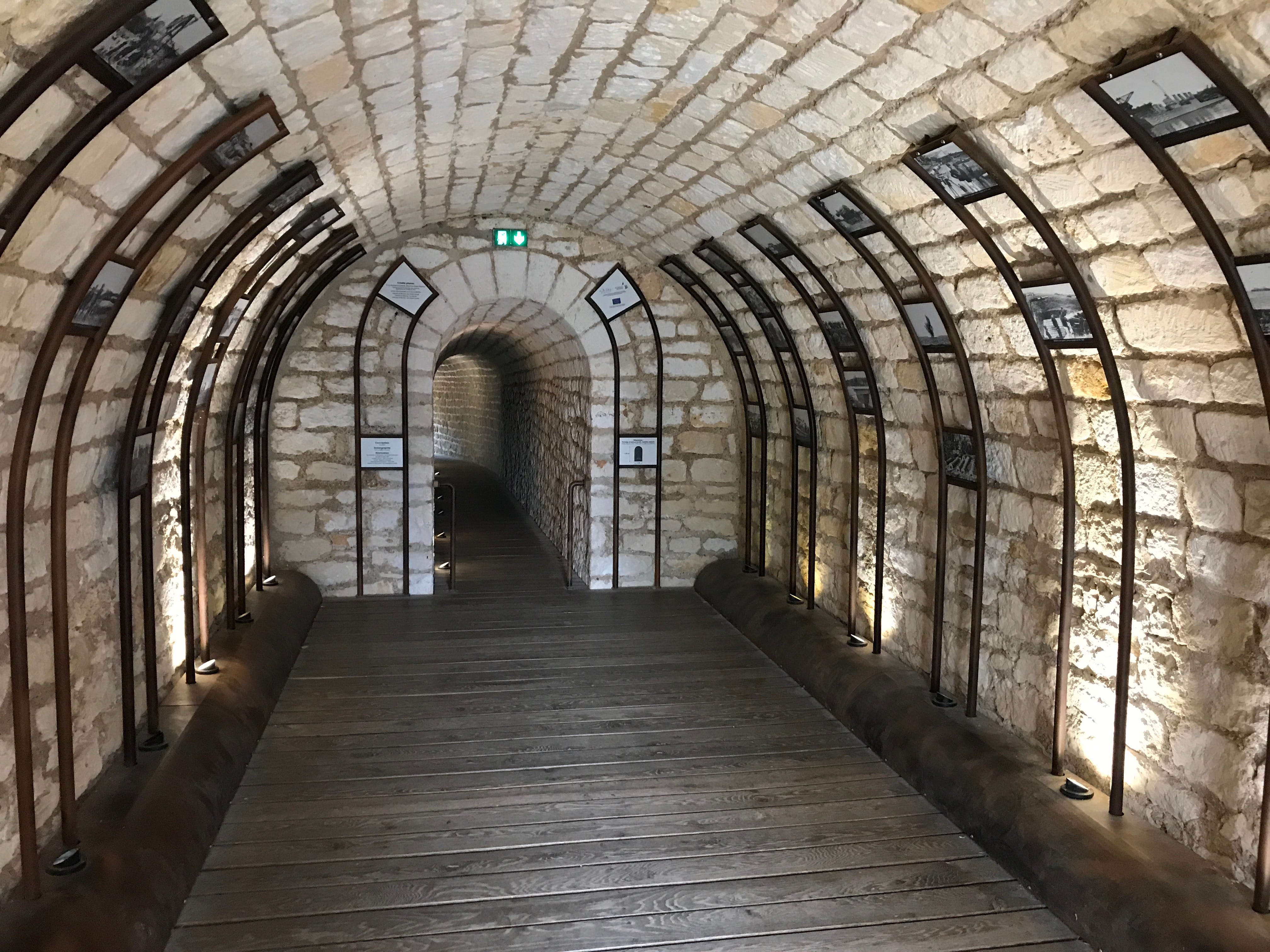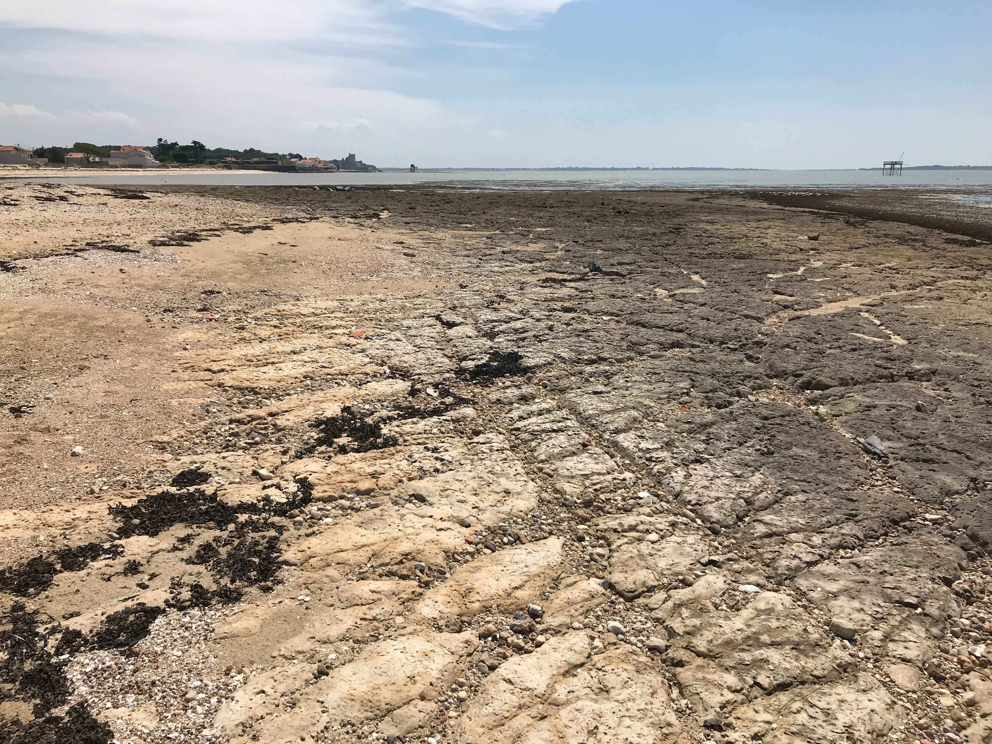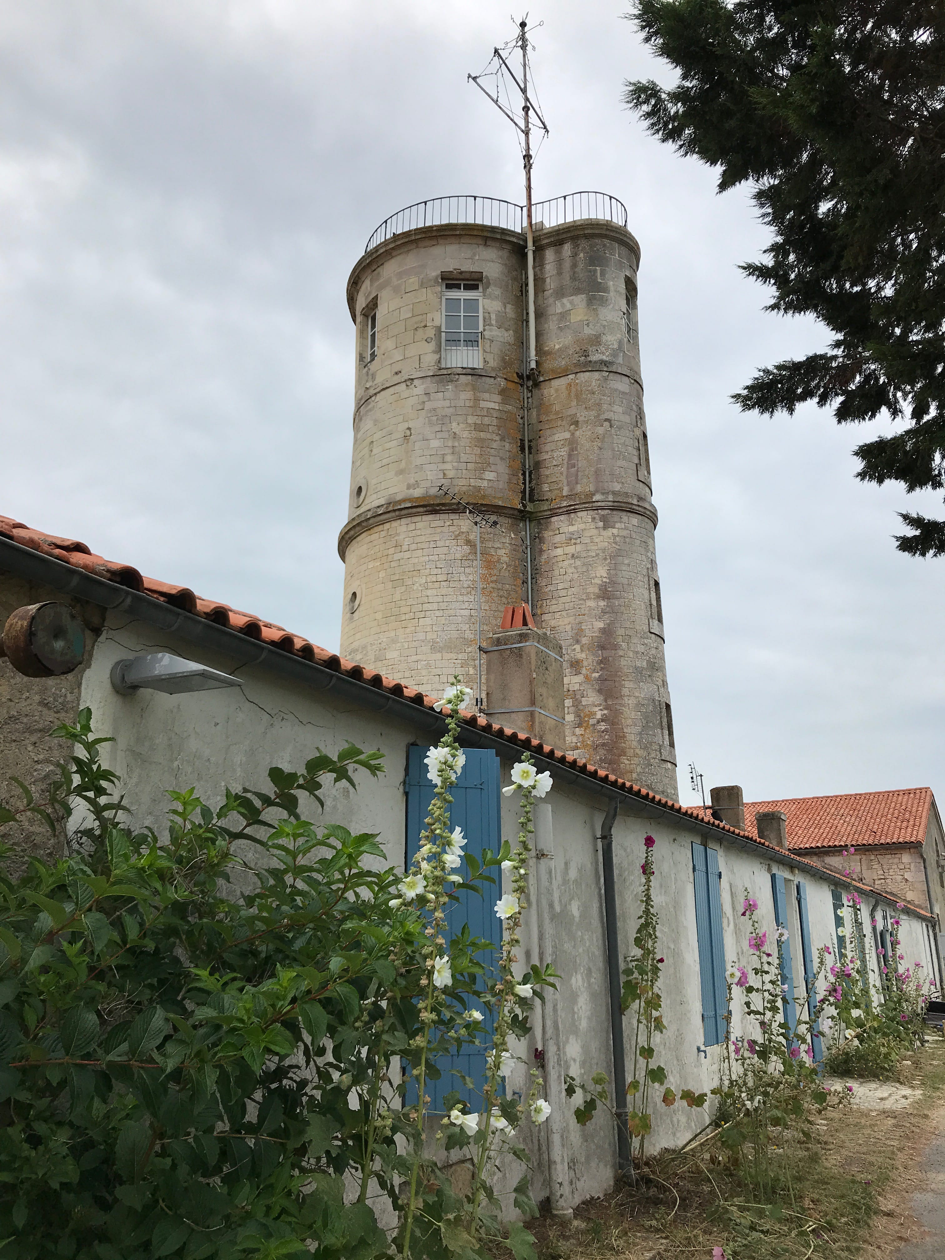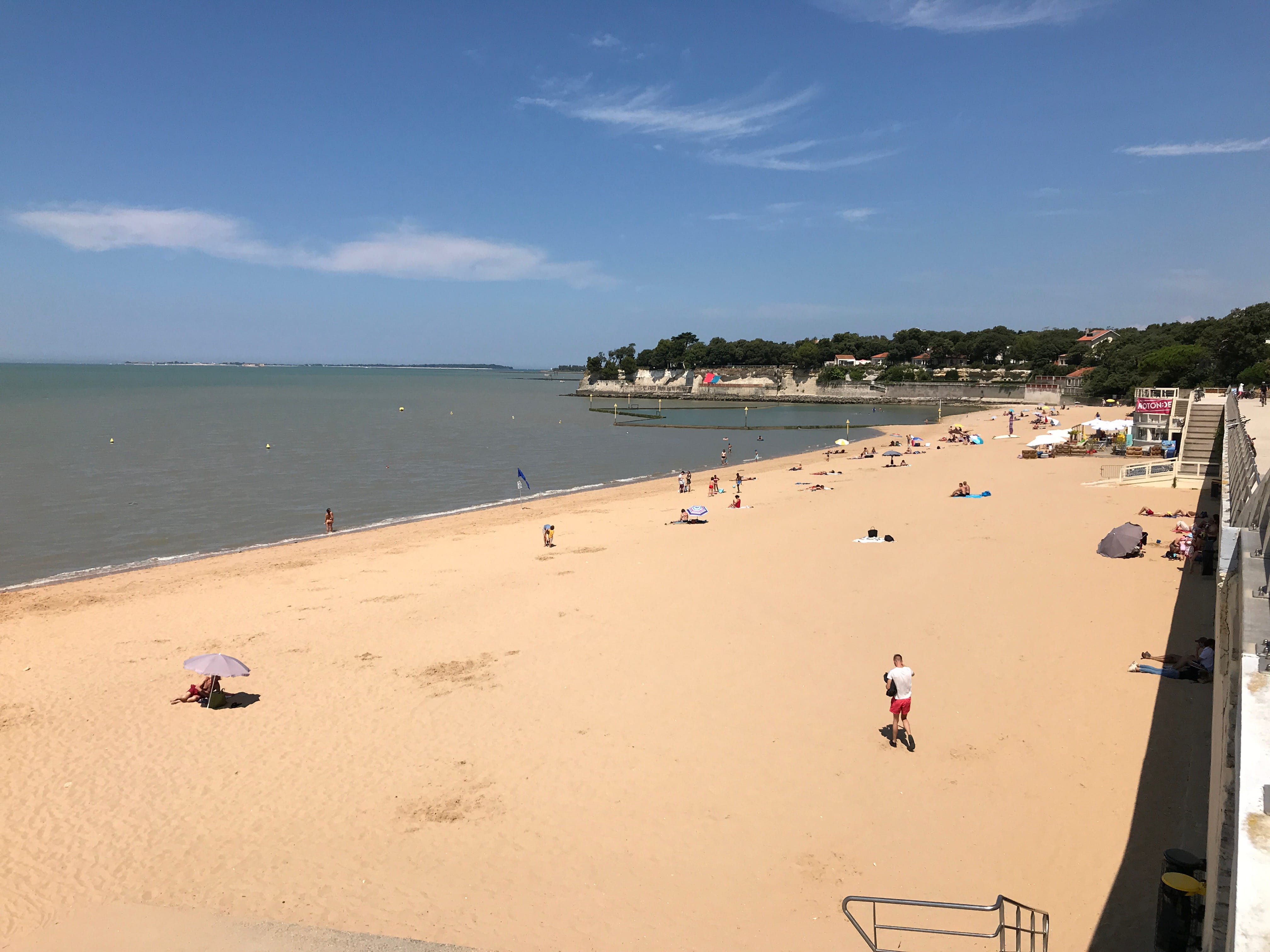 C’est donc quasiment jusqu’à la pointe que nous sommes allés, avant de nous poser sur une petite plage bien encaissée, et pas si facile que ça à atteindre, malgré plusieurs familles ou couples déjà présents sur place, pas vraiment pour se baigner vu la température et la météo du jour, simplement pour profiter du lieu, le temps de grignoter ou de profiter d’un jeu de plage. A l’aller jusqu’à cette plage, nous avons pu observer les paysages très différents de l’île, entre le port, le petit village, les zones plus ouvertes et découvertes, et la zone boisée au fur et à mesure qu’on s’éloignait du village. Nous avons ensuite pris le chemin du retour, longeant cette fois le littoral, sur des sentiers beaucoup plus petits, presque escarpés, moins fréquentés, avec une vue imprenable sur le côté plus sauvage de l’île. Nous atteignons bientôt la Batterie de Jamblet, dont il est possible de pénétrer à l’intérieur de certains ouvrages pour en apprendre un peu plus. Il s’agit en fait d’un ouvrage qui était destiné à protéger la rade de Rochefort dans laquelle de nombreux navires de guerre mouillaient. Elle fut détruite par les navires Anglais en 1757. Elle sera ensuite reconstruite et restera ainsi en fonction jusqu’à sa prise de retraite après la seconde guerre mondiale. Elle marquait en fait, pour nous, la fin de la partie plus sinueuse et le début de la grande plage du Tridoux, sur laquelle nous remonterons jusqu’au village.