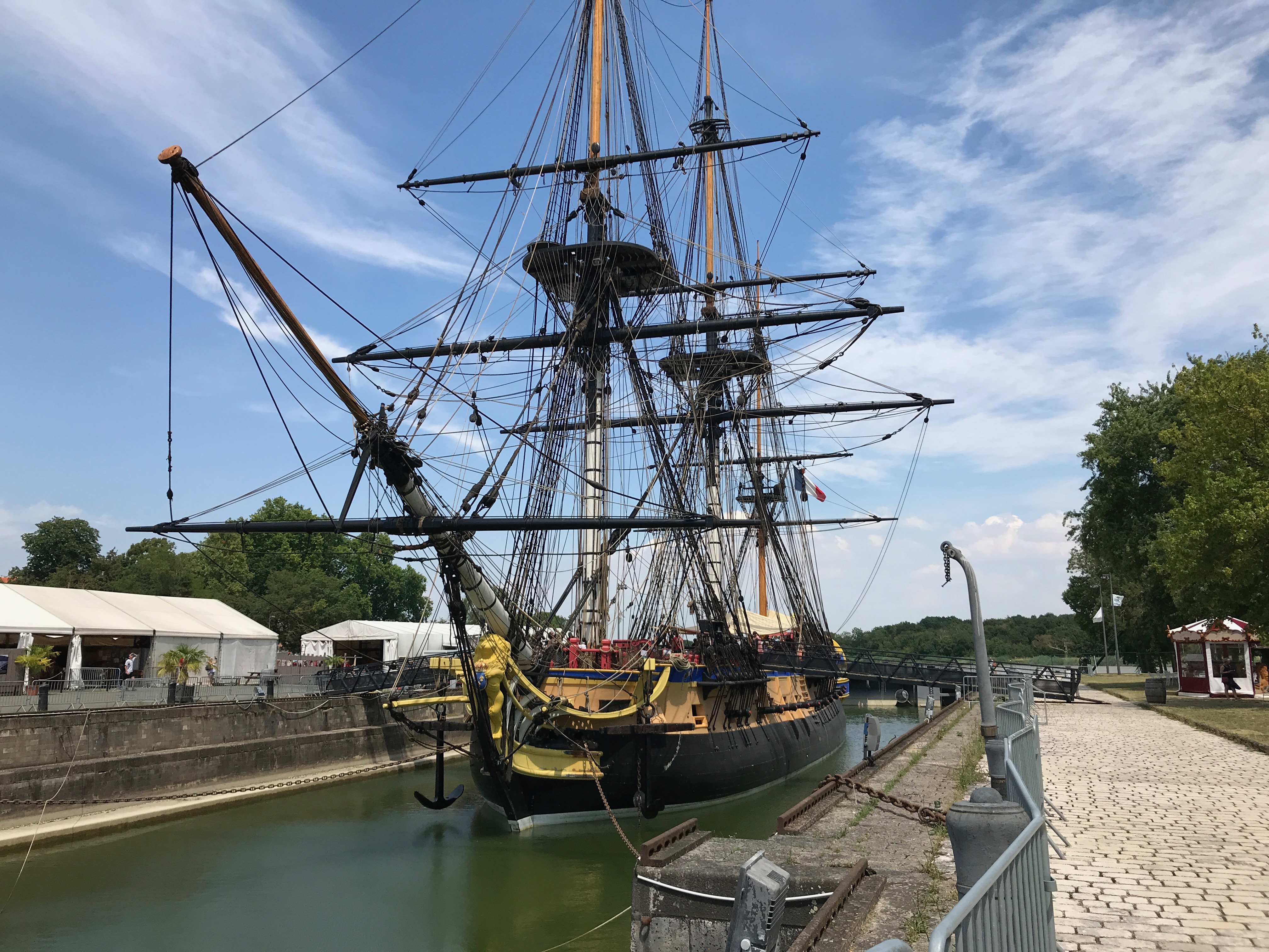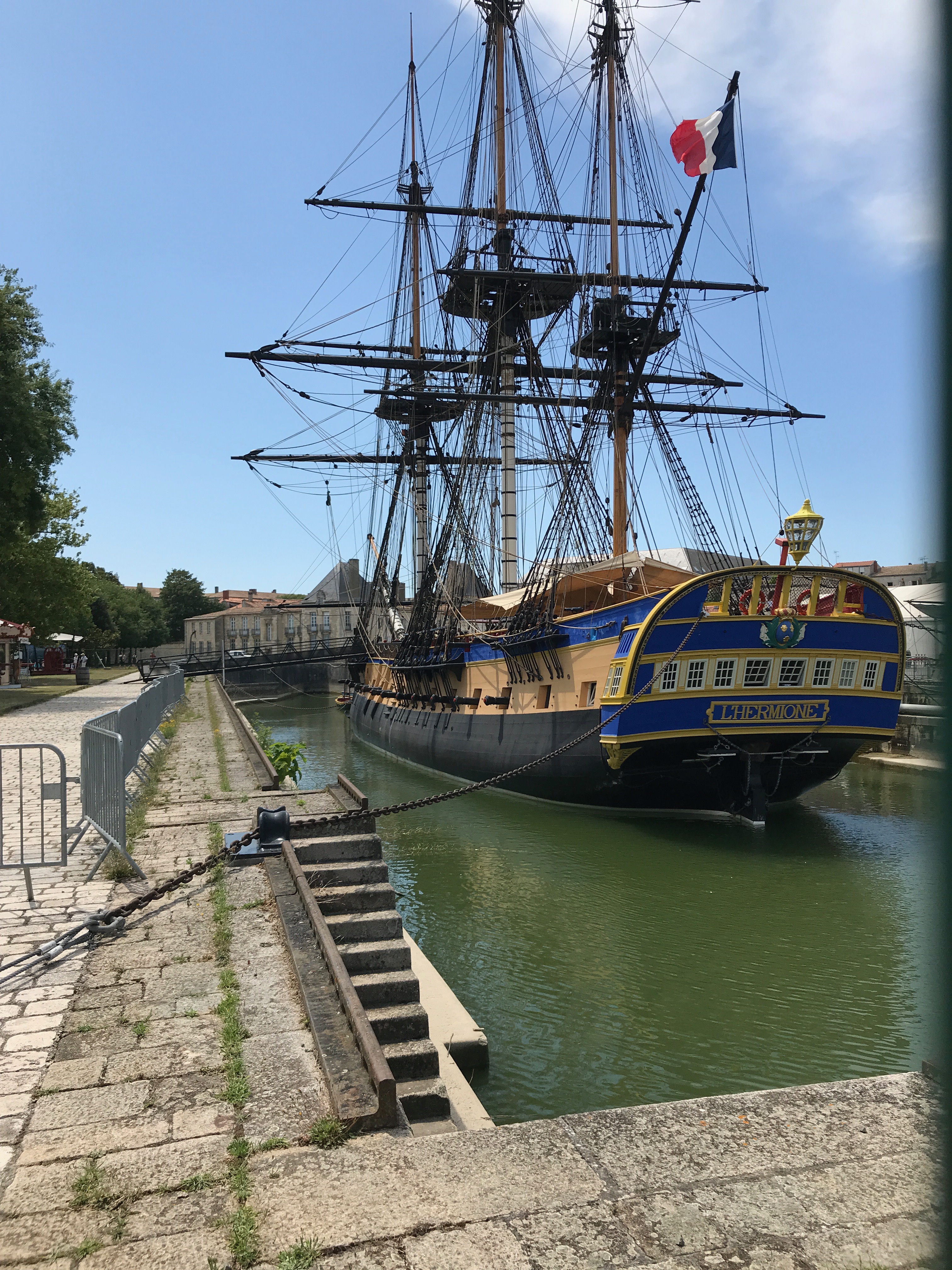 Cette journée-là, Il voulait également lui faire découvrir une particularité de la ville de Rochefort, l’Hermione. Pour faire court, l’histoire de l’Hermione actuelle remonte à 1997, quand l’idée de recréer un bateau mythique a été émise de la part d’une association voulant reproduire à l’identique le fameux bateau, ayant permis à Lafayette de rejoindre les Etats-Unis, luttant alors pour leur indépendance, en 1780. Si à l’époque il n’aura fallu que deux ans pour construire l’Hermione, il en aura fallu presque dix fois plus aujourd’hui à ces passionnés, grâce également à la visite du chantier rendue possible et finançant ainsi en grande partie la construction. Les premières années, il était donc possible de voir la construction de la coque, puis petit à petit de se représenter davantage en détails l’ampleur du chantier. En 2015, l’Hermione revivra son voyage d’origine, rejoignant les Etats-Unis, véritable exploit pour cette équipage composé à la fois de volontaires et de marins aguerris, dans des conditions presque similaires à celles de l’époque. Aujourd’hui, le bateau est visible sur son lieu de construction, à deux pas de la Corderie Royale, et démontre encore aujourd’hui le fort passé maritime de la ville. Mais si celle-ci avait toujours parue bien vivante lors de toutes ces années pendant lesquelles Il aura suivi l’évolution du navire, cette année, et sous un soleil de plomb, la ville était déserte, rendant ainsi notre petite visite plus courte que prévue. En revanche, si vous passez à proximité, en famille, nous ne pouvons que vous conseiller d’y aller pour apercevoir ce magnifique navire, fleuron de la ville, comme celui d’autrefois et d’ainsi conjuguer visite découverte avec de potentiels divertissements comme le parcours d’escalade réalisé pour petits et grands sur les mâts et voiles du bateau.
