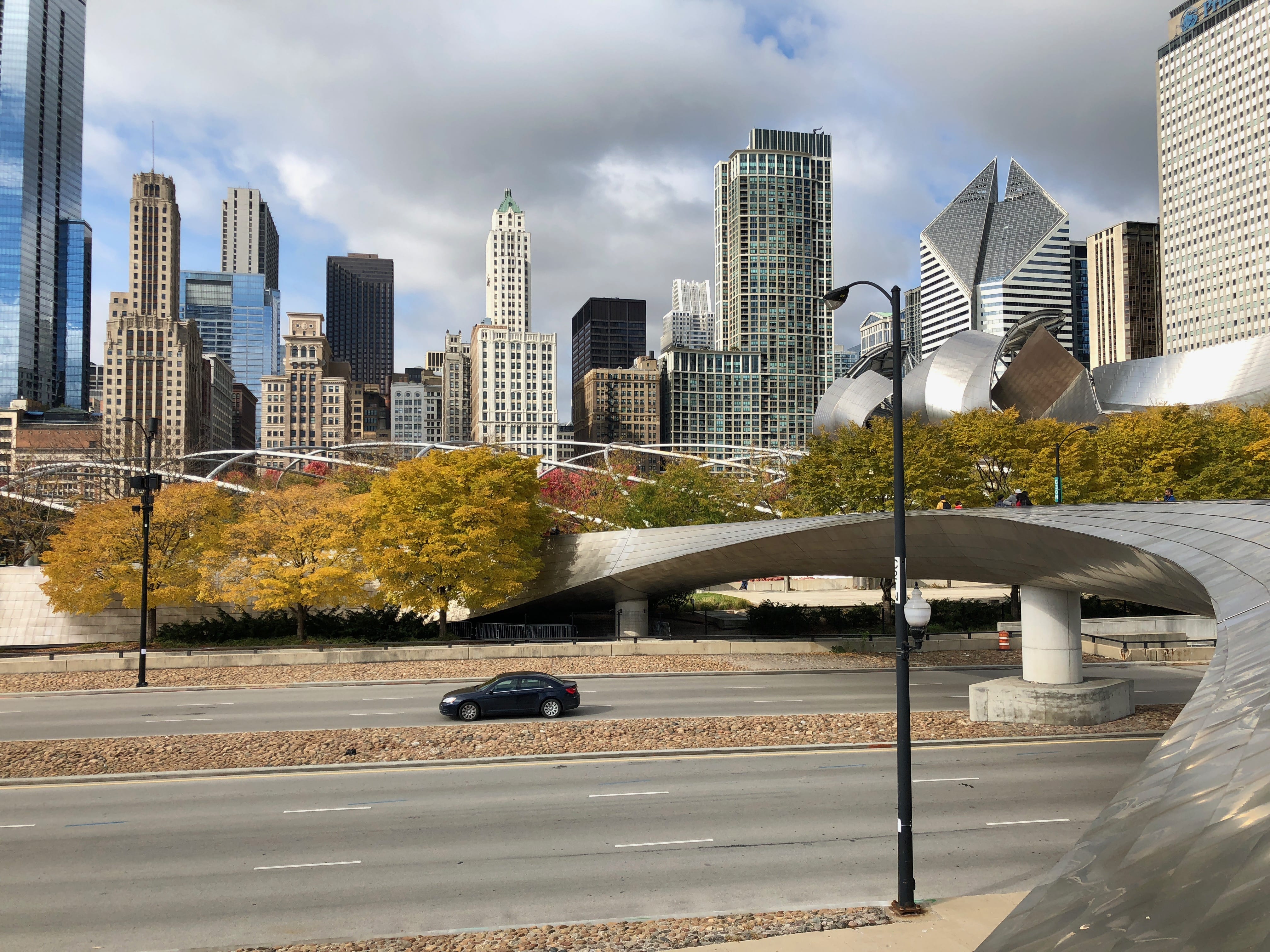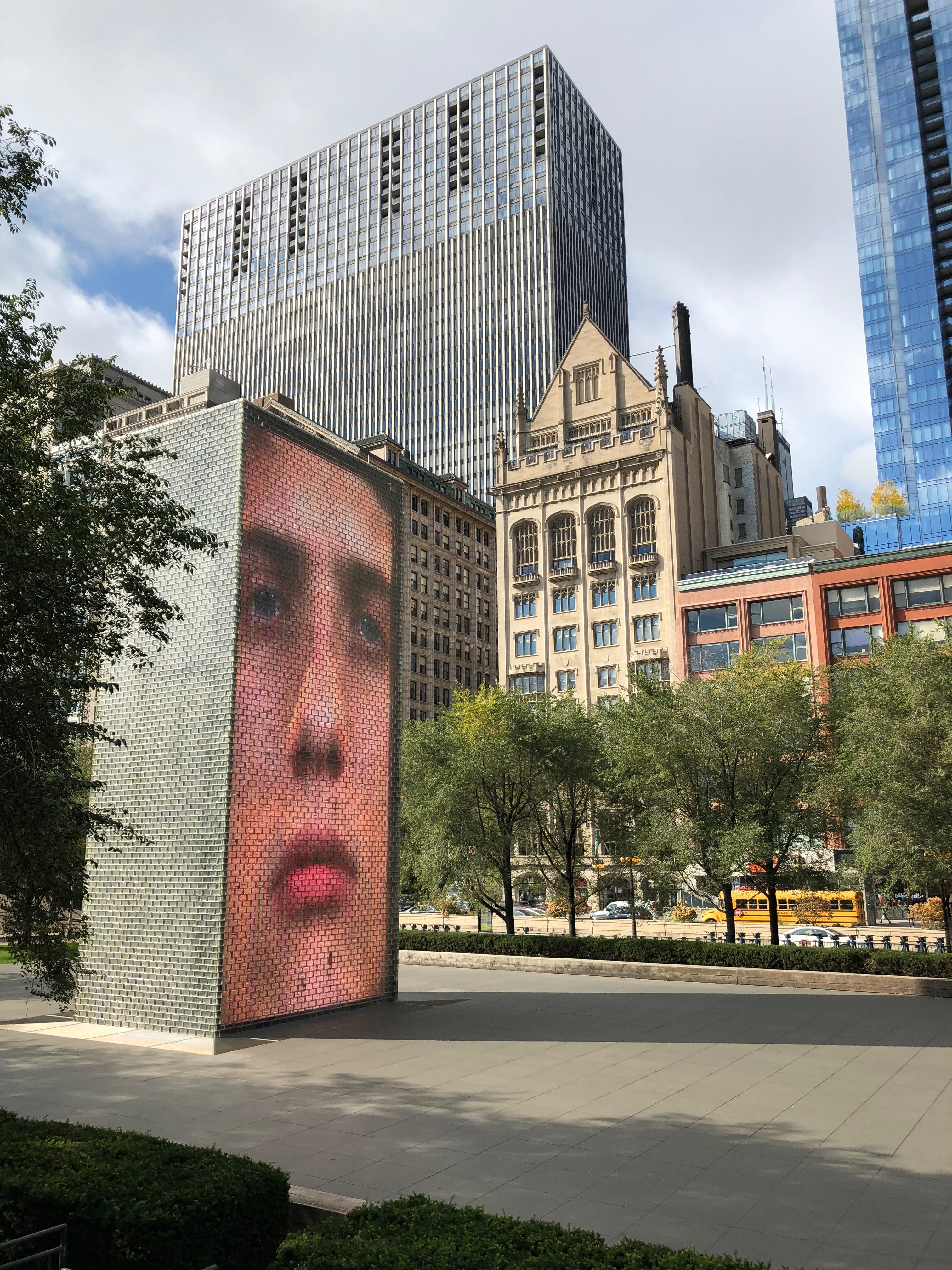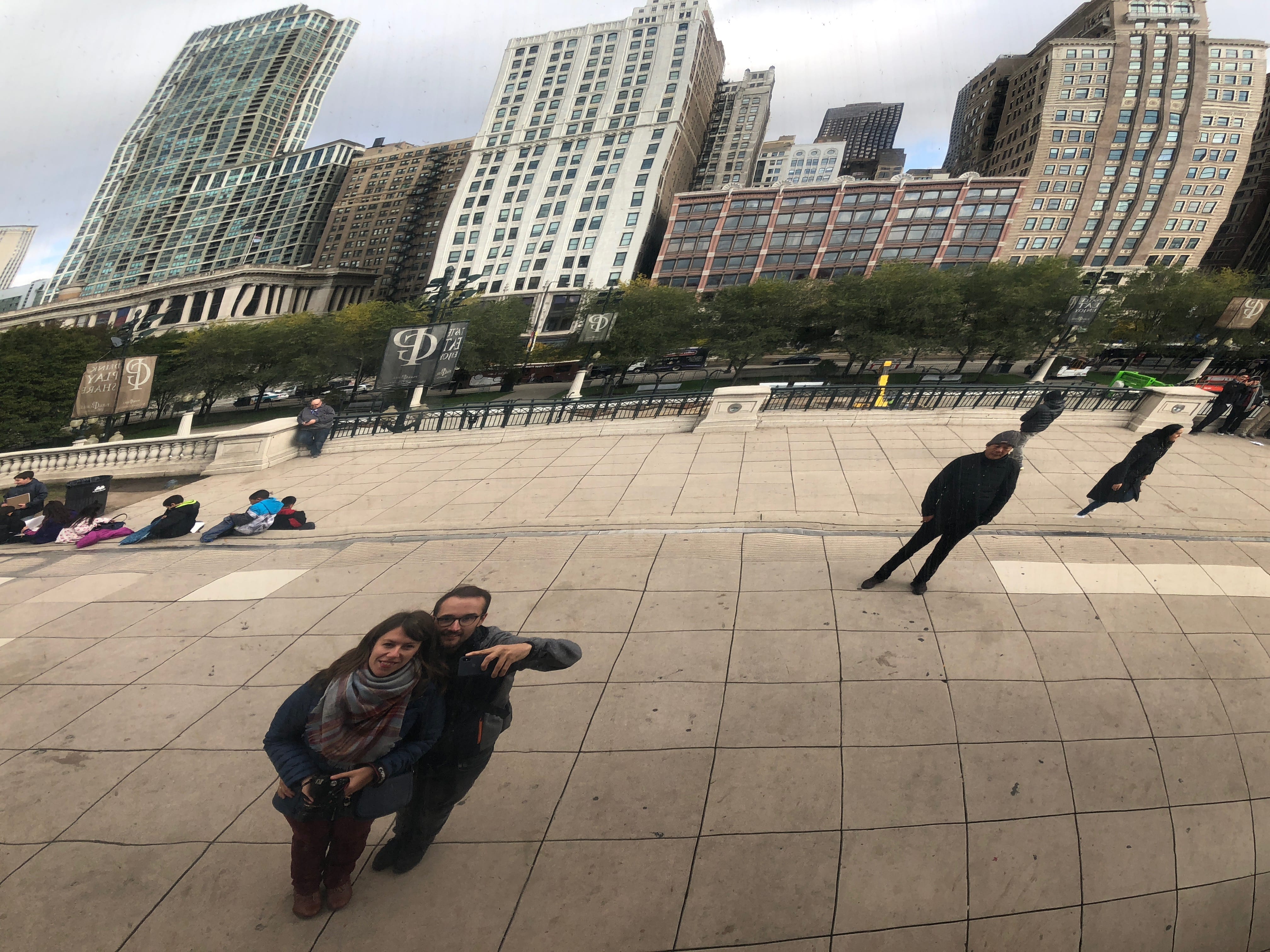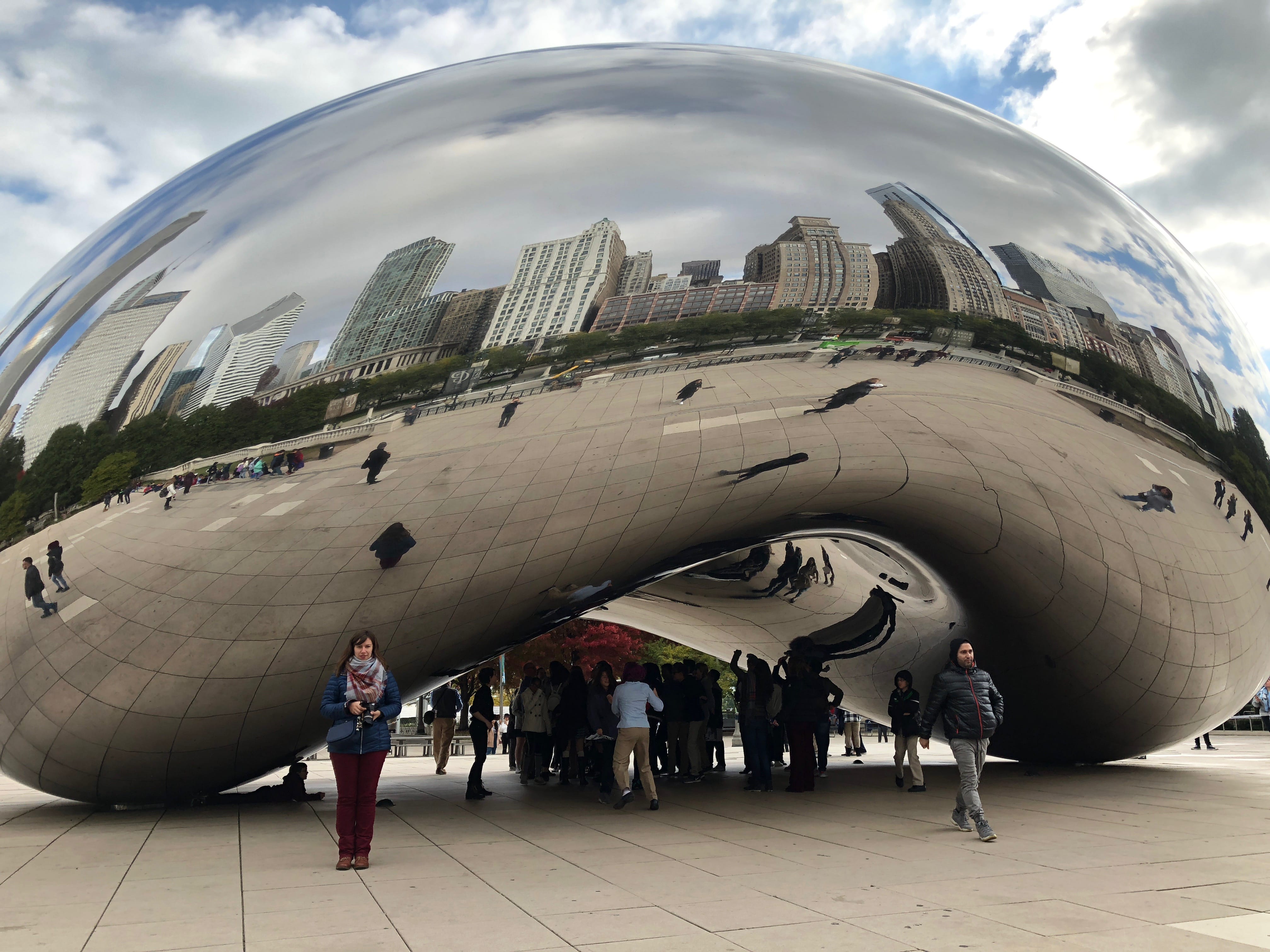 Ce bus-là nous a conduit jusqu’à Millenium Park et le non moins célèbre Cloud Gate en forme de haricot qui lui donne son surnom sous lequel il est plus connu : « The Bean ». On prend enfin conscience que nous sommes dans une ville très touristique : l’affluence se faisant plus forte à l’approche de monuments comme celui-ci. Nous en profitons également pour prendre le temps d’observer les buildings alentours, plus hauts et impressionnants encore que ceux rencontrés jusqu’à présent. Le « haricot » a cela de particulièrement intéressant qu’on peut le regarder comme une oeuvre d’art à part entière, ou comme un miroir géant permettant de cadrer tout ce qui nous entoure. En effet, il est possible, selon comment l’on se place face a lui, d’apercevoir quasiment toute la Skyline de Chicago.