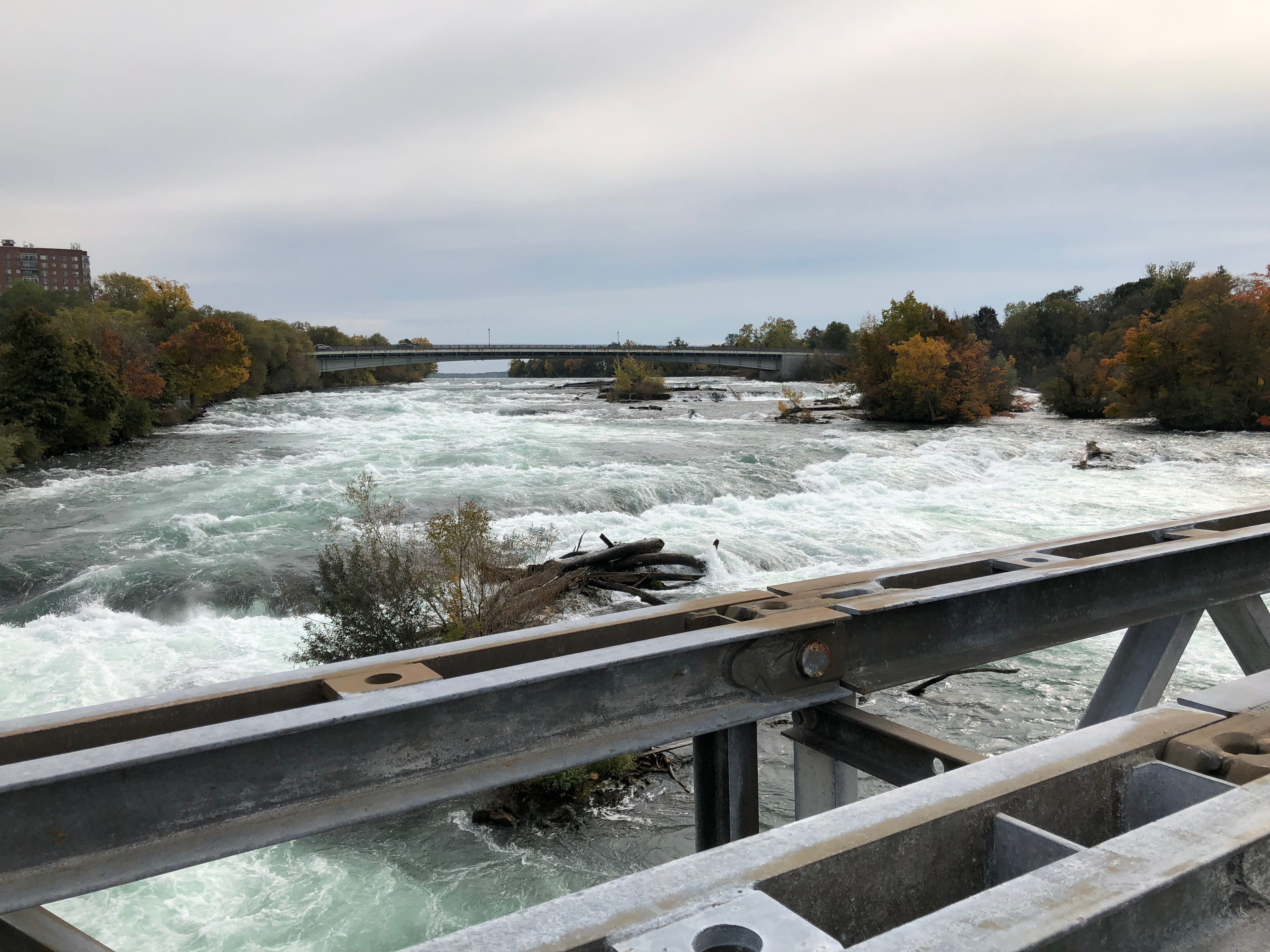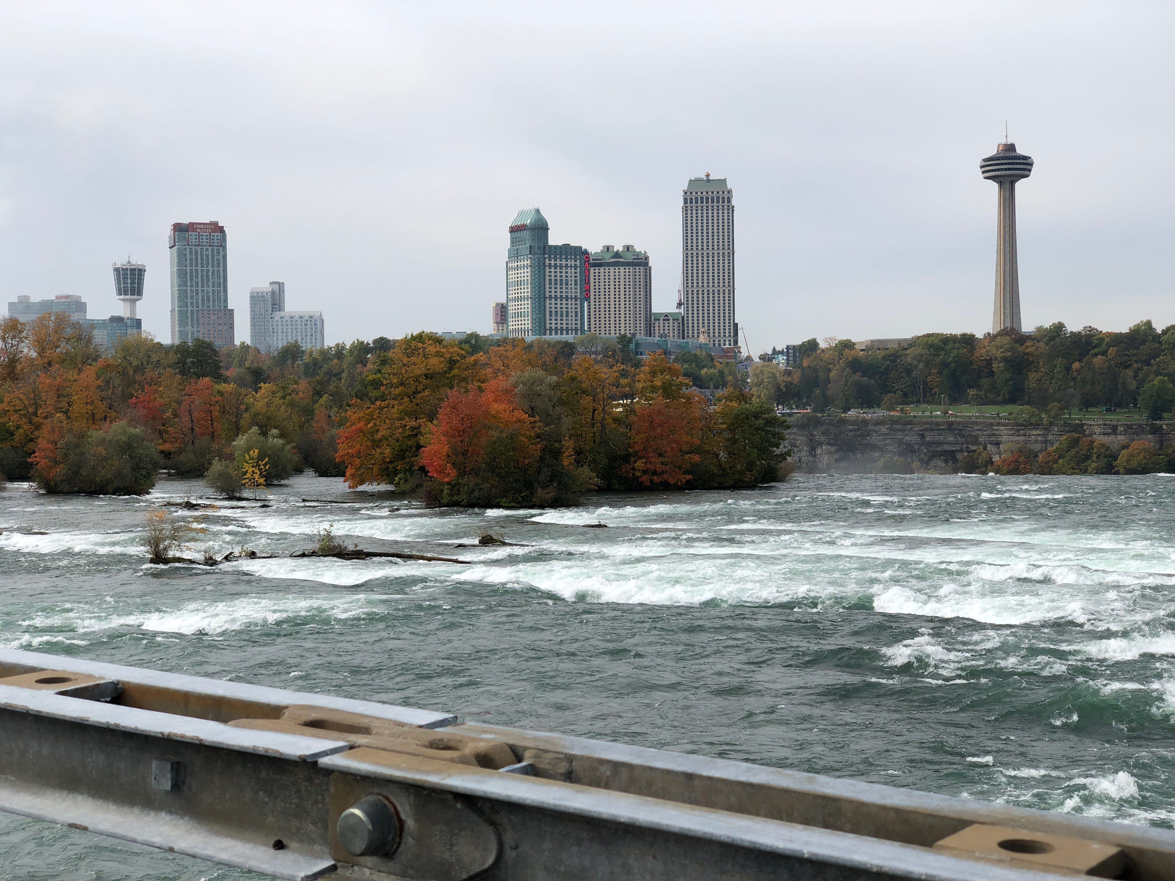 C’est assez impressionnant finalement, lorsque vous arrivez non loin des chutes, d’apercevoir déjà la vapeur d’eau générée par ces dernières, alors qu’il vous reste encore de nombreuses minutes de route avant de franchir la barrière du parc. Assez enthousiastes à l’idée d’enfin pouvoir se dégourdir franchement les jambes, nous descendons de voiture, rassemblons nos affaires et partons en direction des chutes, à pied. A quelques mètres du parking, le courant est vraiment impressionnant, en amont des chutes américaines et c’est après avoir pris quelques clichés de cet endroit que nous décidons de prendre la pleine mesure des chutes en les découvrant d’en bas, depuis le bateau.