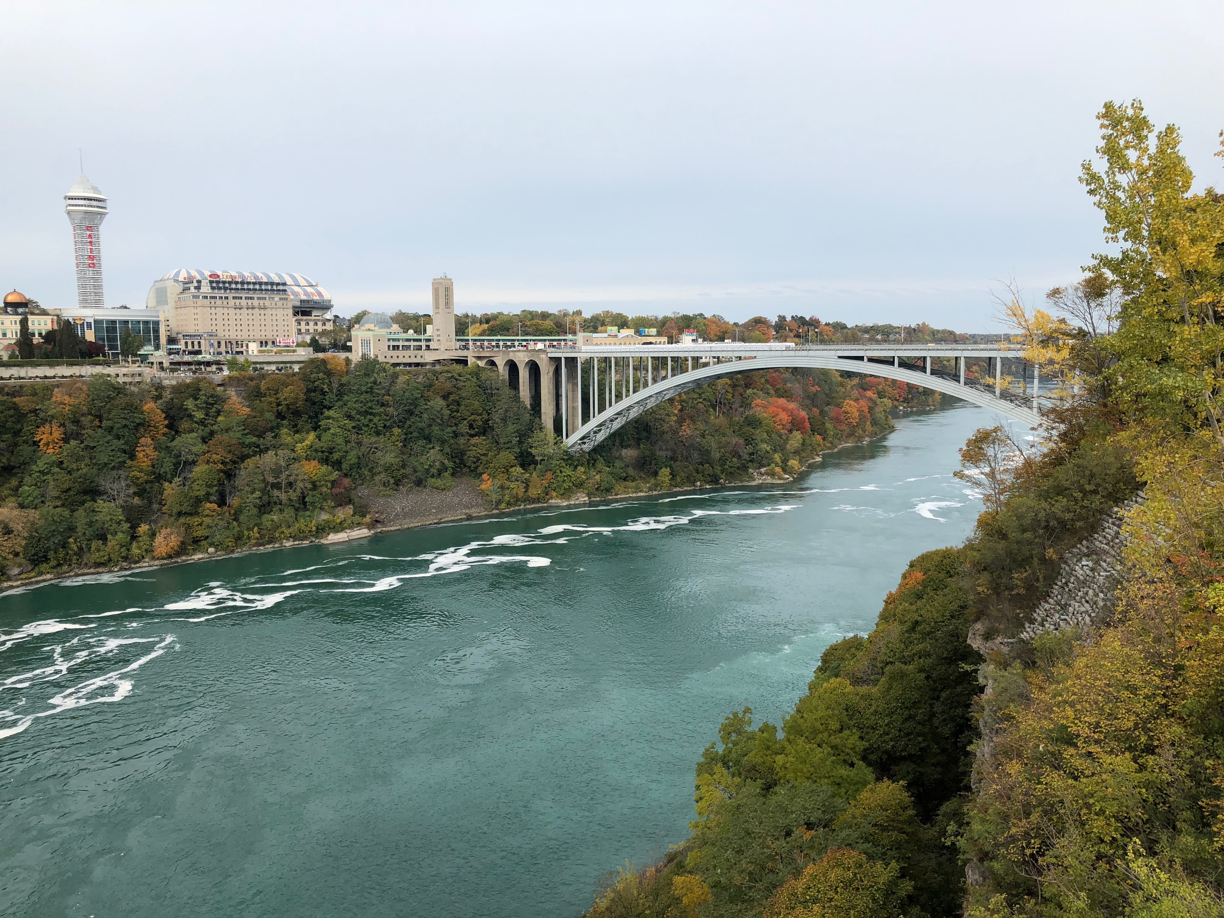 Mais Elle connaissait déjà plutôt bien cet endroit, et Il ne demandait qu’à voir probablement la plus belle exposition des chutes, à savoir la vue depuis le côté canadien. Nous sommes donc allés jusqu’à la frontière à pied, et après avoir traversé le poste de garde, et montré patte blanche, nous avons marché le long des chutes jusqu’au Horseshoe. A ce moment-là, et plus nous avancions, plus l’eau tombait fort. Nous aurions pu croire qu’il pleuvait, mais il s’agissait uniquement des retombées des chutes. C’est donc dans des conditions dantesques que nous avons fait quelques clichés et une vidéo pour notre film souvenir et que nous sommes ensuite revenus vers la frontière américaine. C’est là que nous avons retrouvé le côté commercial des Etats-Unis, puisque pour franchir la frontière, il faudra vous affranchir, et uniquement au retour, d’un dollar (en monnaie!), aussi symbolique que de trop… A cela s’ajoute le passage devant les agents du poste frontière, et nous revoilà côté américain. Encore un peu mouillés, c’est vers un petit restaurant sans prétention mais néanmoins correct que nous nous dirigerons pour faire une pause bien méritée.