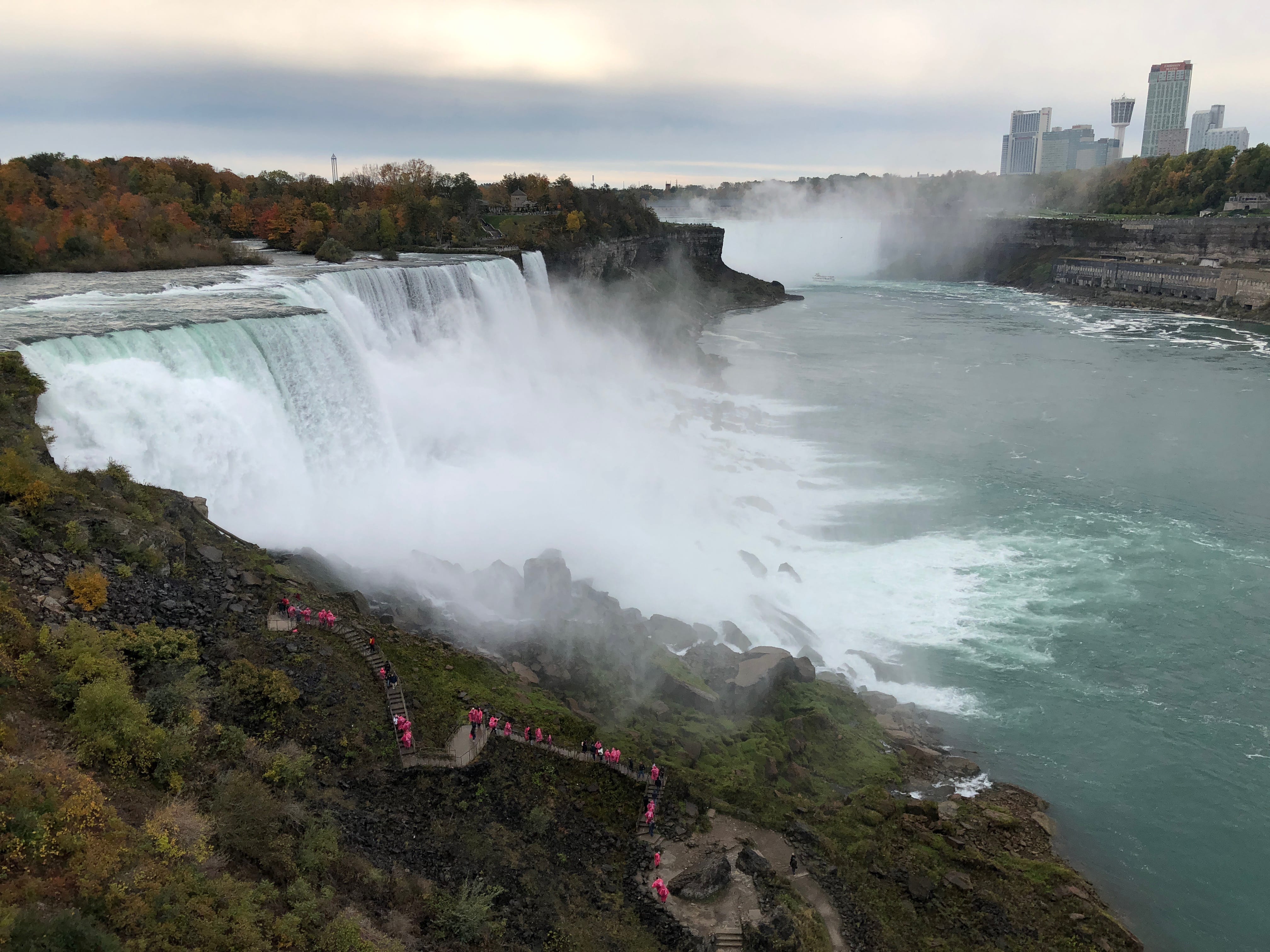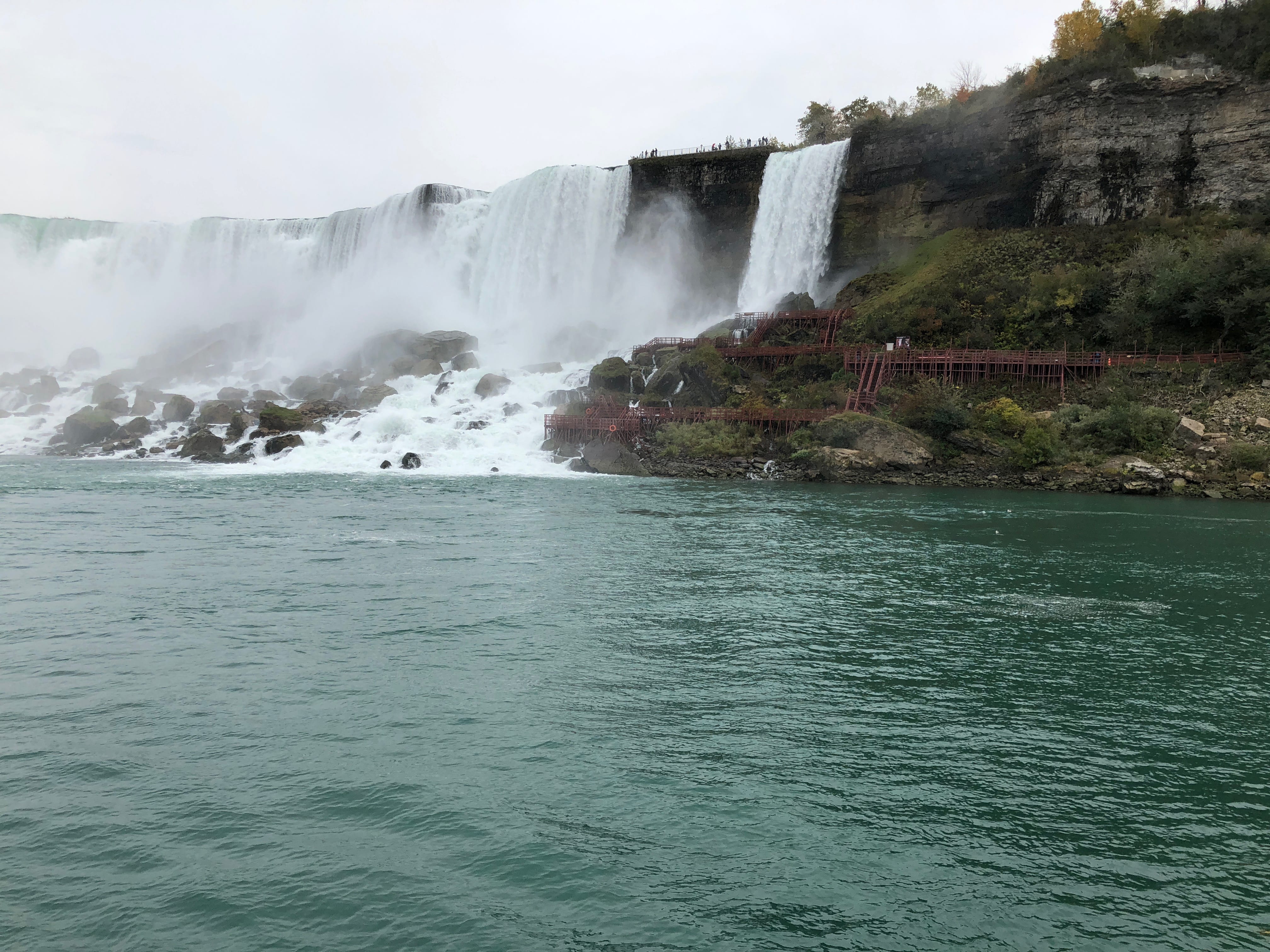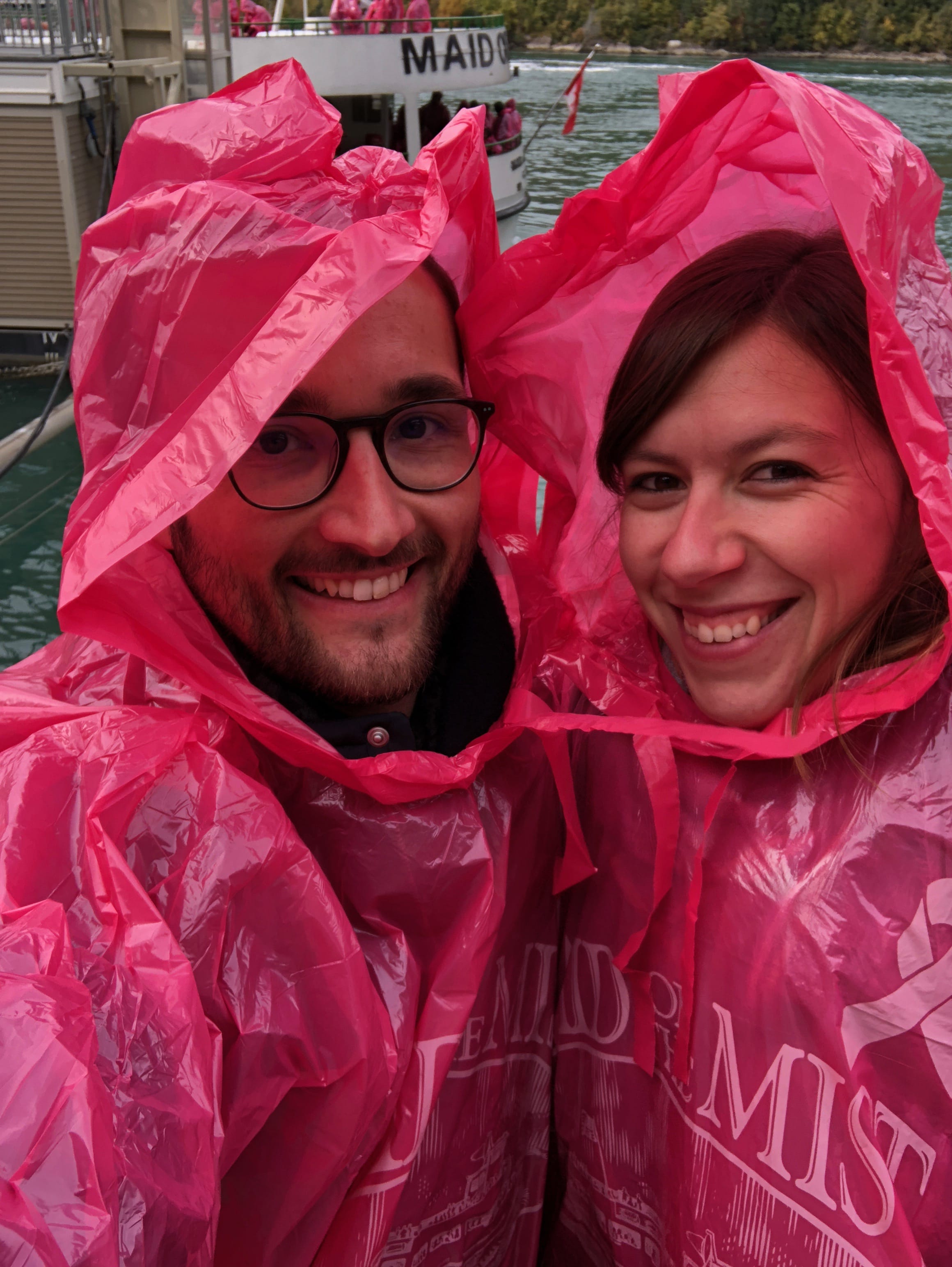 Une fois les billets pour le bateau achetés, nous apprécions la vue magnifique qui s’offre à nous depuis le belvédère, et nous ne sommes pas encore au bout de nos surprises. La petite subtilité est qu’il est possible de différencier les visiteurs des chutes sur les bateaux en fonctions de leurs ponchos plastiques. Côté Américain, c’est d’habitude le bleu qui prime, tandis que côté Canadien c’est le rouge qui a été choisi. Seulement, en pleine période d’octobre rose, mettant en avant la lutte contre le cancer du sein, nous nous sommes retrouvés emballés dans de superbes protections roses, et sommes malgré tout restés motivés pour apprécier pleinement ce moment. La découverte des chutes depuis le bateau est assez difficile à expliquer et appréhender sans l’avoir vécu, mais nous nous souvenons encore avoir ressenti une infime partie de la puissance de l’eau à cet endroit, et si vous ne l’avez jamais fait, nous ne pouvons que vous recommander l’expérience. A noter que nous avons été agréablement surpris tout au long de notre balade par le respect et la sympathie des différents touristes présents, laissant à chacun l’opportunité de faire ses clichés.