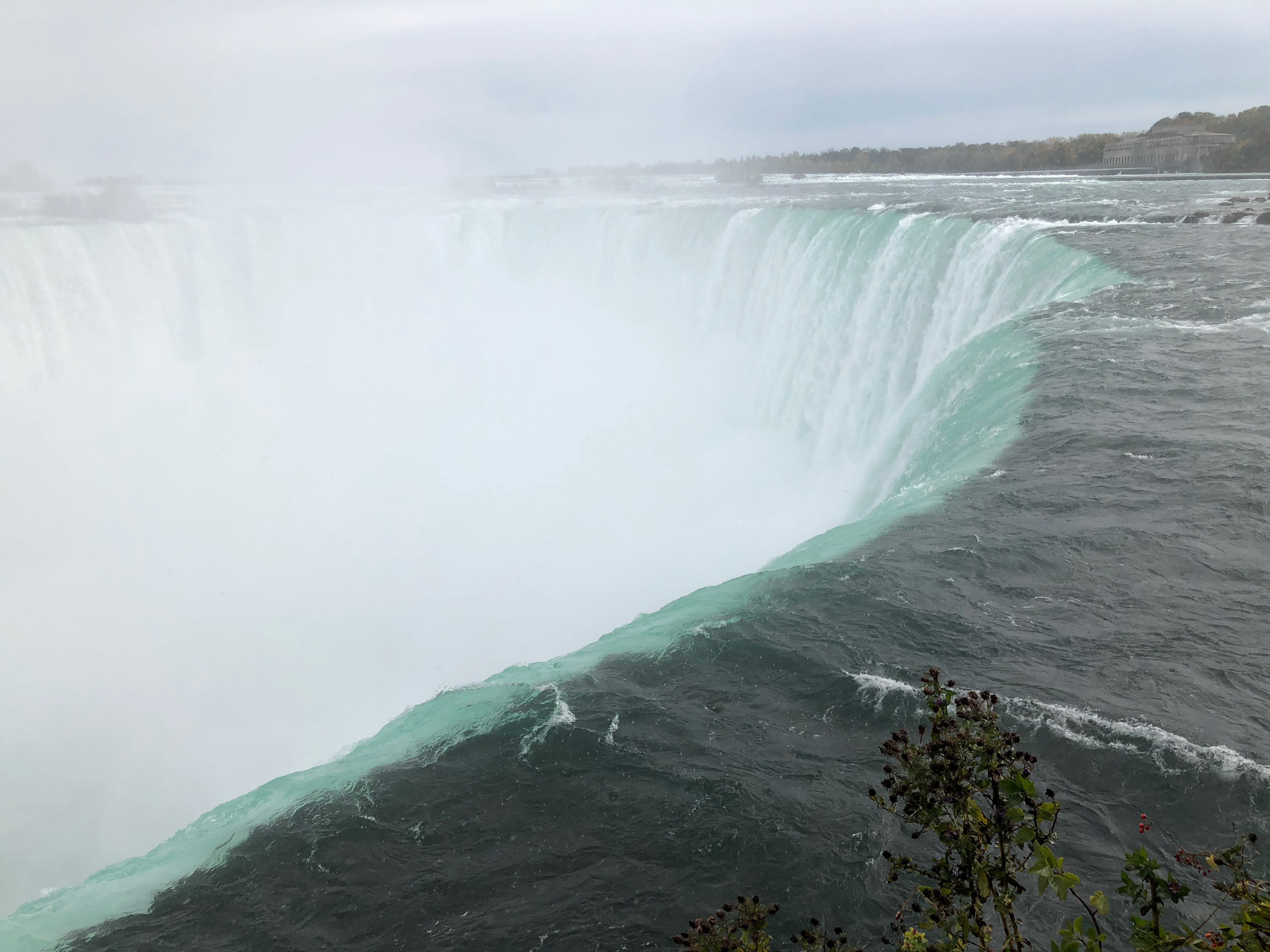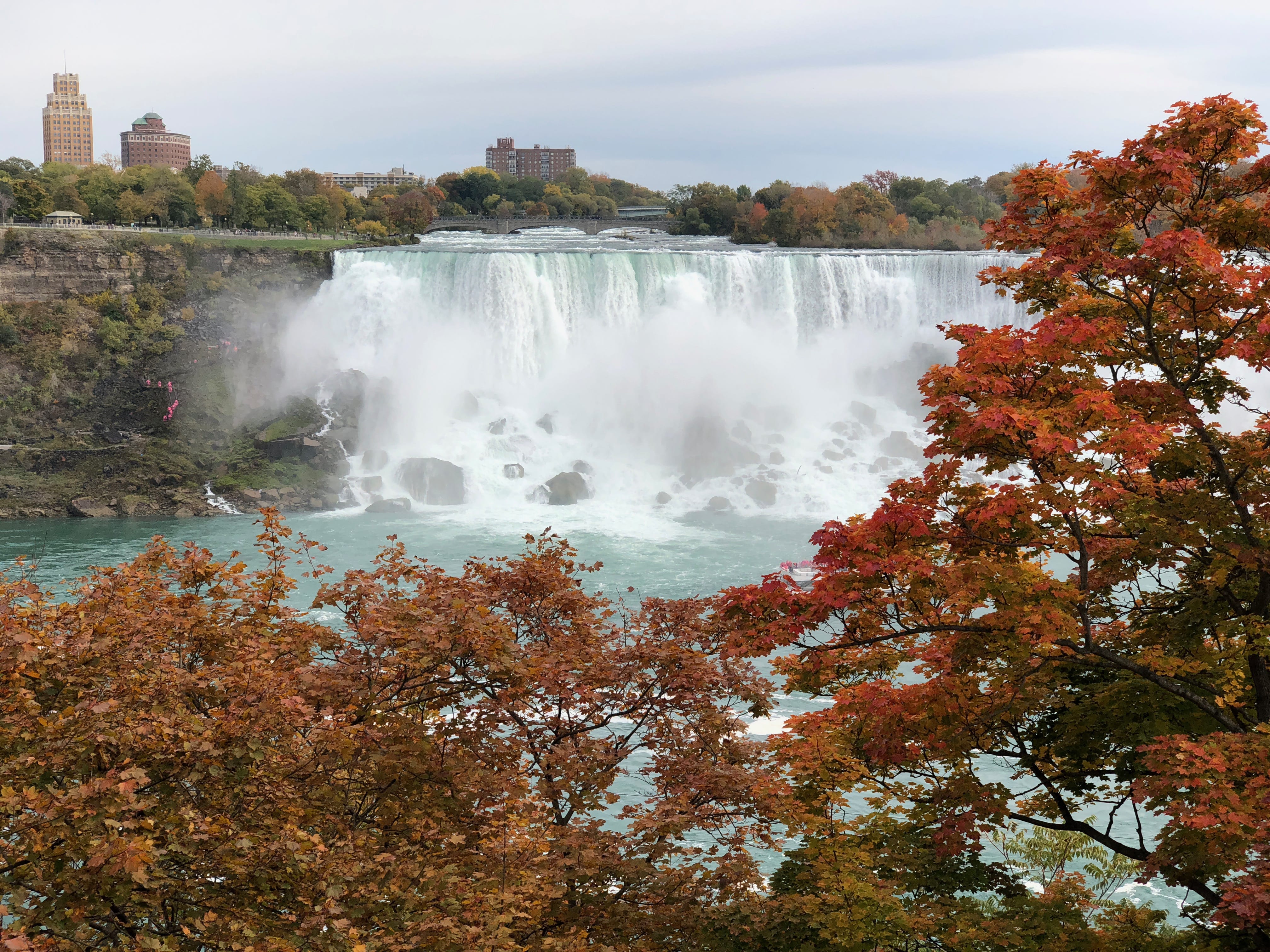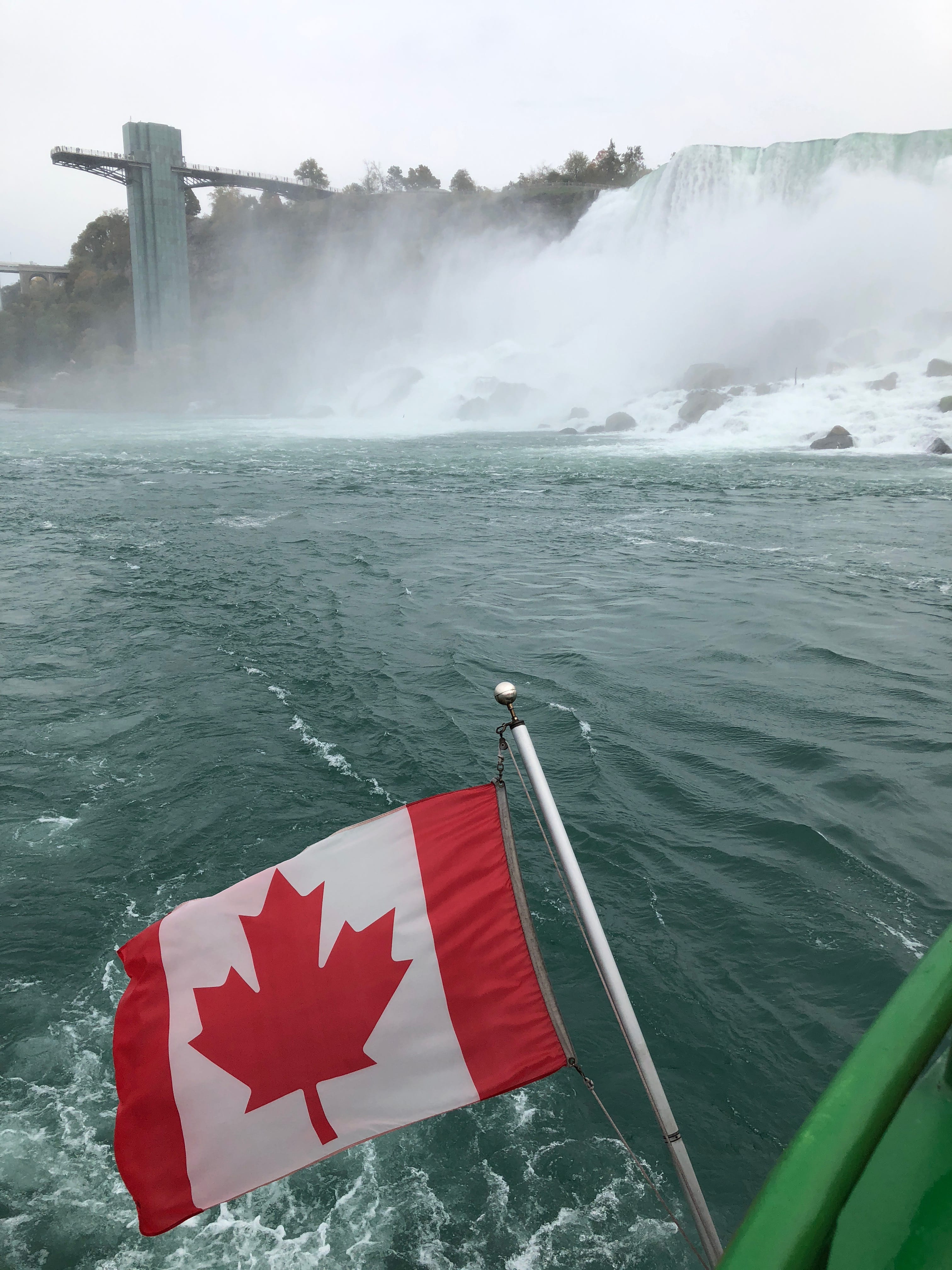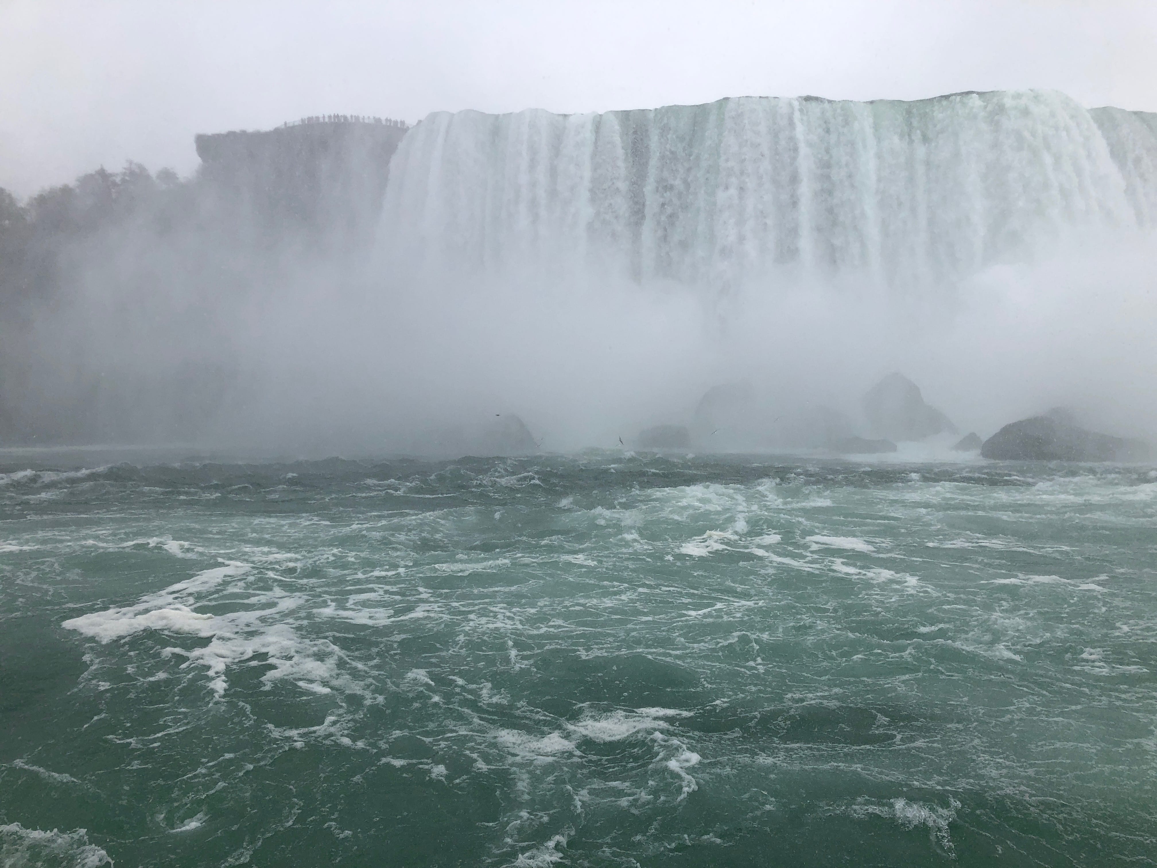 Une fois les billets pour le bateau achetés, nous apprécions la vue magnifique qui s’offre à nous depuis le belvédère, et nous ne sommes pas encore au bout de nos surprises. La petite subtilité est qu’il est possible de différencier les visiteurs des chutes sur les bateaux en fonctions de leurs ponchos plastiques. Côté Américain, c’est d’habitude le bleu qui prime, tandis que côté Canadien c’est le rouge qui a été choisi. Seulement, en pleine période d’octobre rose, mettant en avant la lutte contre le cancer du sein, nous nous sommes retrouvés emballés dans de superbes protections roses, et sommes malgré tout restés motivés pour apprécier pleinement ce moment. La découverte des chutes depuis le bateau est assez difficile à expliquer et appréhender sans l’avoir vécu, mais nous nous souvenons encore avoir ressenti une infime partie de la puissance de l’eau à cet endroit, et si vous ne l’avez jamais fait, nous ne pouvons que vous recommander l’expérience. A noter que nous avons été agréablement surpris tout au long de notre balade par le respect et la sympathie des différents touristes présents, laissant à chacun l’opportunité de faire ses clichés.