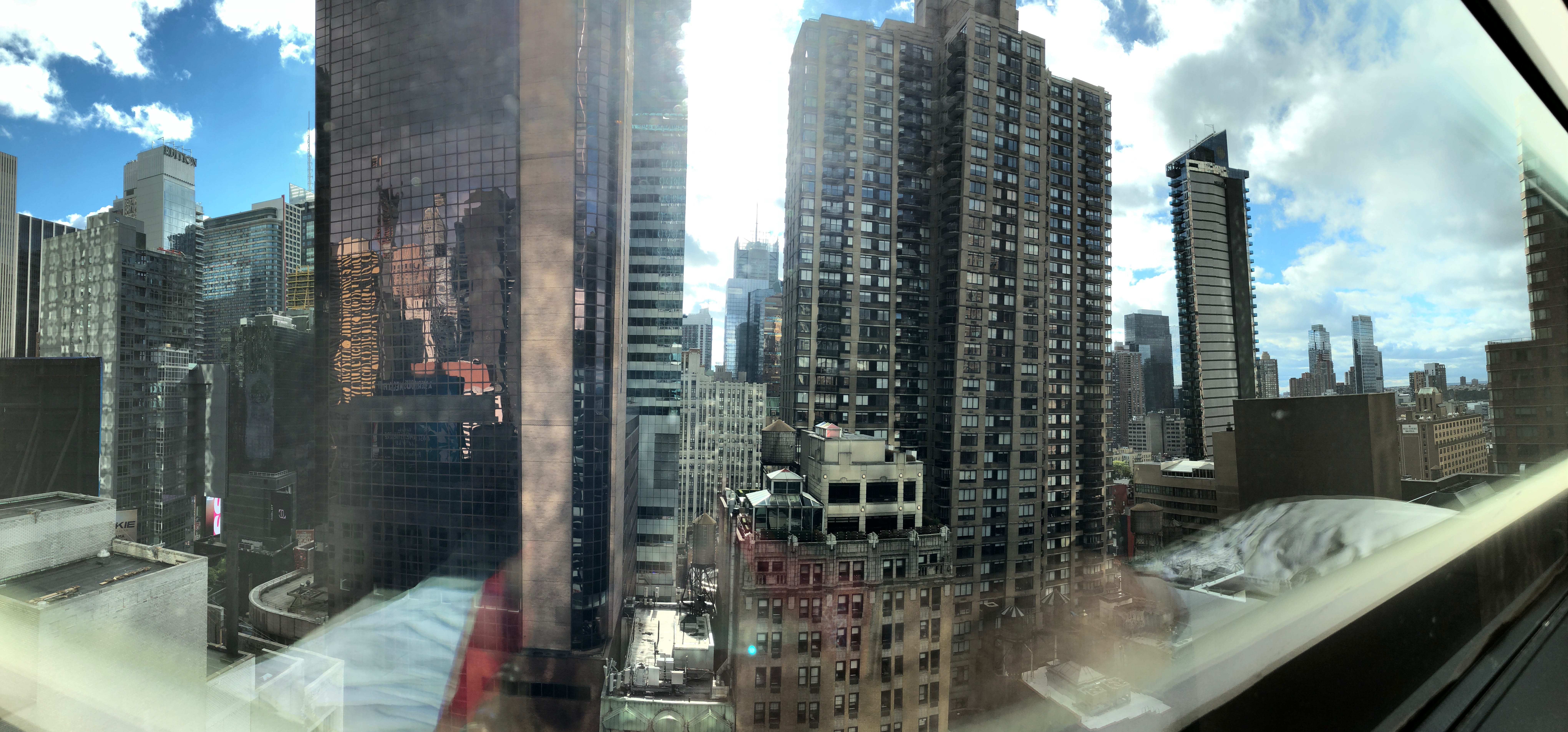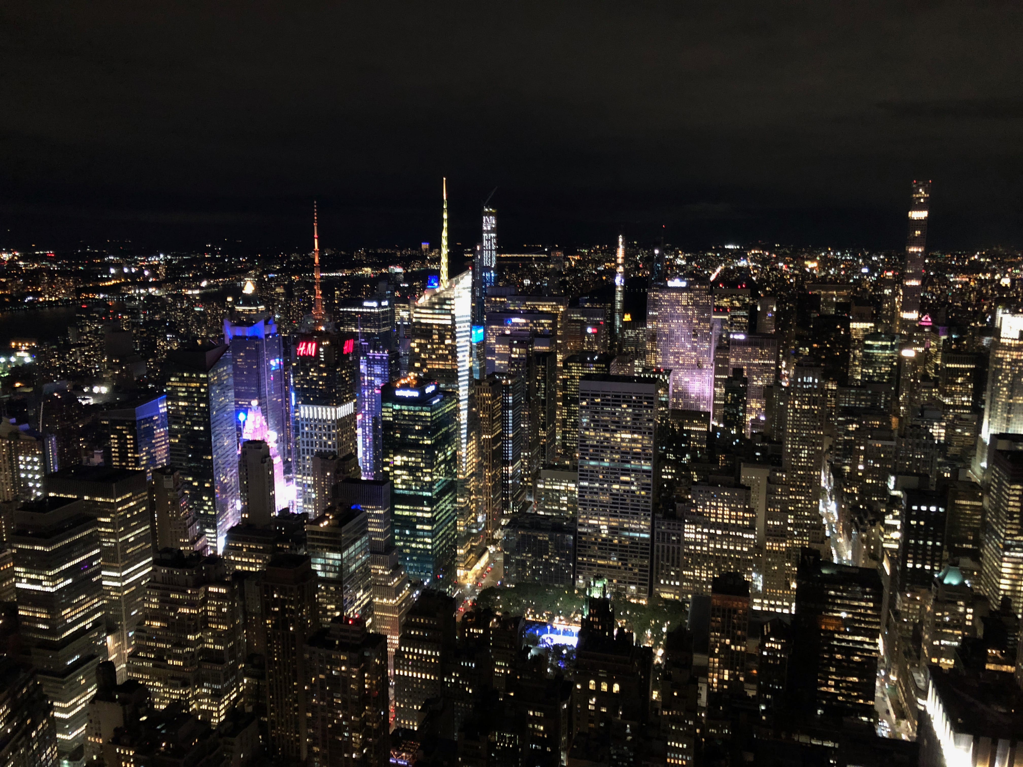 Après avoir longé une bonne moitié du très réputé Central Park, poumon vert de la ville, nous avons atteint l’endroit où nous devions rendre la voiture, et pouvions ainsi poursuivre à pied. Un bref aller retour pour aller rendre les clés du véhicule restées dans notre sac… Et nous voilà partis, Drew en tête pour nous guider, jusqu’à l’Hudson et en faisant un passage par le fameux Dylan’s Candy Bar, temple du bonbon. Nous n’avions pas prévu de rester bien longtemps groupés, ce dernier ayant prévu de rejoindre les amis devant l’héberger jusqu’à son départ, mais cela nous aura au moins permis de prendre nos premières marques dans cette immense ville grouillante de vie. Après avoir laissé Drew s’enfoncer dans une bouche de métro, nous avons rejoint l’hôtel pour le traditionnel check-in. Mention spéciale à celui-ci qui nous aura tout de même réservé une petite attention pour notre lune de miel en nous offrant un verre en amoureux sur leur rooftop avec une jolie vue sur la ville, surtout de nuit.