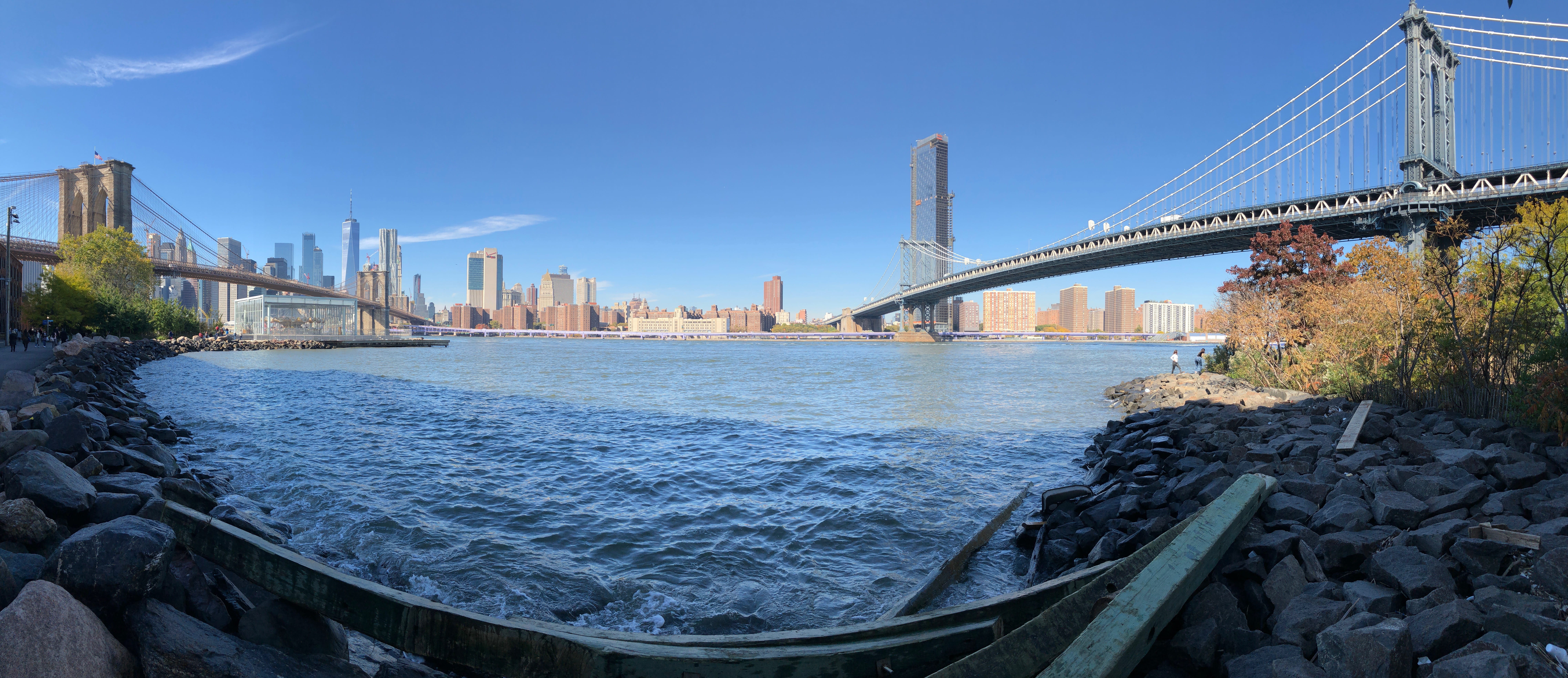 C’est vers le nouveau quartier branché de DUMBO que nous nous dirigeons maintenant. Si son nom peut vous rappeler un célèbre éléphant, il s’agit en fait d’un acronyme, comme plusieurs autres quartiers de NYC d’ailleurs. C’est la version courte de Down Under the Manhattan Bridge Overpass, d’où vous pouvez d’ailleurs bénéficier de magnifiques vues sur la ville, dont nous avons profité après avoir quitté notre guide. Comme de nombreux quartiers de New-York initialement en désuétude, DUMBO a été pendant un temps, le centre d’intérêt des artistes. En effet, lorsque les quartiers sont peu attractifs, les loyers sont beaucoup plus abordables, ce qui permet aux artistes souvent dans des situations précaires, de trouver un logement. Ce sont souvent des lofts, qu’ils retapent et rénovent avec tout le talent qu’ils possèdent. Ce qui, indubitablement, attire à nouveau les gros porte-feuilles qui aiment ces endroits rafraîchis, rajeunis et modernisés. Mais malheureusement pour ceux à qui ils doivent cette nouvelle attractivité, les loyers réaugmentent, et il leur faut trouver un nouveau quartier et un nouveau projet. Après avoir appris tout cela, et fait LA photo qu’il faut faire à DUMBO : l’immanquable Empire State en plein milieu de l’arche du Manhattan Bridge (cliquez sur la photo, il paraît si petit vu d’ici…), nous nous poserons le long de l’Hudson : un bon moment pour retrouver les choses simples que l’on aime tant parfois dans nos voyages. Et réaliser que petit à petit, notre voyage se termine.