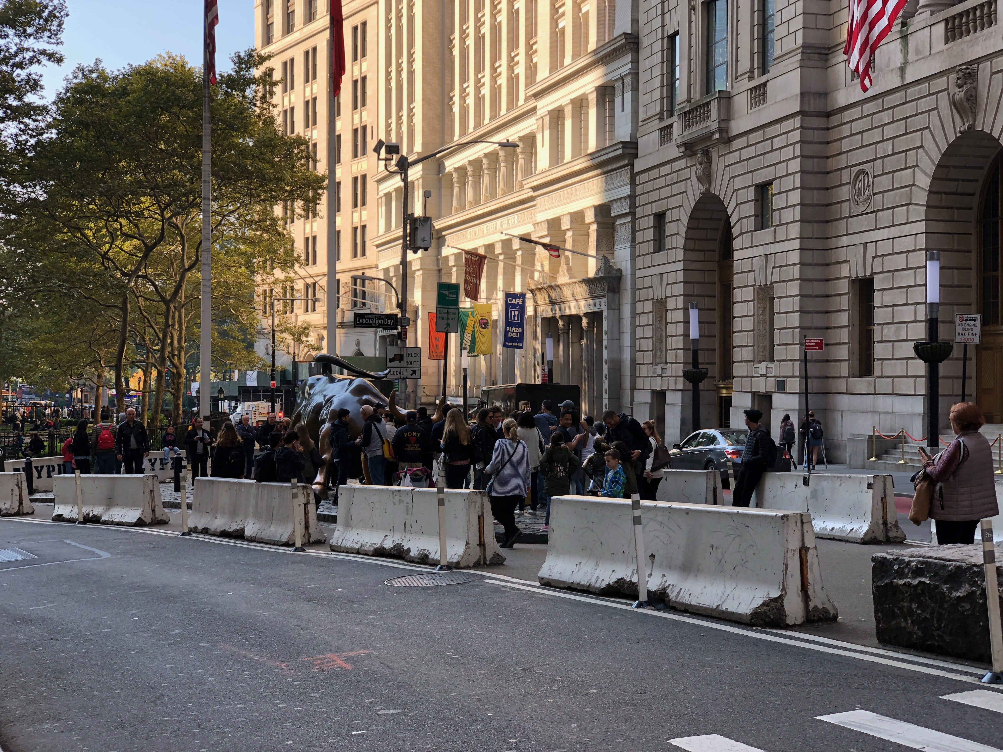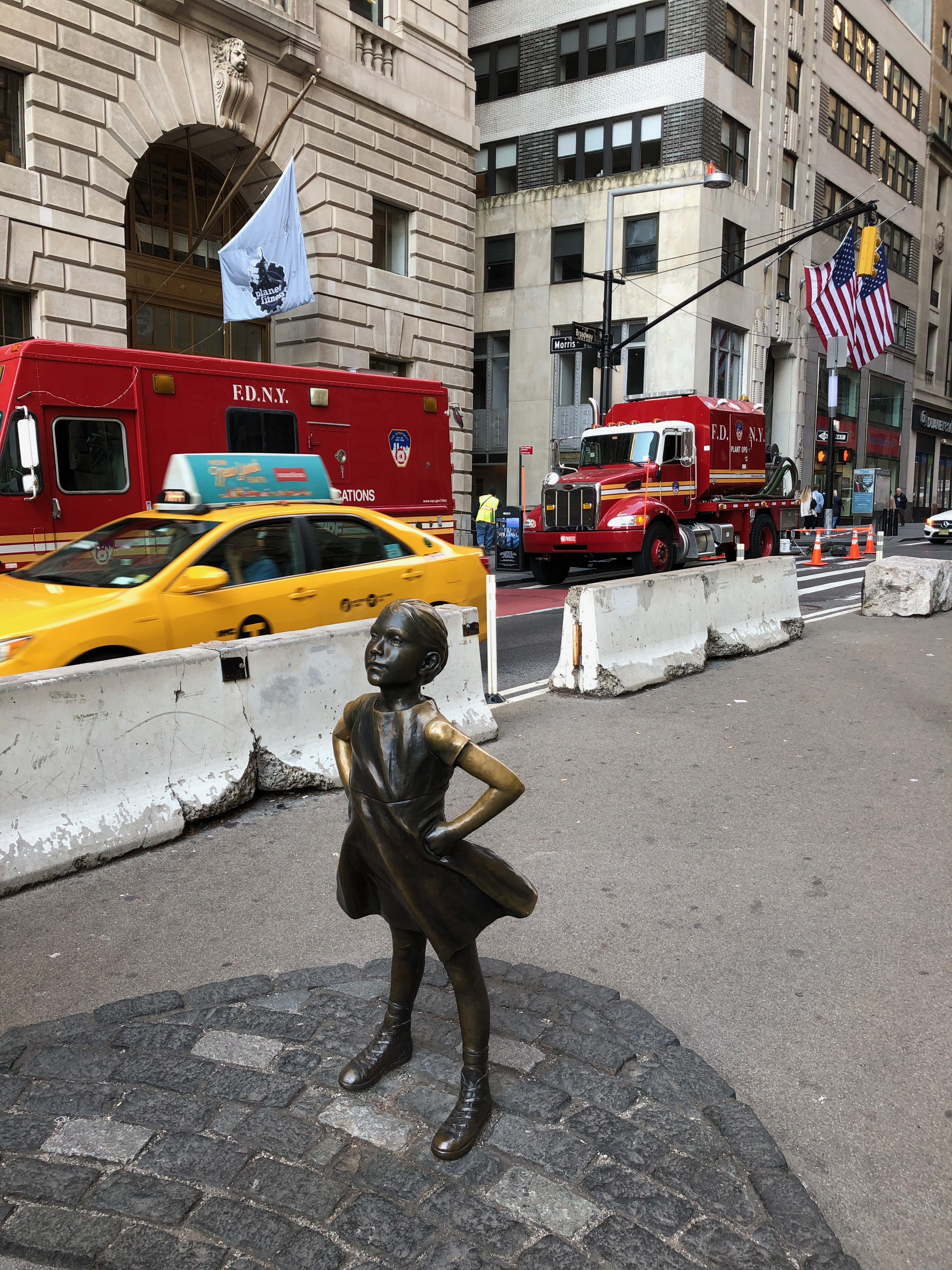 Wall Street est d’ailleurs notre destination suivante, pour y apercevoir deux statues malheureusement aussi connues des guides de voyages que par extension des touristes, celle de la petite fille qui fait face au taureau. Paradoxalement, si les deux sont proches l’une de l’autre, nous avons réussi à avoir notre photo de la petite fille tandis que le taureau n’aura jamais bénéficié d’une seule seconde sans personne et aura eu raison de notre patience.