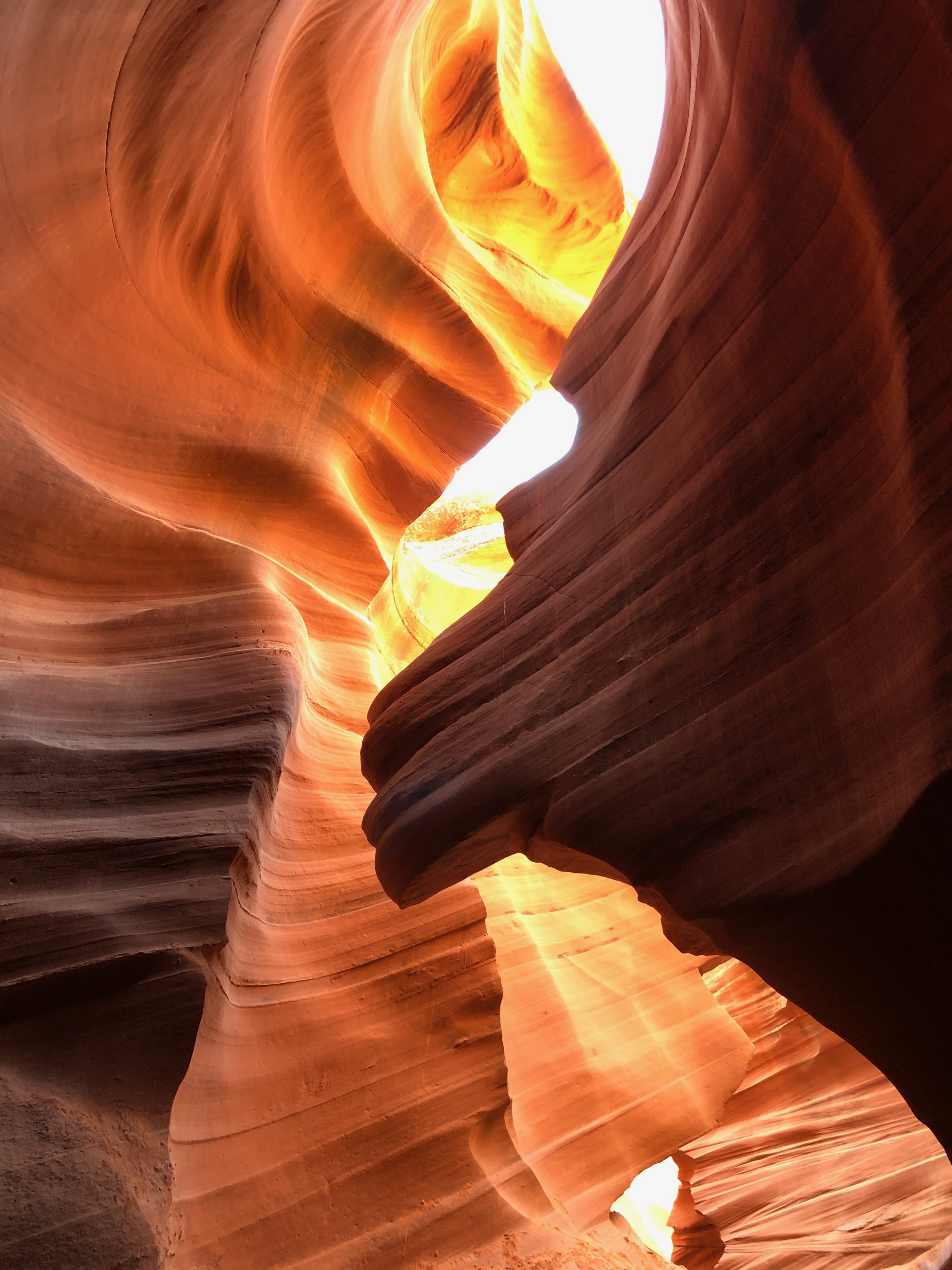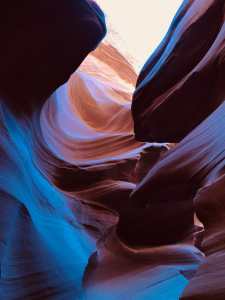 11h30, nous avons choisi Lower Antelope Canyon, parce que pas de trajet en pickup pour le rejoindre depuis la billetterie, qu’il était à priori plus complet et impressionnant que son grand frère, et parce qu’il fallait bien faire un choix… Notez juste qu’ici, afin d’éviter toute confusion avec les horaires de visite, et bien que cette réserve soit en territoire Navajo, l’horaire de référence est celui de l’Arizona, et non le Mountain Time. Des théories existent sur le meilleur moment pour le visiter, en fonction de l’ensoleillement et des possibles reflets à obtenir sur vos clichés. Il est cependant important de signaler que, même si les guides vous donnent plein d’informations à la fois historiques, géologiques ou même spirituelles, ils vous apprennent aussi à bien exploiter vos différents appareils, afin d’obtenir des clichés toujours assez réussis. Mais ces derniers peuvent être parfois bien éloignés de la réalité en termes de rendus de couleurs, ce qui n’en fait pas pour autant de magnifiques souvenirs par la suite. C’est assez surprenant de voir à quel point vous redécouvrez parfois vos réglages dans ce lieu plus qu’insolite et grâce à un guide aussi atypique qu’entreprenant avec votre smartphone.