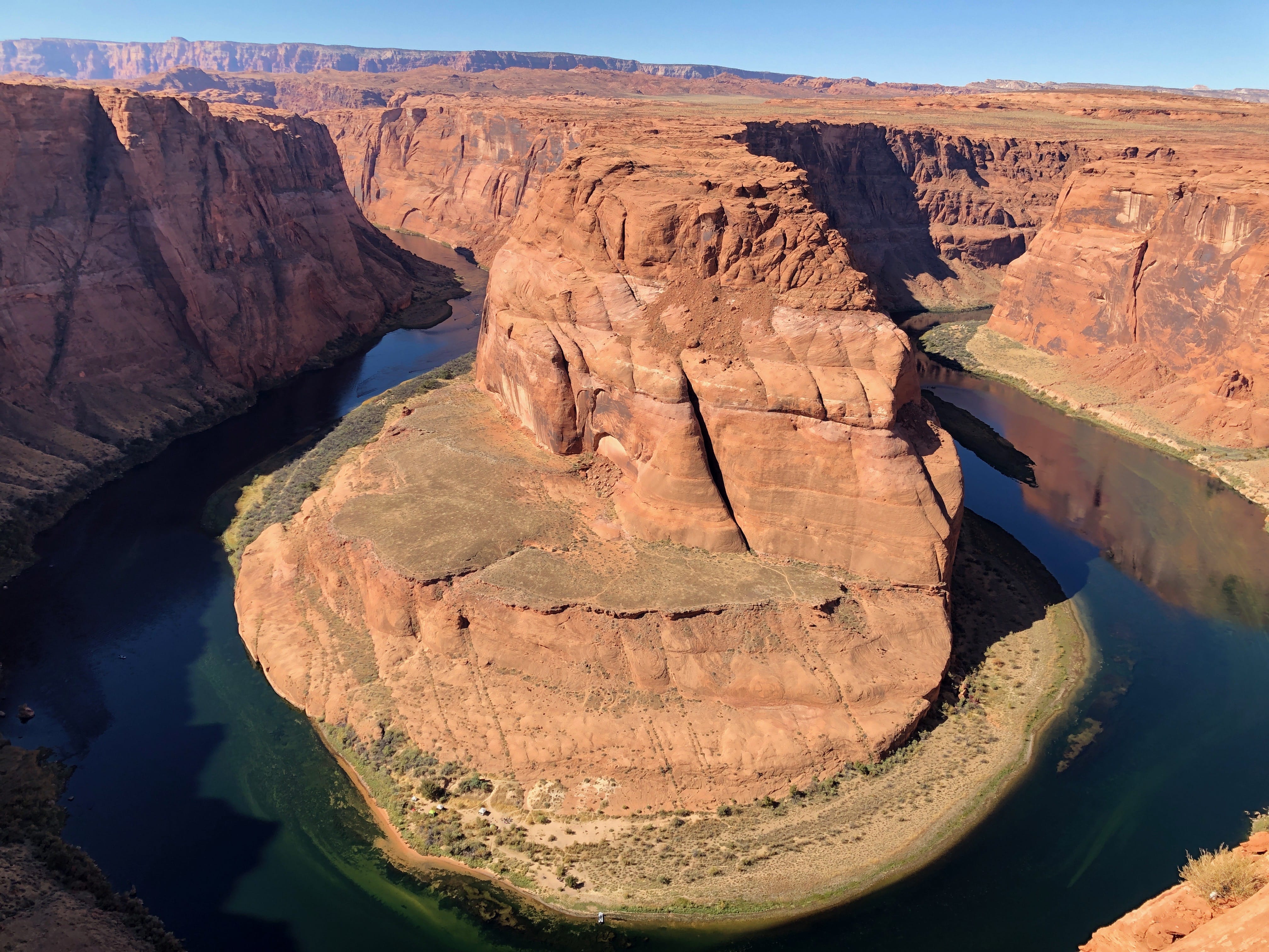 Après avoir profité un peu de l’ombre présente au point de départ et d’arrivée de l’excursion, nous reprenons la route en direction de Horseshoe Bend, autre point remarquable non loin de Page. Seul bémol, le parking est dorénavant payant, et il faudra donc s’acquitter d’un forfait unique pour espérer pouvoir laisser votre véhicule le temps de l’aller retour plutôt éprouvant qui vous sépare de ce panorama unique. La difficulté du chemin réside surtout dans le dénivelé et l’ensoleillement omniprésent ce jour-là faisant très rapidement monter la température et la fréquence cardiaque ! Mais une fois face au méandre, on en oublierait presque que la même chose nous attend au retour. Nous avions pris le parti de manger sur place, cela nous a donc permis de rentabiliser un peu le prix du parking et de se laisser séduire par la magie du lieu dont certains ne font que s’imprégner tout au plus avant de faire demi-tour. Dommage.