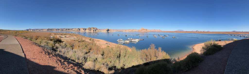 Lake Powell est pour les locaux comme pour d’autres d’ailleurs, une immense base de loisirs en tous genres, notamment nautiques. Nous pensons qu’il se révèle surtout à ceux qui peuvent prendre le temps de s’aventurer sur ses eaux magnifiques, car de ce que nous avons pu en voir depuis notre point d’observation, il n’y avait rien de totalement extraordinaire en comparaison avec tout ce que nous avions vu avant, mais forcément, la barre était déjà assez haut placée. Des formations rocheuses s’élevaient depuis les eaux du lac à certains endroits et promettaient de magnifiques découvertes à ceux pouvant les rejoindre. Cela nous aura quand même offert quelques beaux clichés et une belle petite pause, clairement à l’écart de l’agitation touristique présente depuis le début de la journée. Avis aux voyageurs en quête d’un peu de calme…