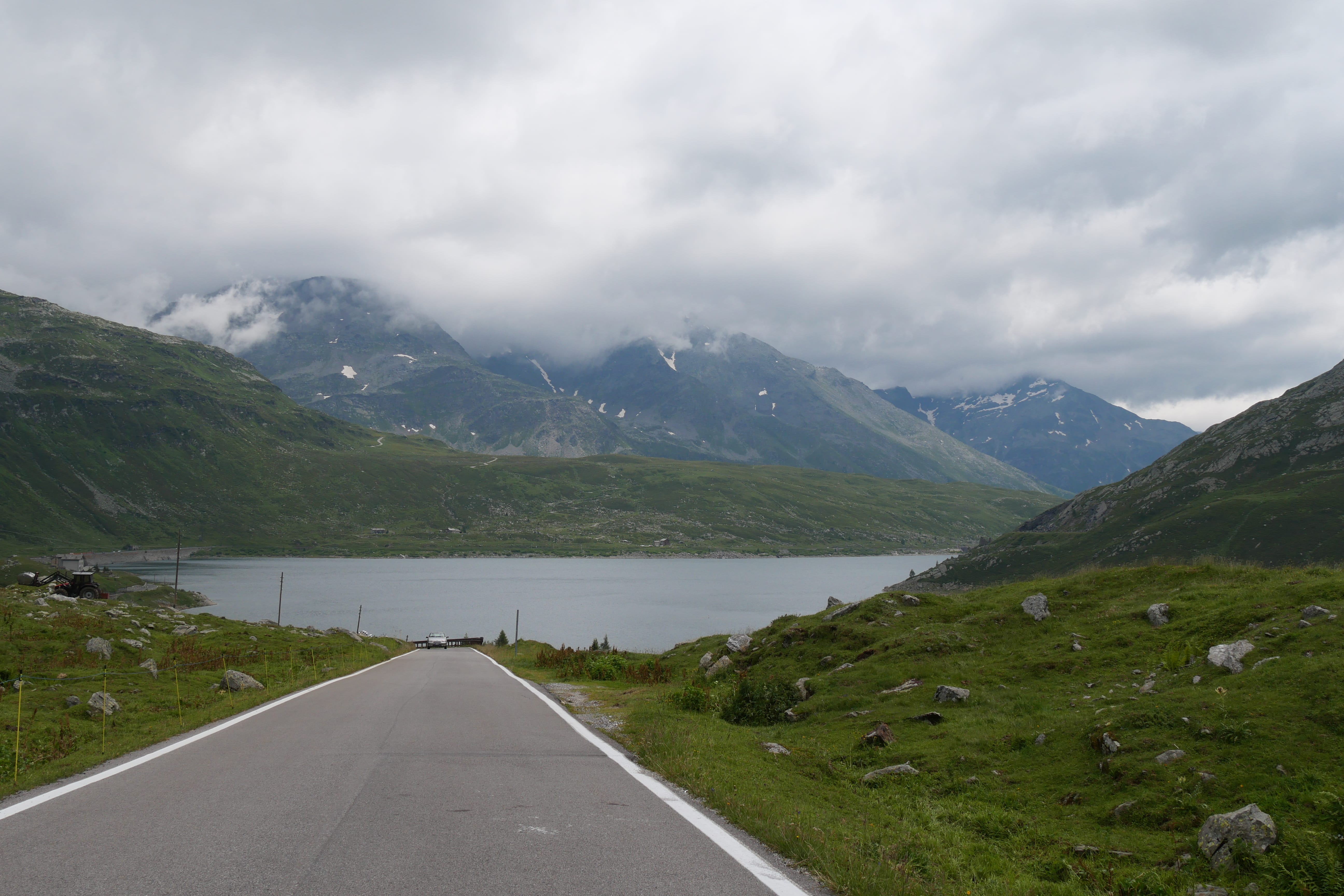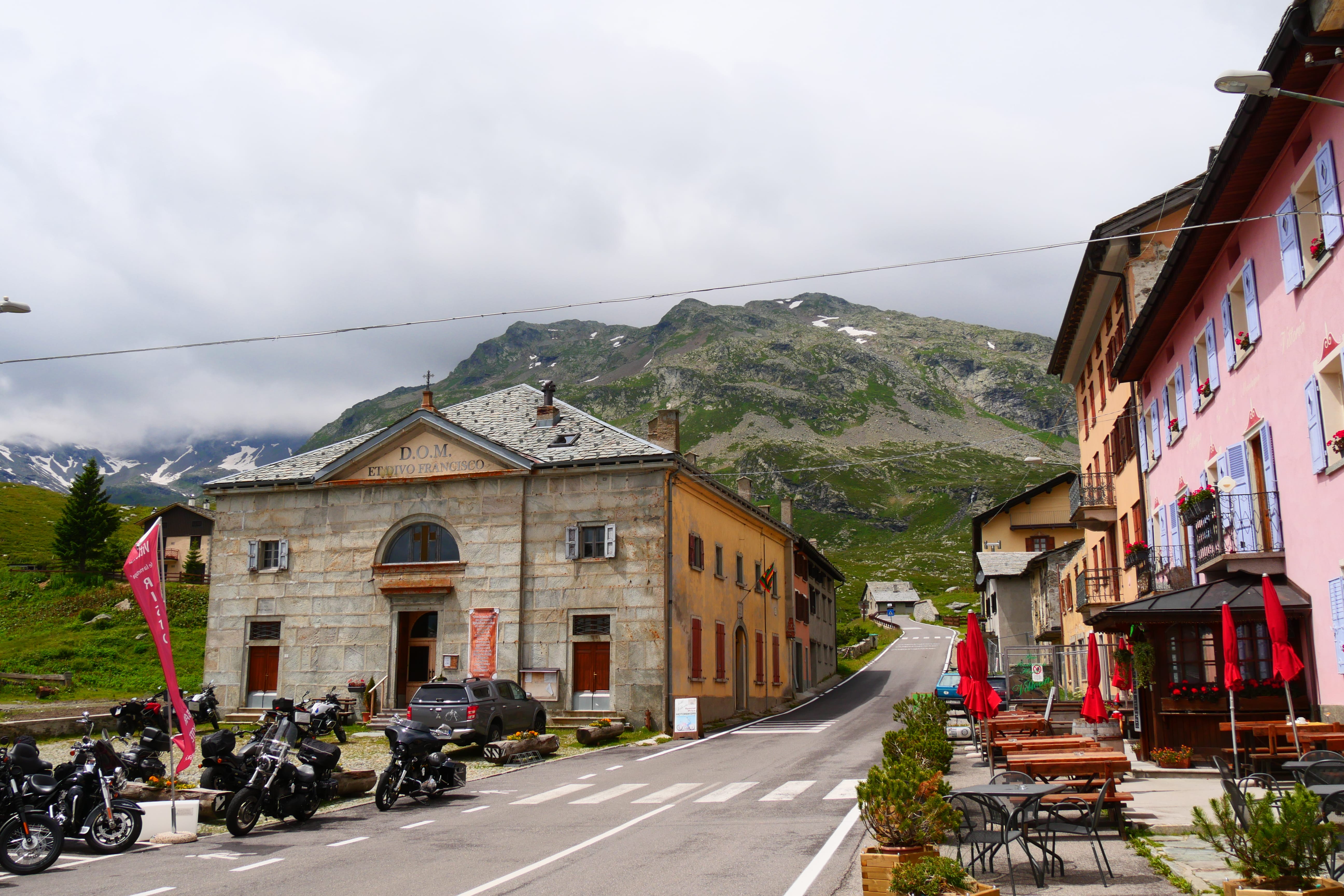 Notre Roadtrip commence par pas mal d’autoroute sans trop d’intérêt si ce n’est de rejoindre l’Italie. Heureusement, nous avions anticipé et étions partis relativement tôt, ce qui nous a permis de ne pas avoir de difficultés à traverser la frontière pour entrer en Suisse et ensuite arriver au plus vite dans la zone. Nous avions décidé, lors de la planification de l’itinéraire, d’éviter le tunnel du Gothard pour lui préférer le Col de Splügen, que nous n’avions jamais arpenté. Le dépaysement arrive dès l’arrivée dans le canton des Grisons. Les montagnes pointent le bout de leur sommet pour ne plus jamais nous lâcher, et on finit par en oublier les bouchons successifs liés au départ en vacances de plein d’autres Européens. C’est donc avec un peu de « retard » sur nos prévisions que nous arrivons dans la superbe ascension du Splügen, qui dès le début nous montre qu’il vaut le détour. Nous avons pris beaucoup de plaisir, même en voiture, à passer par là, prenant le temps de s’arrêter dans l’ascension, puis au sommet, le temps de quelques clichés, puis dans le village de Montespluga, côté italien, pour déjeuner. On retrouve ainsi le typique village de montagne italien, relais des cyclistes et motards, et point de vue privilégié sur les montagnes alentours et le lac éponyme.