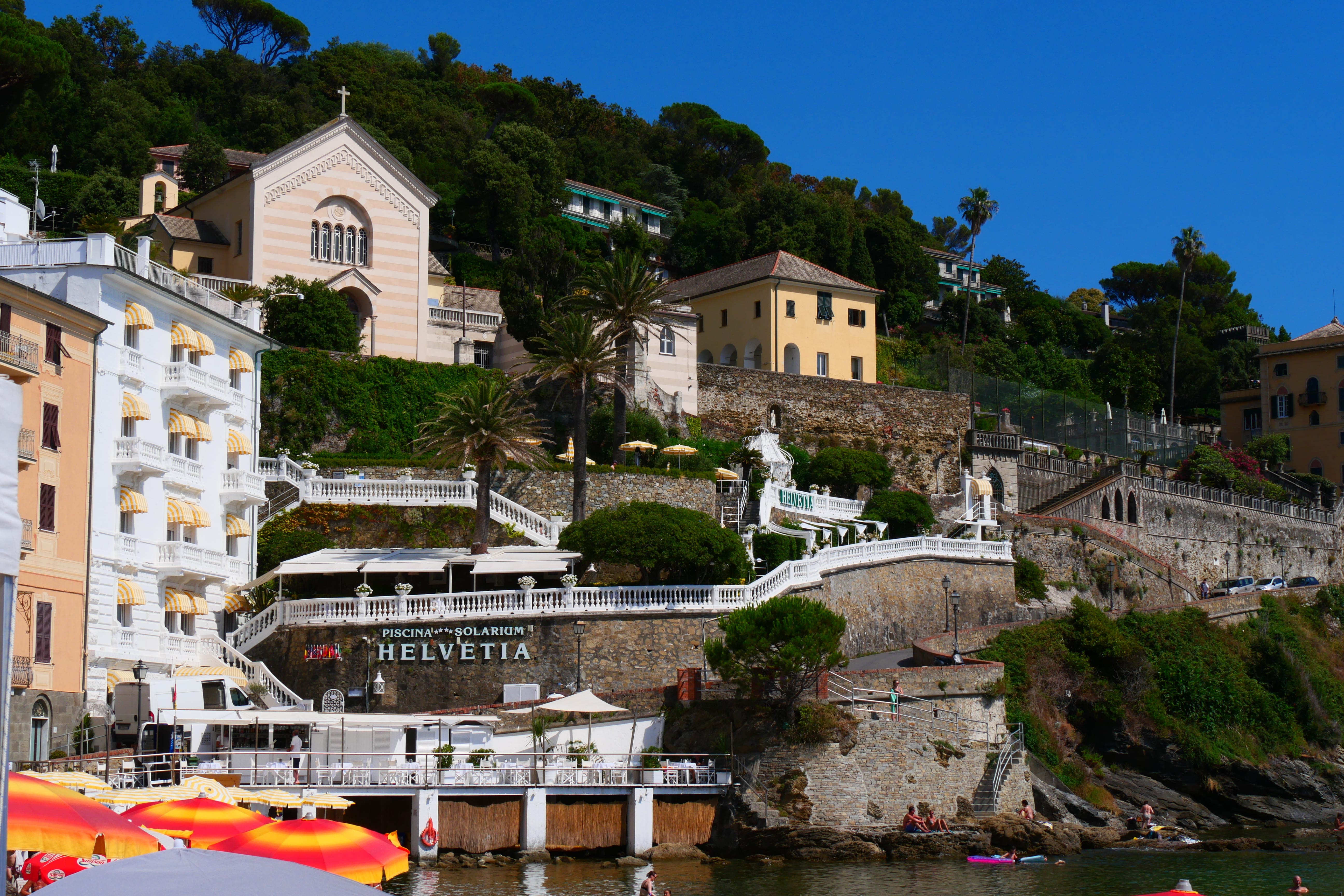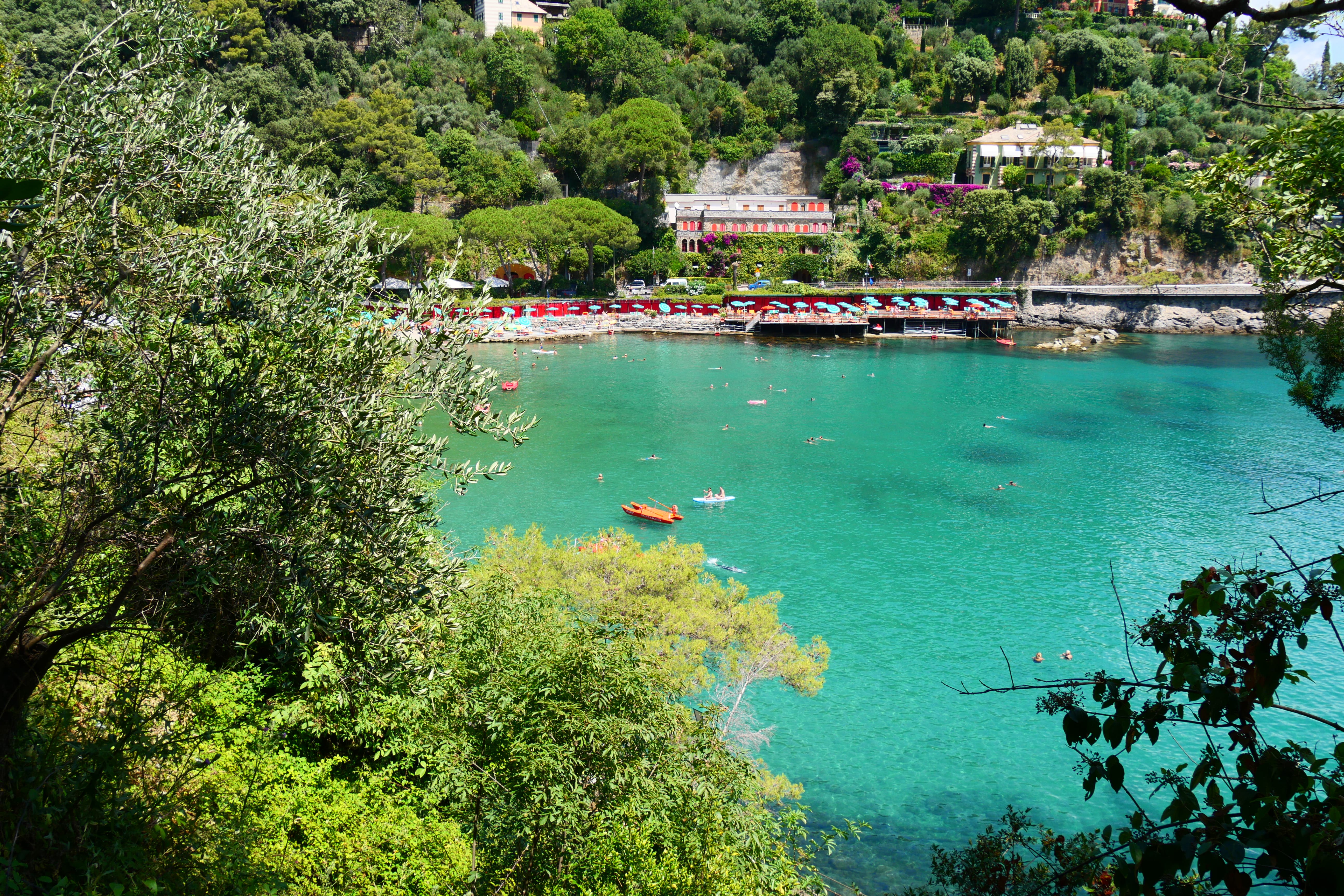 Avant de quitter le cœur de la ville, nous passerons encore par la Chiesa San Martino que nous avions aperçue du bus en arrivant. En face, de l’autre côté de la route, commence la Passeggiata dei Baci (chemin des bisous) qui mène jusqu’à Santa Margherita Ligure, d’où nous venons, et se termine à Rapallo. Nous n’en parcourrons qu’un morceau pour rejoindre la plage de Paraggi, plage principale de Portofino. La portion de chemin se fait à l’ombre, en une quarantaine de minutes et offre de beaux points de vue sur les nuances de bleu de l’eau et sur la côte en contrebas. C’est une balade agréable, qui permet d’appréhender cette visite un peu différemment. De plus, dès qu’on s’éloigne un peu, et ça nous l’avons remarqué partout, il n’y a plus personne. Nous avons fait ce trajet en croisant moins de dix personnes et en nous évitant un trajet dans le bus bondé.
