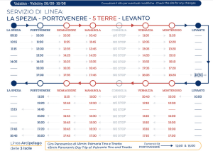 - en train : un trajet coûte 4€ par personne ou bien il existe la Cinque Terre Train Card qui associe sentiers et train pour 16€ pour un jour