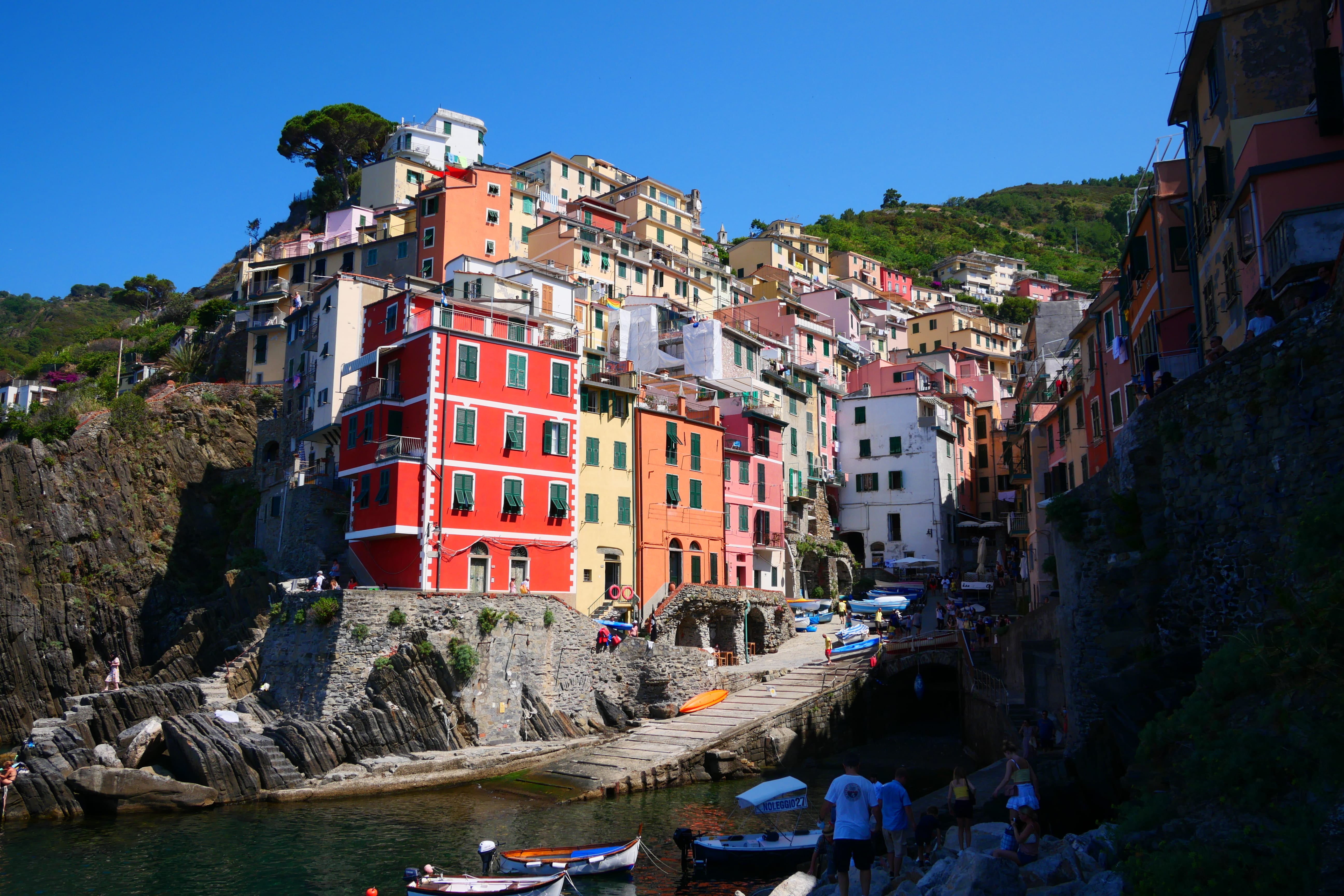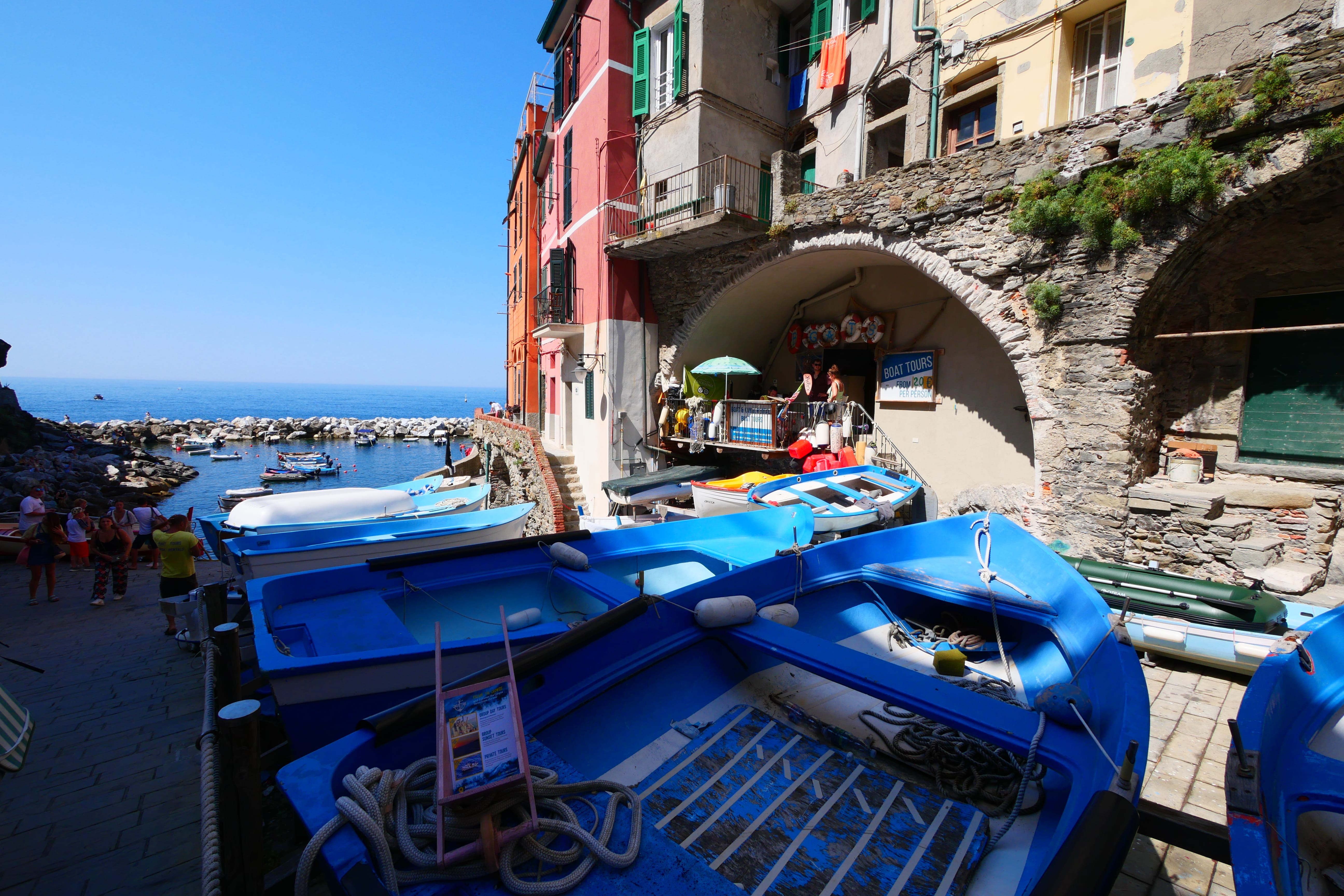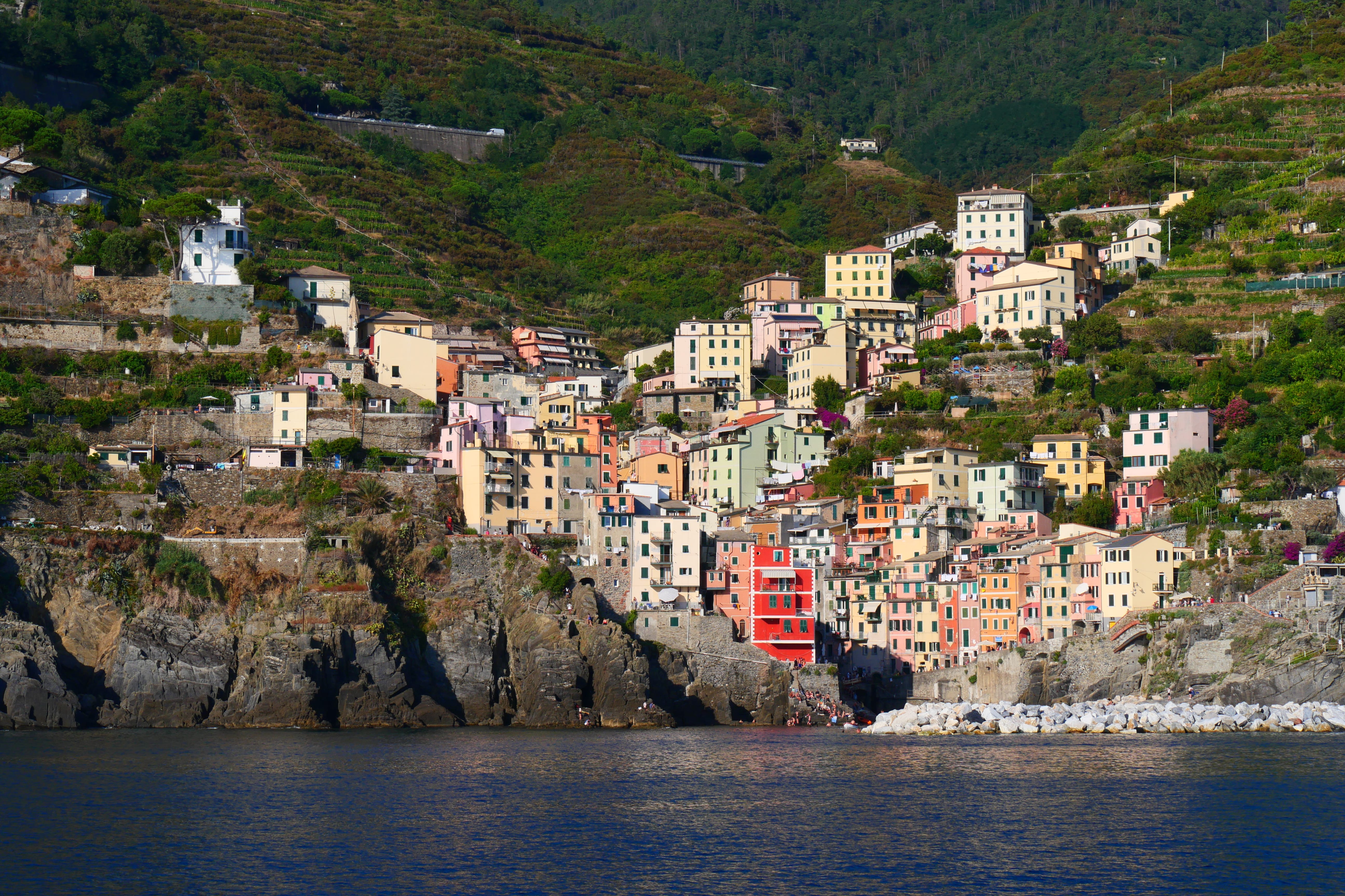 Nous embarquons donc enfin, après tous ces préparatifs, pour une journée de découverte. Le bateau longeant la côte (pensez toujours à vous placer de telle sorte à avoir vue sur la côte, si possible ! – ici à droite sur le bateau), cela nous offre une belle balade avec un premier arrêt à Portovenere qui ne fait pas partie du parc national des Cinque Terre. Nous restons donc à bord jusqu’à Riomaggiore, premier village, qui se dévoile au détour des rochers. Ce qui nous marque de loin, ce sont vraiment ces couleurs, cette impression de maisons les unes sur les autres et cette particularité de ces villages construits en hauteur. A la descente du bateau, nous nous dirigeons vers les rues du centre, qui sont déjà bien occupées et également bien inclinées. C’est notamment pour cela, et le fait que les rues soient principalement pavées, que nous vous conseillons d’être bien chaussés. Nous passerons donc une petite heure à Riomaggiore, le village que nous ressentirons comme étant resté dans l’état où il devait être il y a plusieurs décennies, avant de reprendre le bateau.
