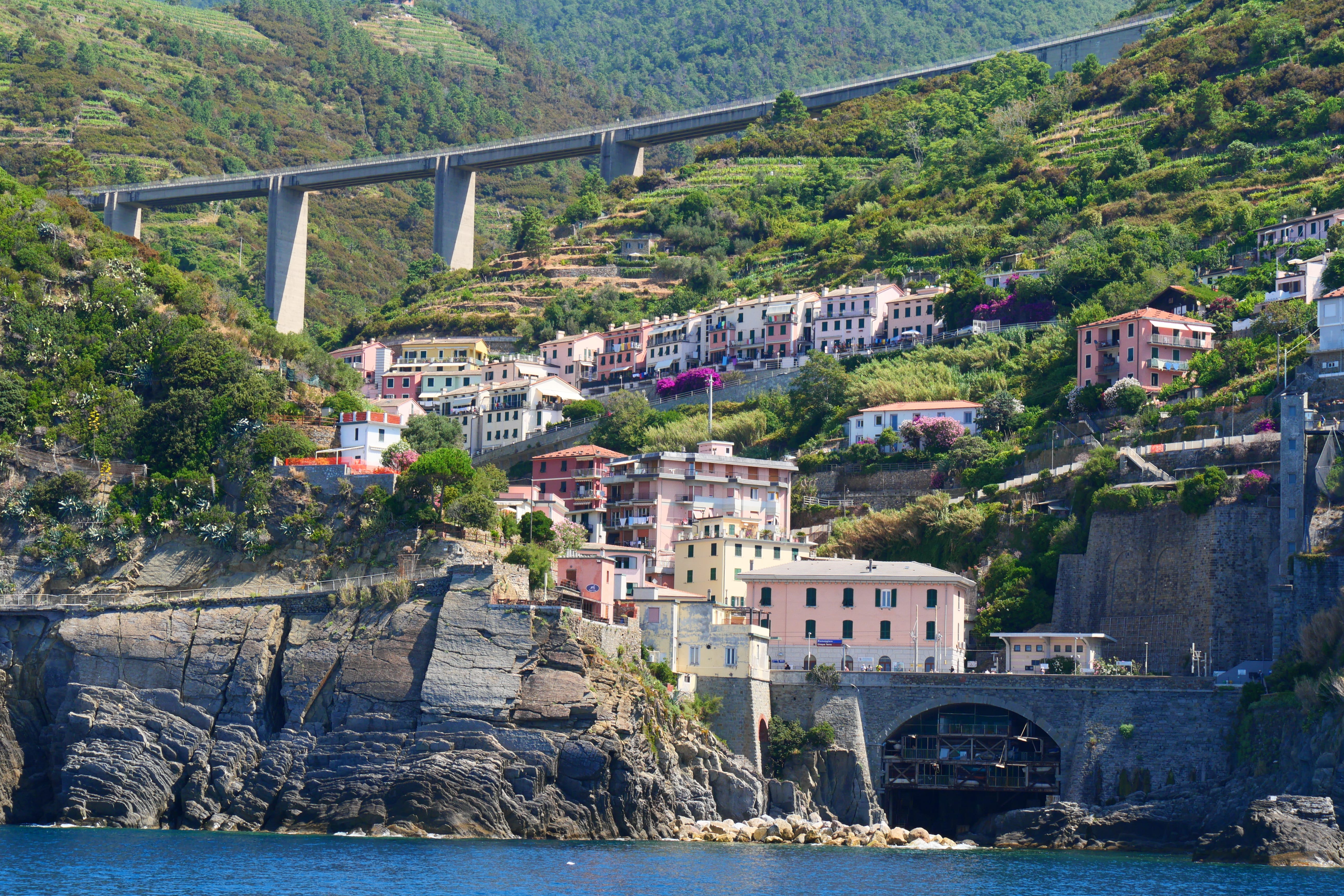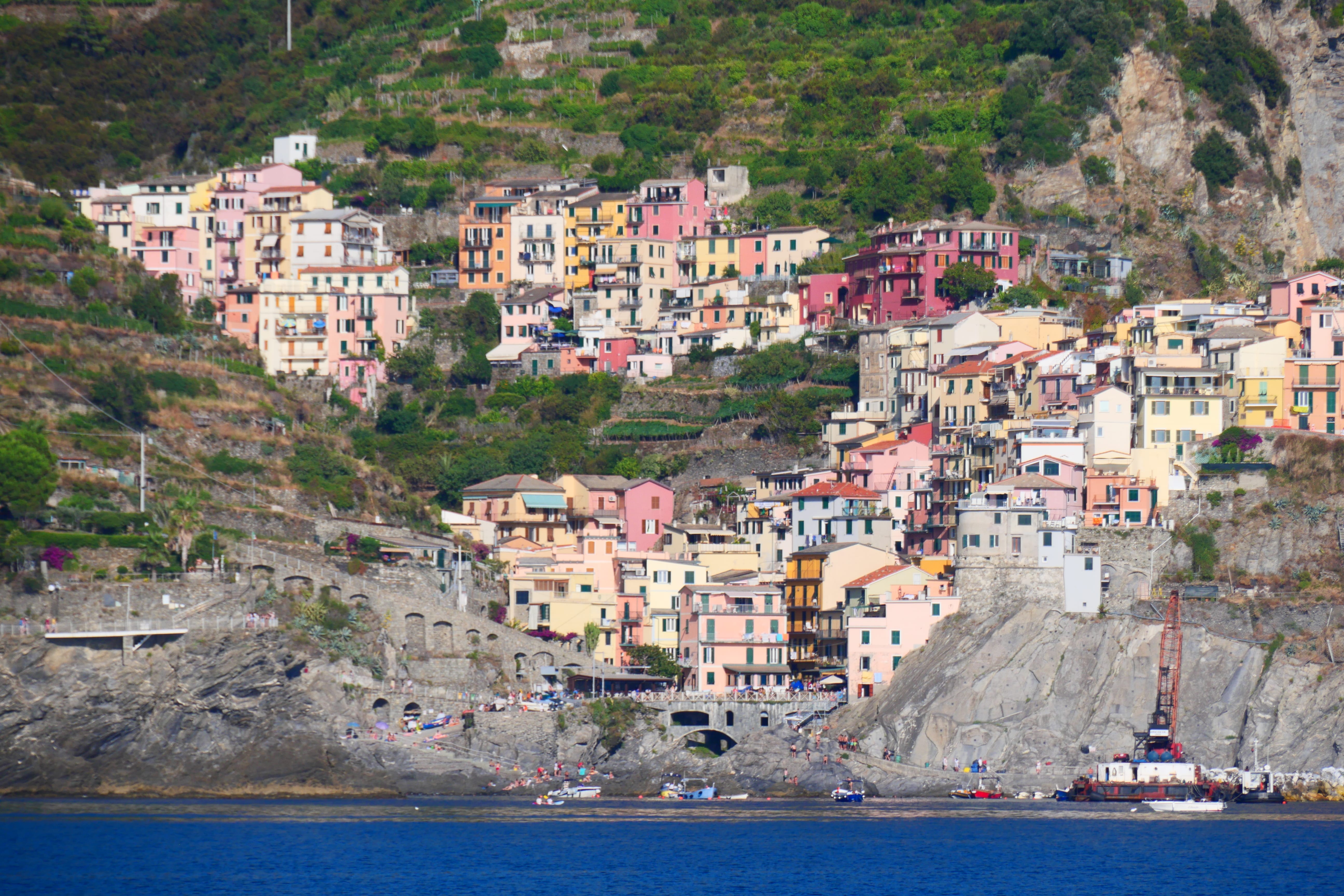 Nous arrivons une dizaine de minutes plus tard à Manarola. Nous sommes d’abord hypnotisés par une grue aux mâchoires immenses sur une plateforme, qui récupère les rochers dans l’eau pour reformer la digue. Les caractéristiques principales du village ressemblent beaucoup au premier mais celui-ci est beaucoup plus arboré et a une forme plus arquée. Nous prendrons un chemin qui s’élève rapidement par rapport au niveau de la mer et qui s’éloigne un peu du centre du village et là, nous trouverons une petite aire de pique-nique à l’ombre avec des tables en bois. Nous en profiterons pour déjeuner avec une vue magnifique sur le village. Nous redescendrons ensuite en direction de la gare car il est impossible d’accéder au troisième village par la mer.