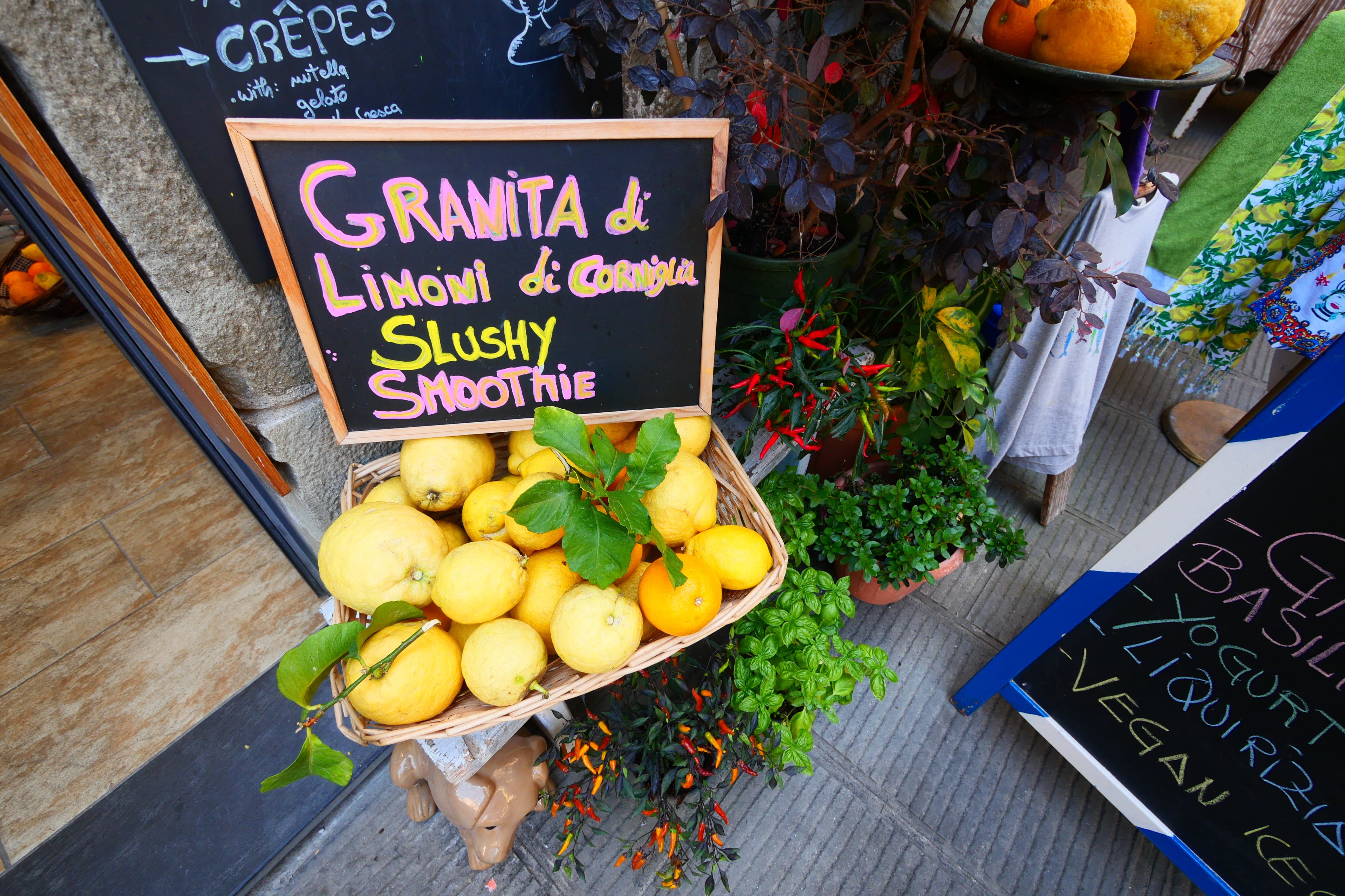 De Manarola, nous prendrons donc le train pour Corniglia. le trajet dure à peine 2 minutes et coûte 4€ par personne… En sortant du train, il faut faire quelques centaines de mètres à pied pour atteindre le bas d’un immense escalier de près de 400 marches (Elle, en a compté 379… mais on n’est pas à l’abri d’une erreur, dites-nous combien vous en compterez 😉). Le fait qu’il soit moins accessible n’est pas inconnu au fait que Corniglia soit peut-être le village qui est le mieux préservé de l’afflux touristique. Il y a toujours du monde, mais il nous a semblé qu’il était peut-être un peu moins visité. La crainte que le détour n’en vaille pas la peine, à cause de l’éloignement par rapport à la mer, a vite été balayé de par la vue qu’il offre sur le littoral et de par son caractère propre. Les petites ruelles étroites avec les boutiques touristiques et offrant des spécialités locales sont charmantes et nous prendrons plaisir à nous y balader. Il, en profitera aussi pour tenter un nouveau parfum de glace avec les ressources locales : citron-basilic. Assurément rafraîchissant et adapté à l’été aux Cinque Terre…!