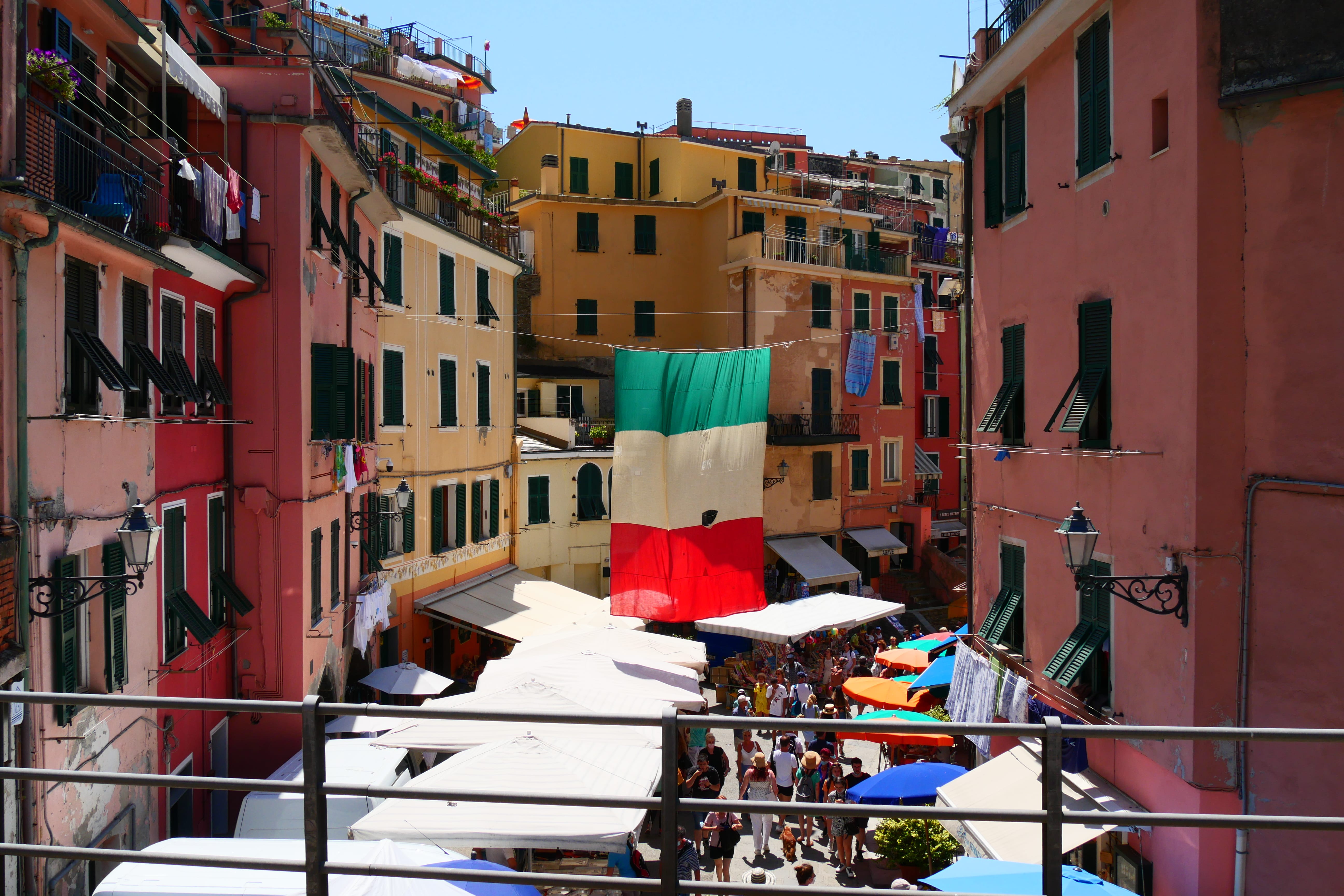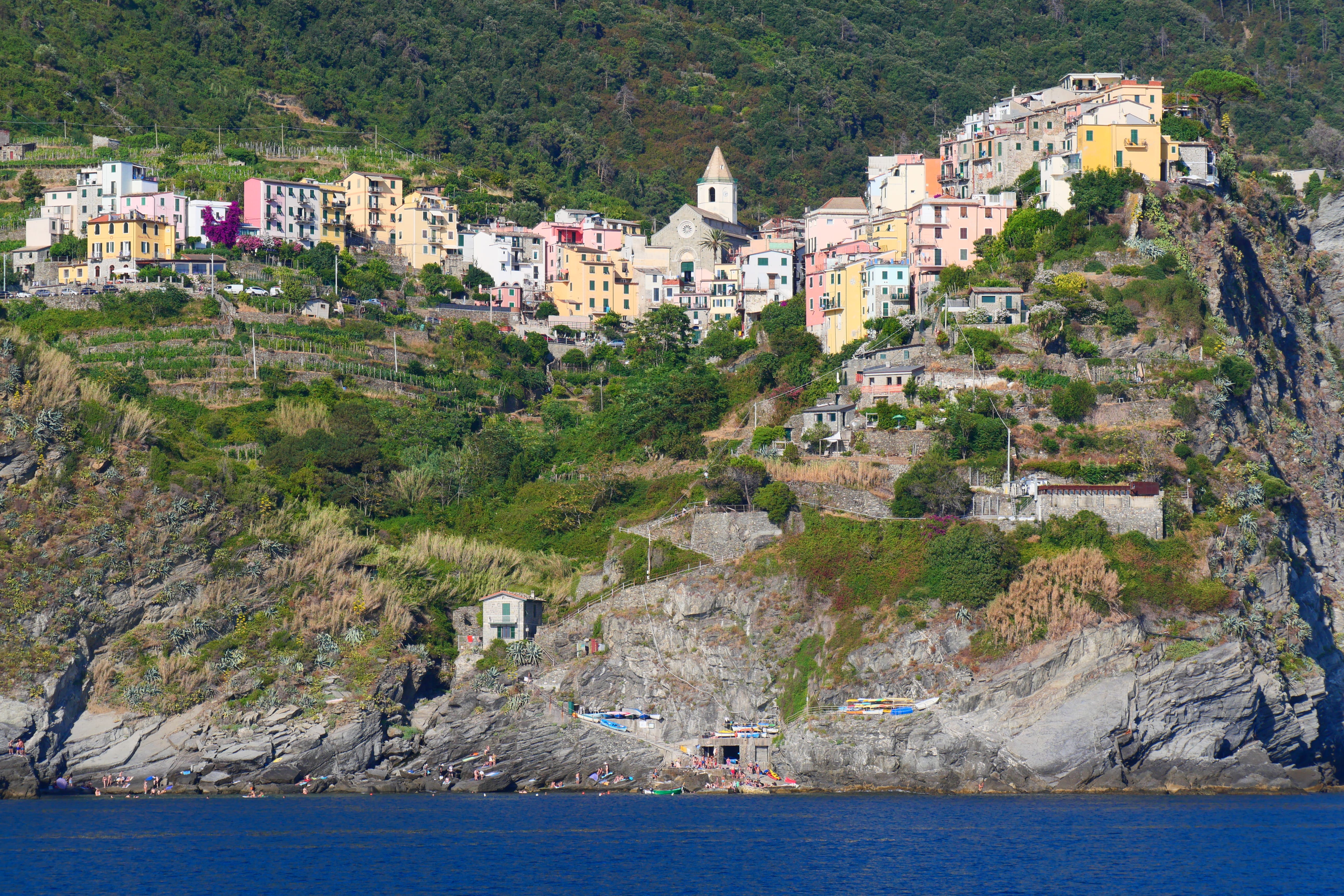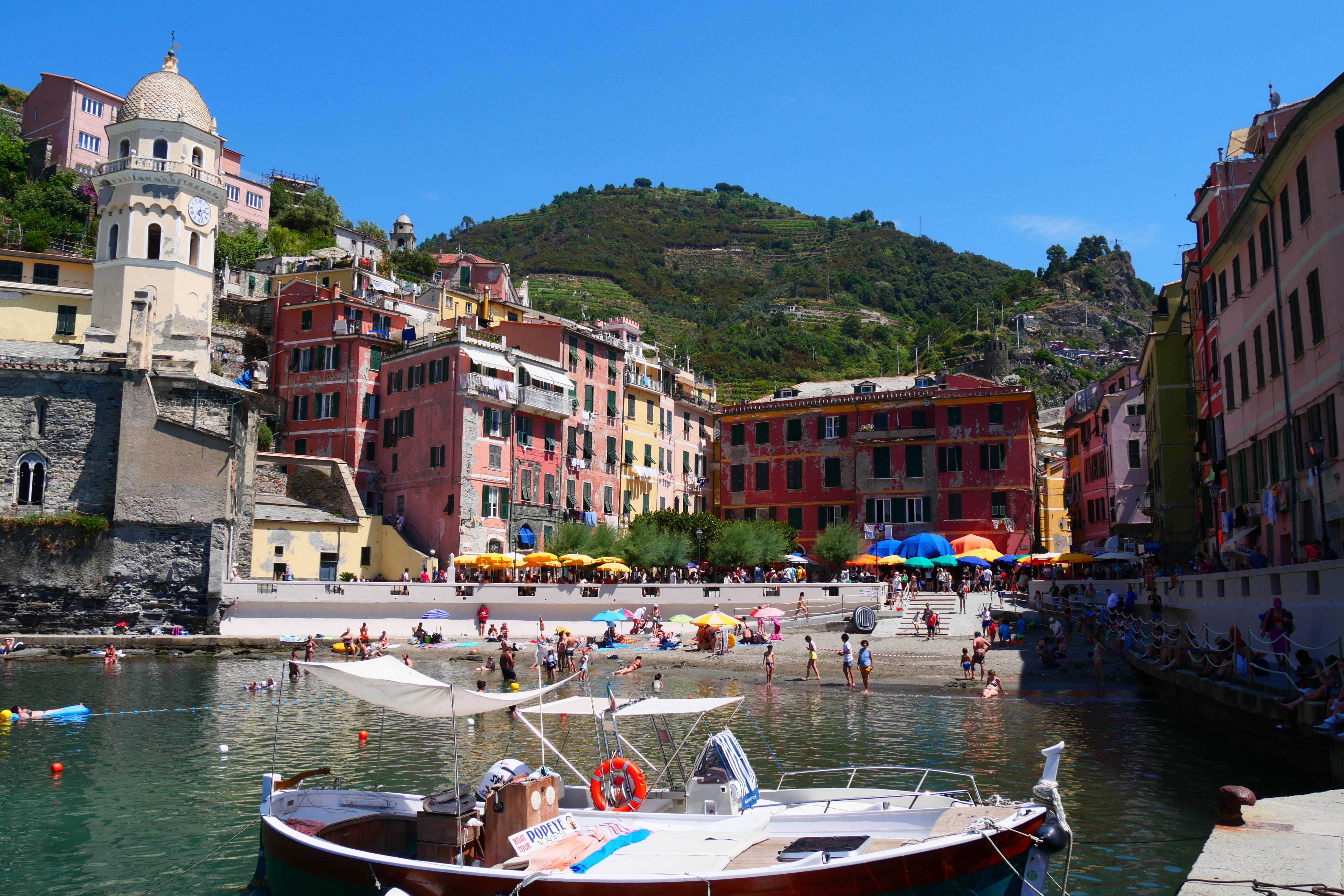 Tout comme on ne peut pas y venir par la mer, on ne peut pas non plus en repartir. Il faut donc à nouveau affronter l’escalier et les centaines de mètres à pied pour rejoindre la gare et reprendre le train (encore 4€ par personne, encore 2 minutes !) pour le quatrième village : Vernazza. La sortie de la gare se fait en plein centre, au milieu des étals du marché. On sent que la chaleur se fait plus imposante et la fatigue plus importante. La concentration des touristes est plutôt maintenant autour de l’eau. Il n’y a pas de plage à proprement parler mais chaque coin de béton est investi et la moindre faille permet tout de même d’y planter un parasol. Les plus téméraires redoublent d’inventivité pour plonger depuis le quai sur lequel accoste le bateau. Nous aurons tout le temps de les regarder s’agiter tandis que nous attendions pour le reprendre et nous diriger vers le cinquième et dernier village du parc.