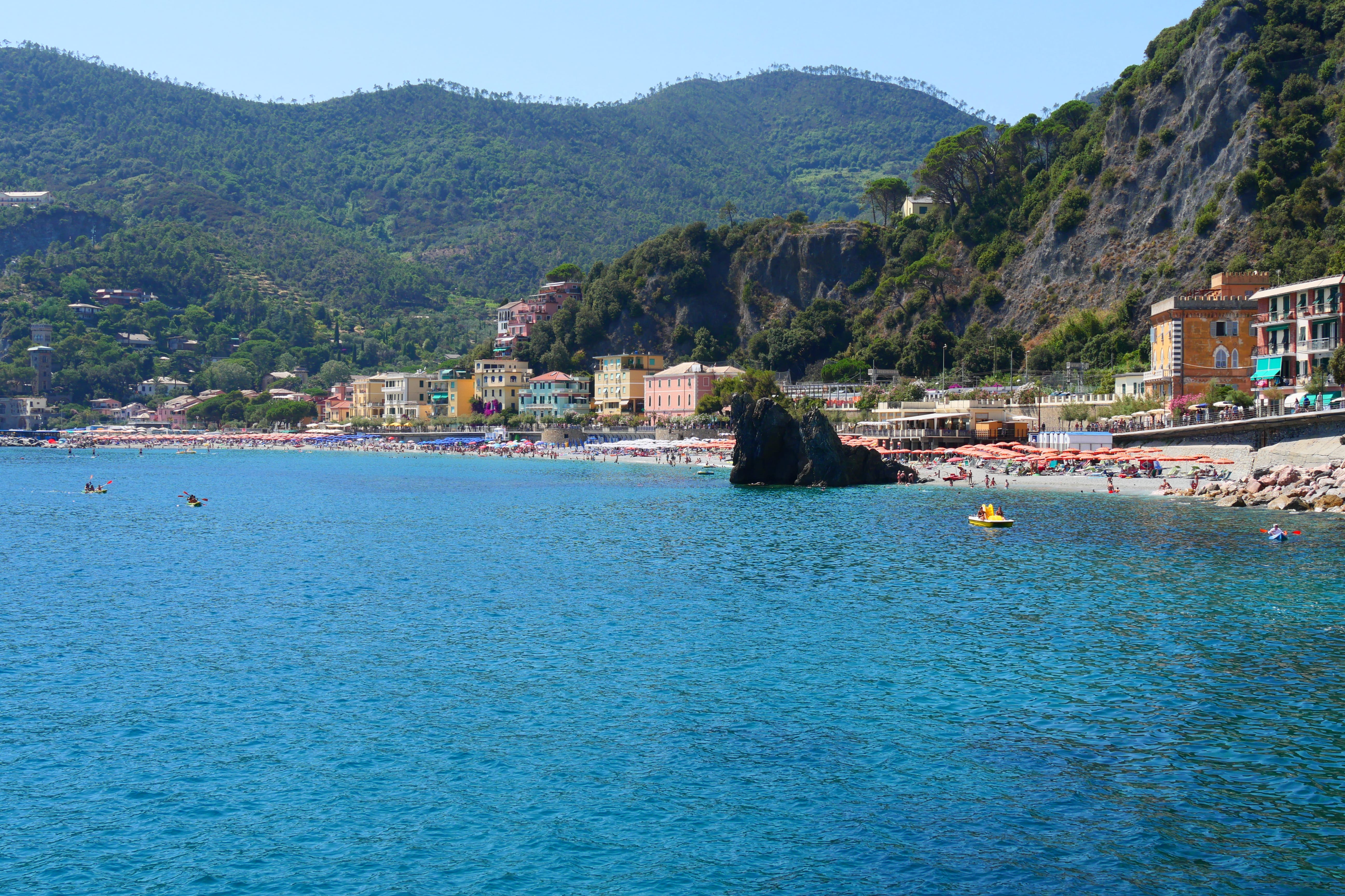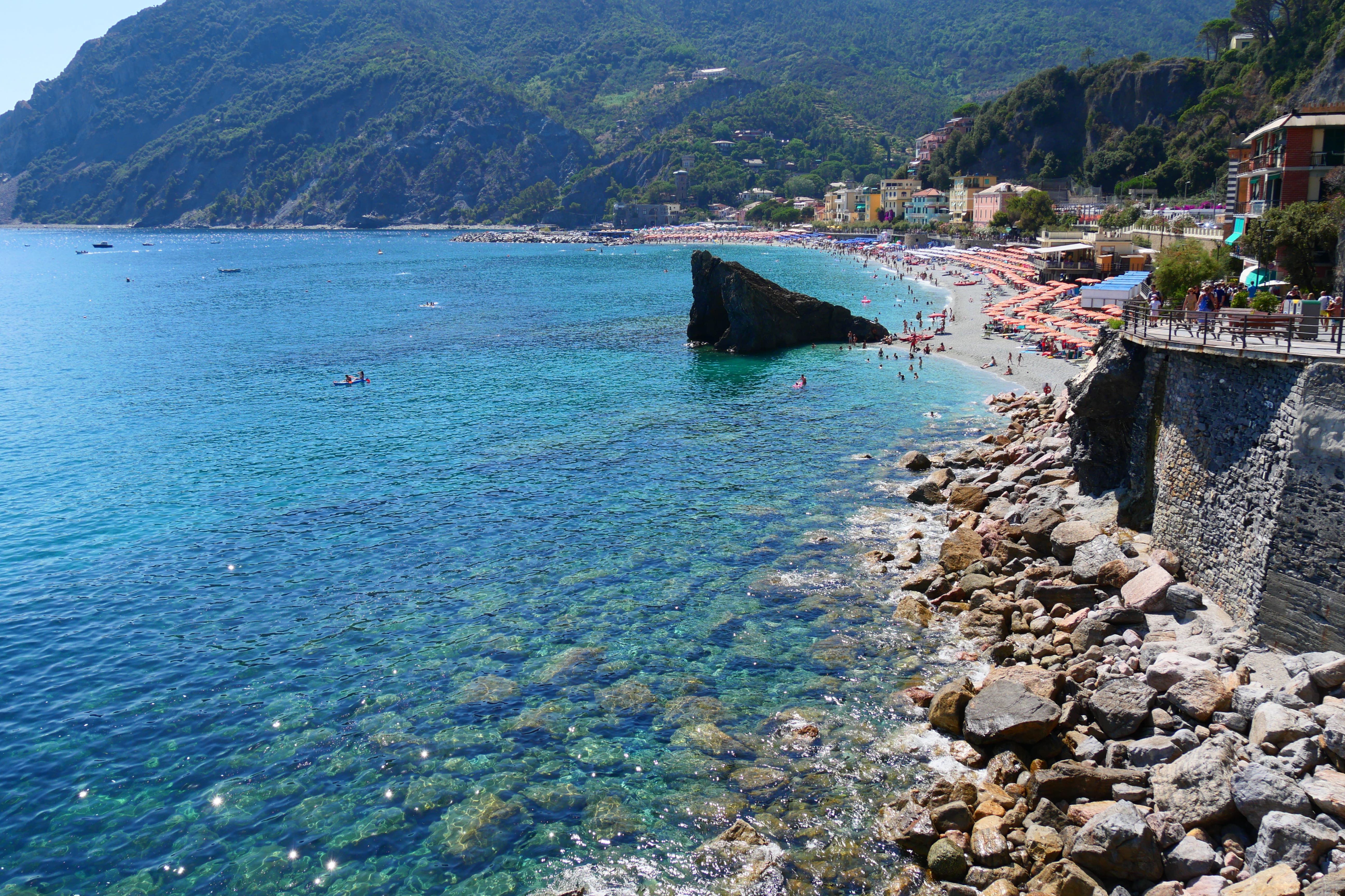 En arrivant à Monterosso, la journée nous semble avoir déjà été bien longue. Nous nous baladons un peu et hésitons entre la plage juste à côté du quai ou bien celle qu’il faut rejoindre en empruntant la route à gauche de l’arrivée. Nous irons jeter un œil mais il semble qu’il n’y ait pas d’endroit public, du moins pas à proximité même d’où nous étions. Nous reviendrons donc sur nos pas pour profiter au maximum de l’eau et d’un peu de repos sur la plage gratuite.