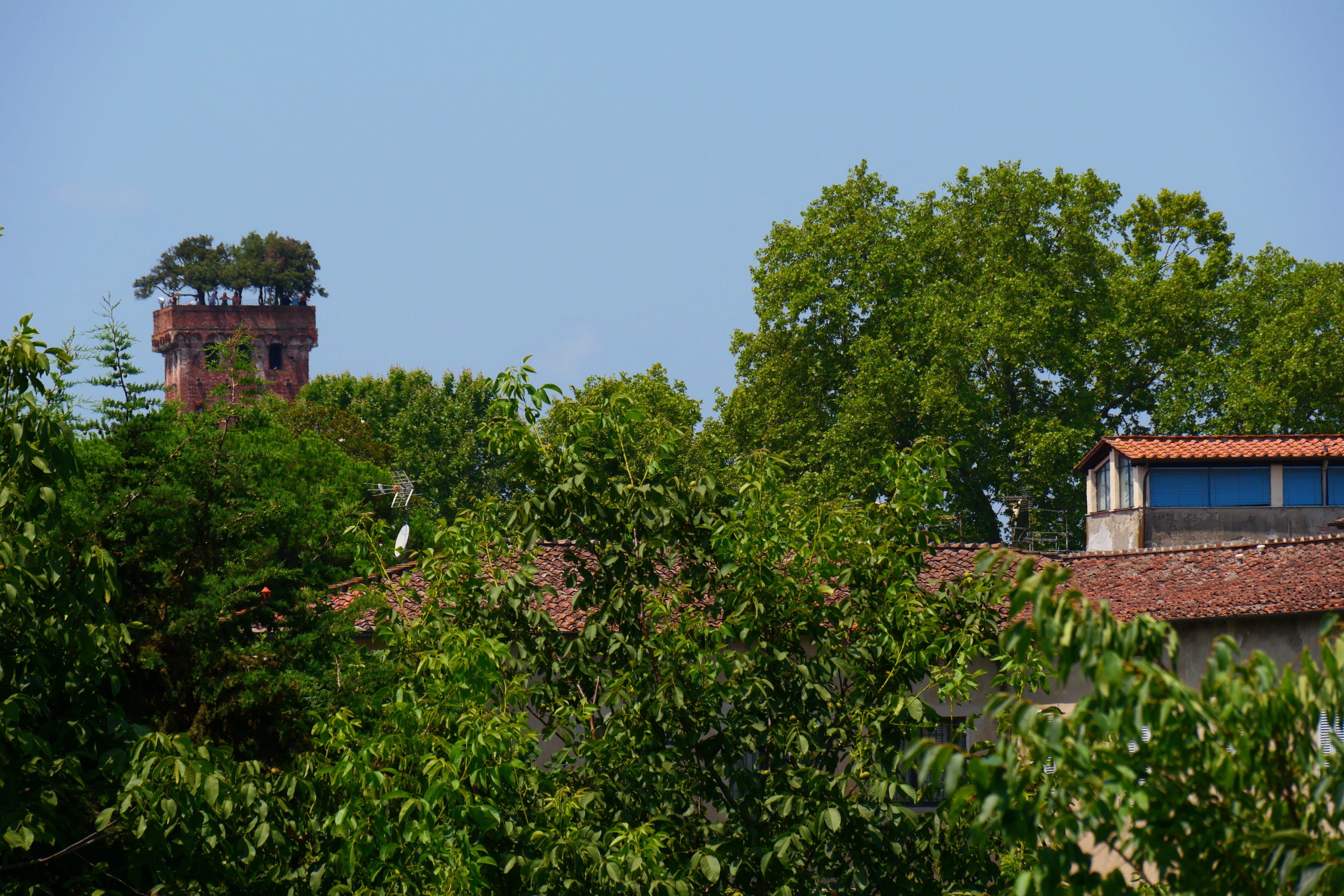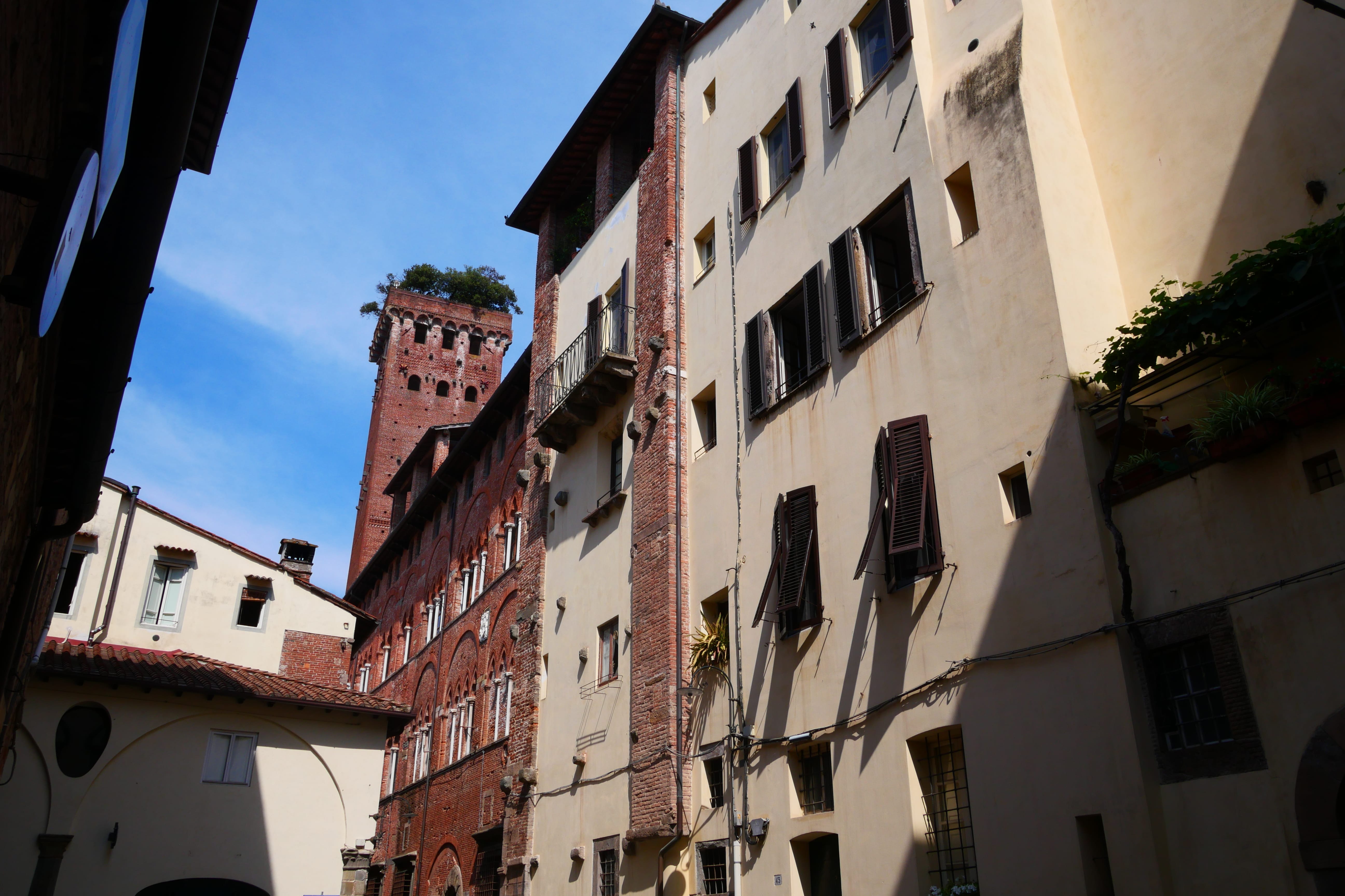 Revenons d’abord à Lucca, et commençons par une petite astuce pour se garer gratuitement, enfin ! Nous avions lu quelque part sur Internet que le stationnement était payant au Sud du contournement de la cité, c’est donc dans ces rues que nous avons cherché, et rapidement trouvé des places gratuites, à quelques centaines de mètres des remparts. Pour l’adresse exacte, en ce qui nous concerne, c’était la Piazza C.Cotenna Leonardi, via Fabio Filzi. Il y a également du stationnement gratuit dans toute la rue, et avec un peu de chance vous aurez une place gratuite à quelques mètres seulement des parkings payants le long de l’axe principal. Nous avons donc franchi les remparts par l’une des portes de la ville, et nous sommes dirigés vers la Torre Guinigi, une tour ayant la particularité d’avoir des arbres à son sommet, lui donnant ainsi ce côté unique et atypique pouvant motiver un détour.