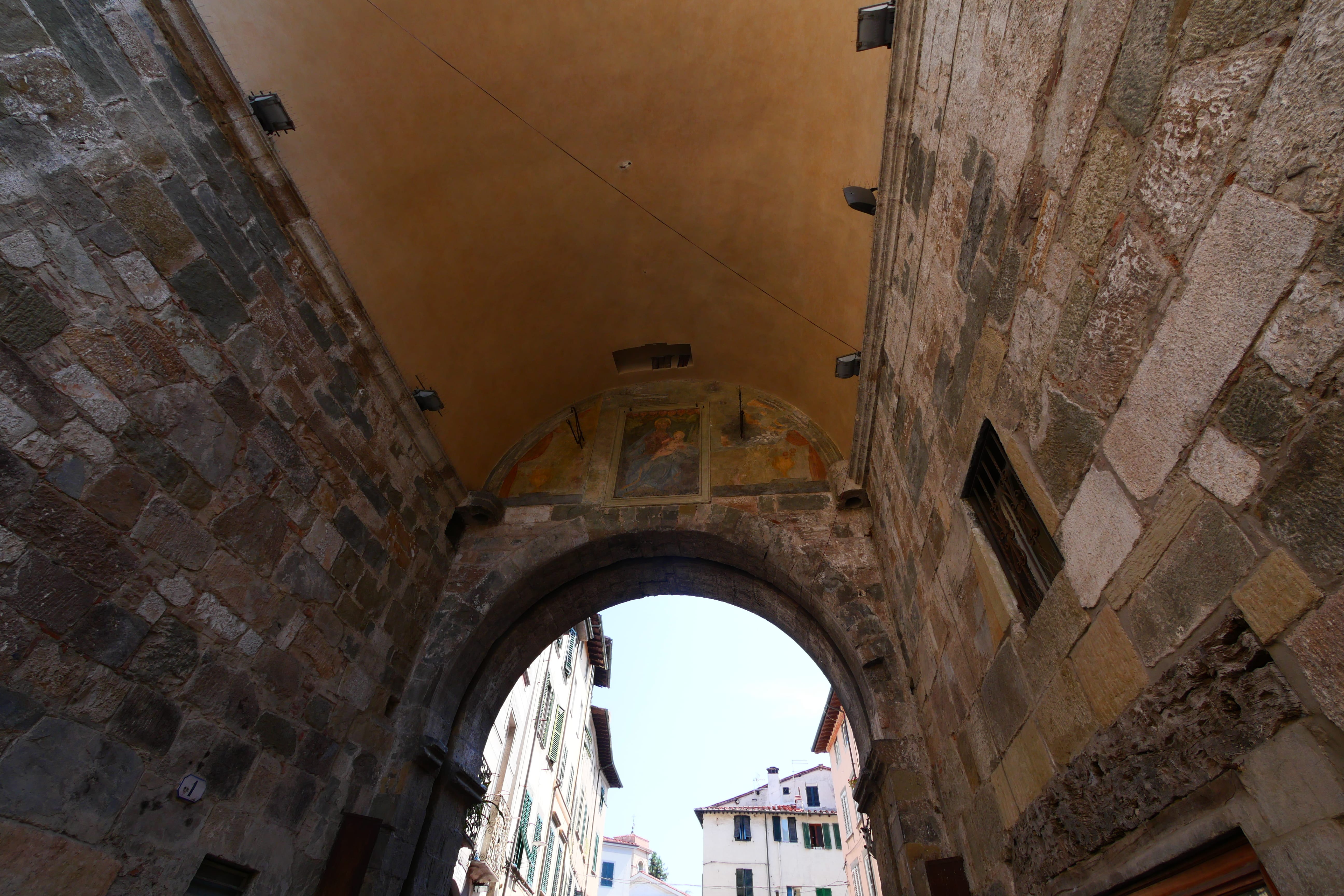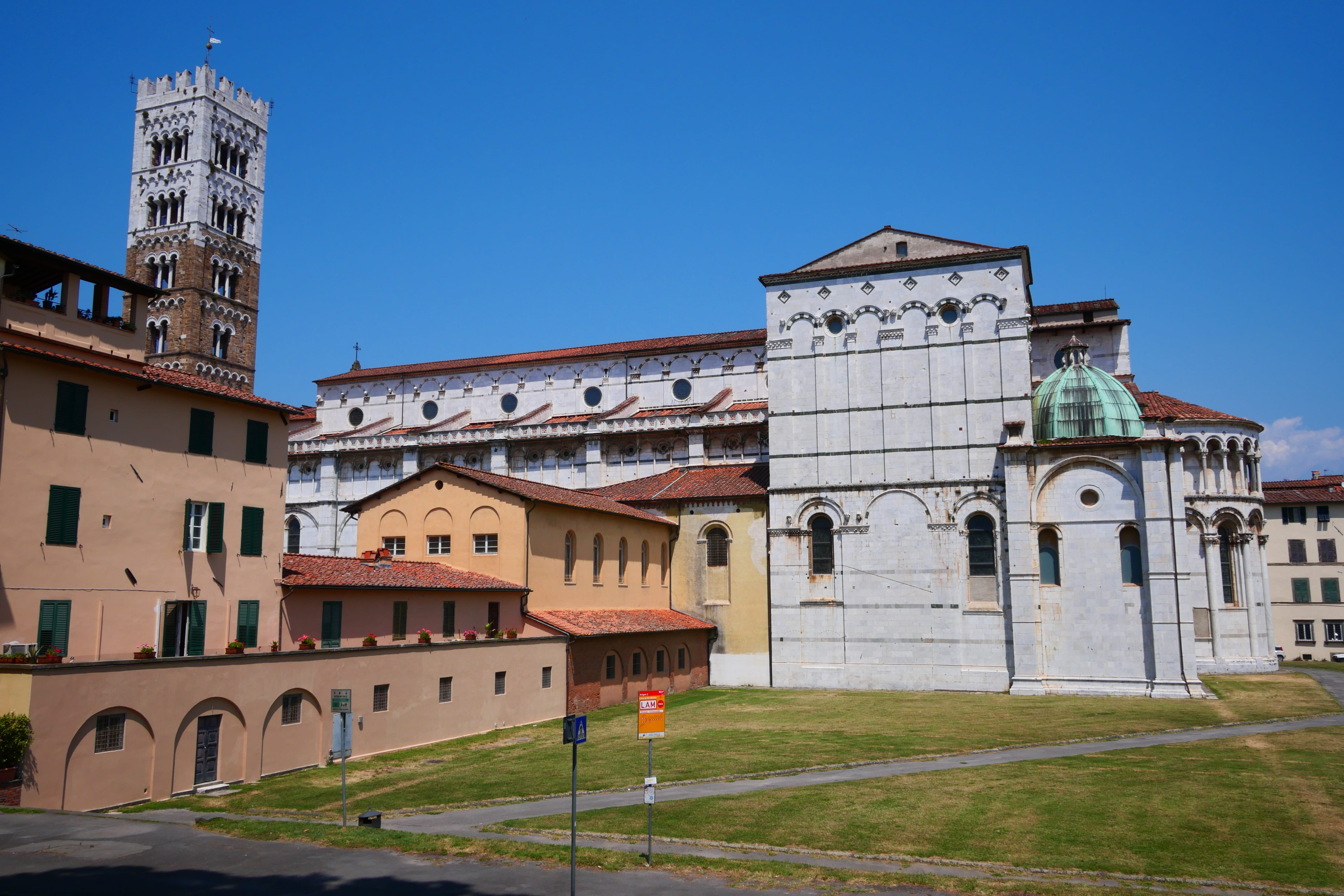 Mais cela ne peut pas résumer Lucca, c’est bien plus que cela. C’est une ville harmonieuse, à la fois figée dans une époque révolue, avec un patrimoine évident, mais aussi une ville vivante, avec de nombreux commerces s’étant approprié les boutiques de l’époque. On se retrouve ainsi à pouvoir s’émerveiller de certaines devantures, de motifs sculptés, de décors anciens, tout en pouvant boire un café ou déguster une glace. On vous met au défi de trouver le cœur de la ville, la Piazza Anfiteatro sans utiliser votre téléphone. De notre côté, et même après avoir bien mémorisé la carte de la ville lors de nos recherches la veille, nous n’y sommes pas parvenus tellement le labyrinthe est déroutant et la jolie place bien dissimulée. Une fois trouvée, nous y déjeunerons, et étant plutôt loin des principales zones touristiques, à un prix plus que raisonnable. Nous reprendrons notre chemin en direction de la voiture, notre pause devant se terminer afin de rejoindre Naples, en essayant de prendre un chemin retour différent de l’aller. C’est ainsi que nous tomberons sur la superbe cathédrale, très proche de Pise, Sienne ou Florence en termes de style architectural, mais n’ayant pour autant rien à leur envier. C’est sur les remparts que nous finirons par contourner la ville par le Sud, avant de rejoindre notre voiture et repartir par les petites routes de Toscane.