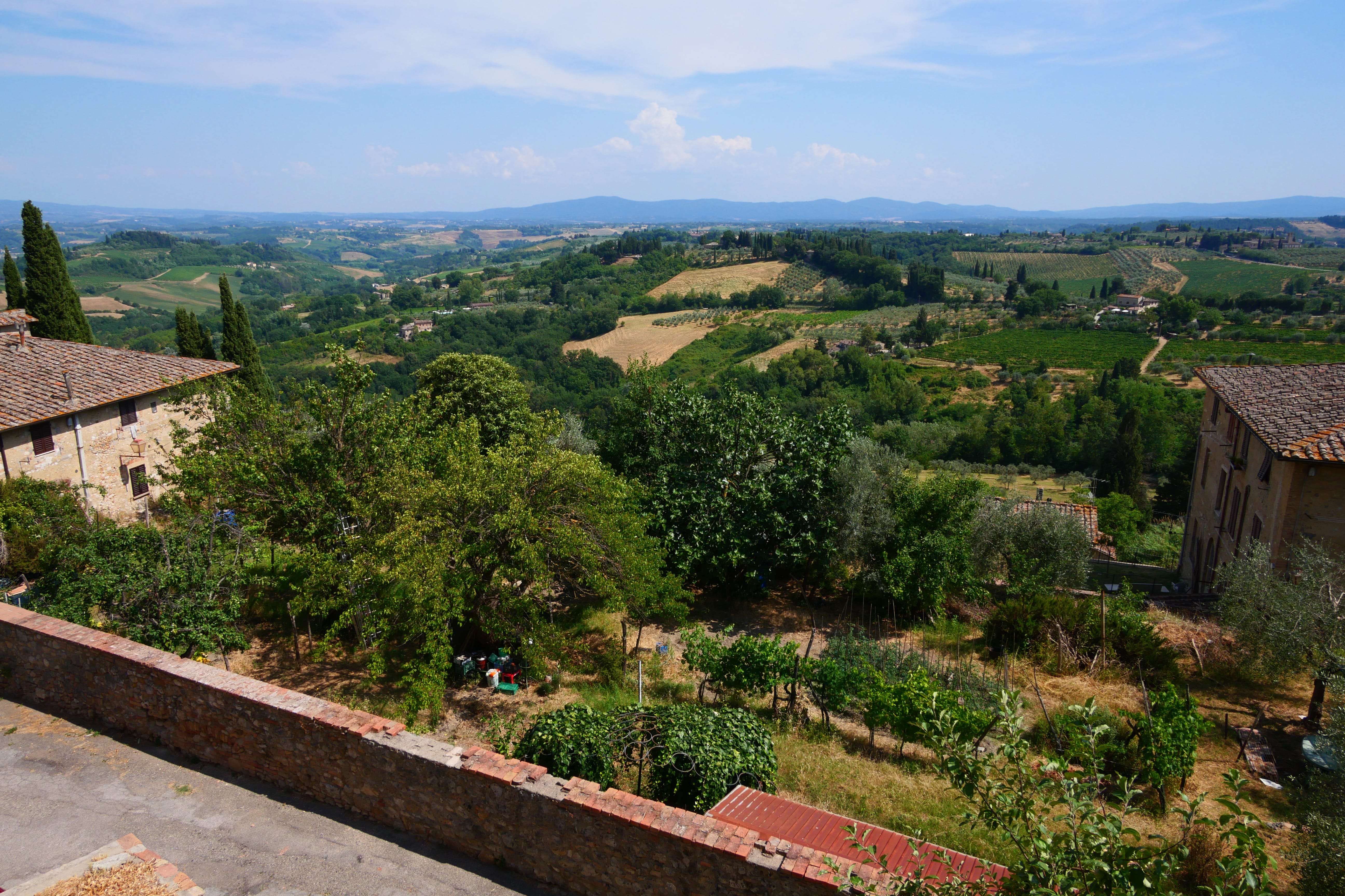 Et finalement, notre bonne impression s’est confirmée lorsqu’après nous être garés sur l’un des parkings à proximité des remparts, nous sommes entrés dans la ville, très préservée et typique. Si l’on n’a moins retrouvé ce coté authentique omniprésent à Lucca, on a apprécié y passer une heure, le temps d’apercevoir les tours de plus près, de manger une glace sur les marches du Duomo et d’aller contempler la vue panoramique en redescendant vers le parking. A noter que si les deux glaciers rivalisent de superlatifs pour vendre leurs produits, et que celui que nous avons choisi avait soi-disant été champion du monde il y a quelques années, nous n’en garderons pas un souvenir inoubliable. Il était venue l’heure de reprendre la route, et rejoindre Naples, sans plus d’autres détours cette fois.