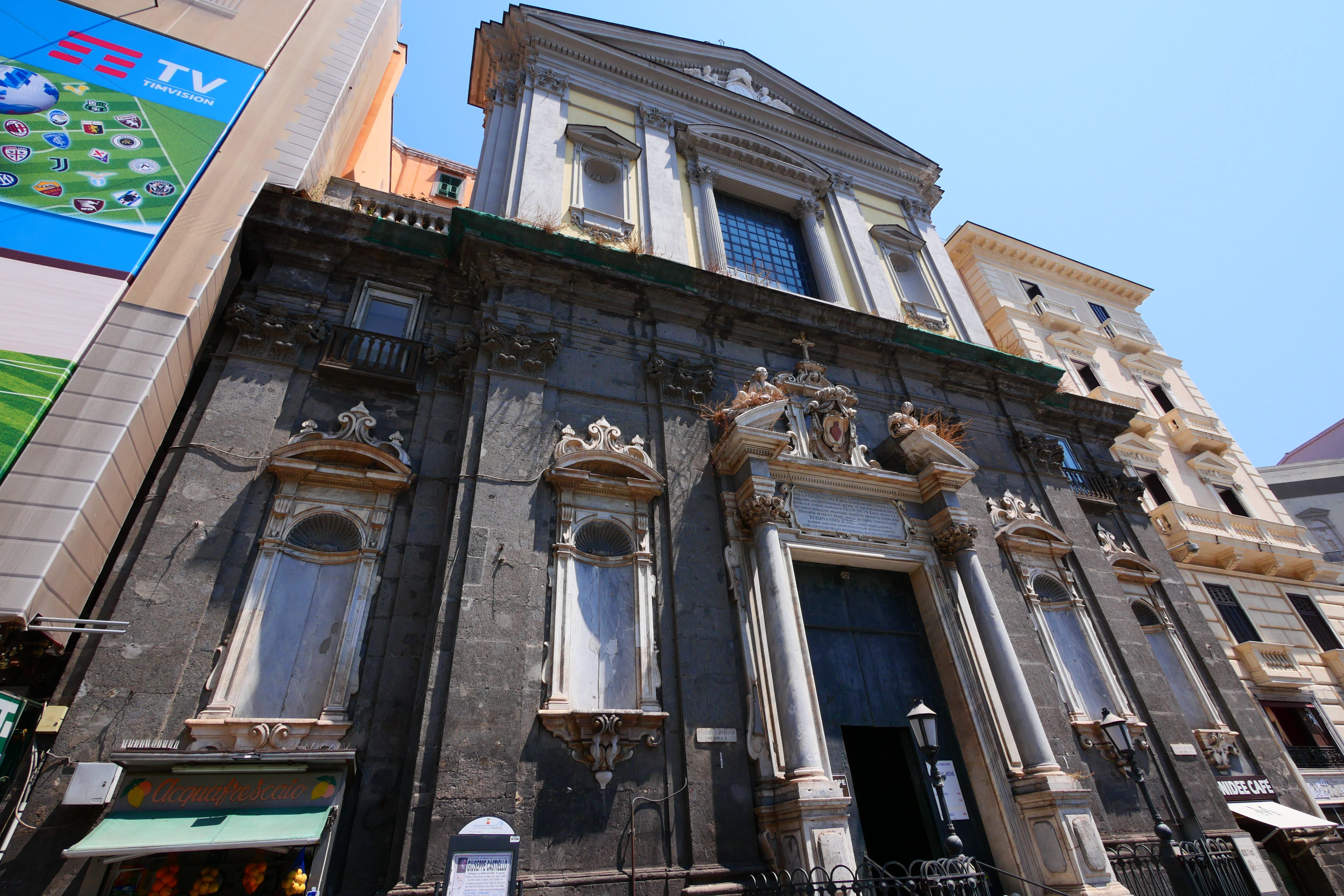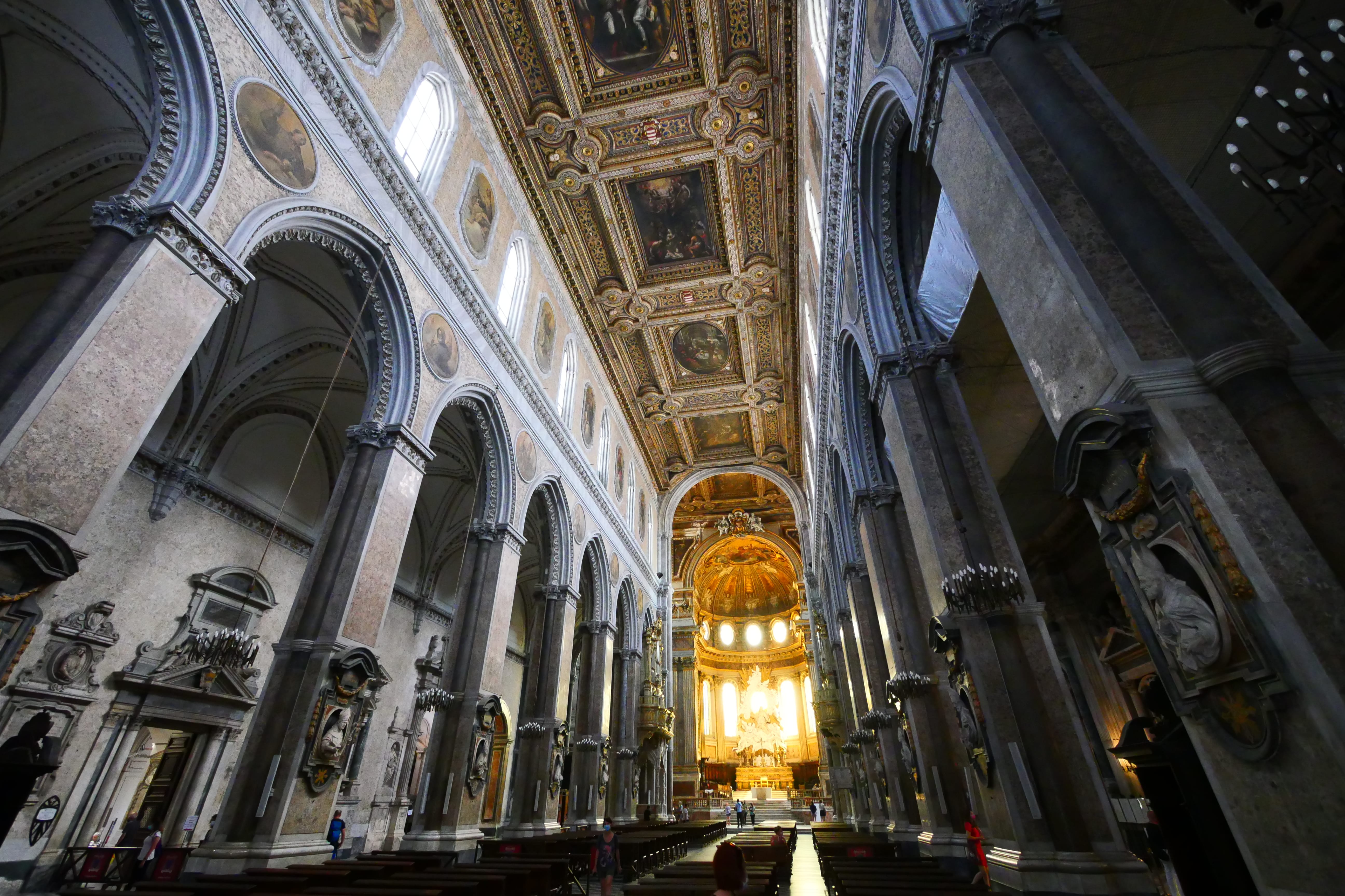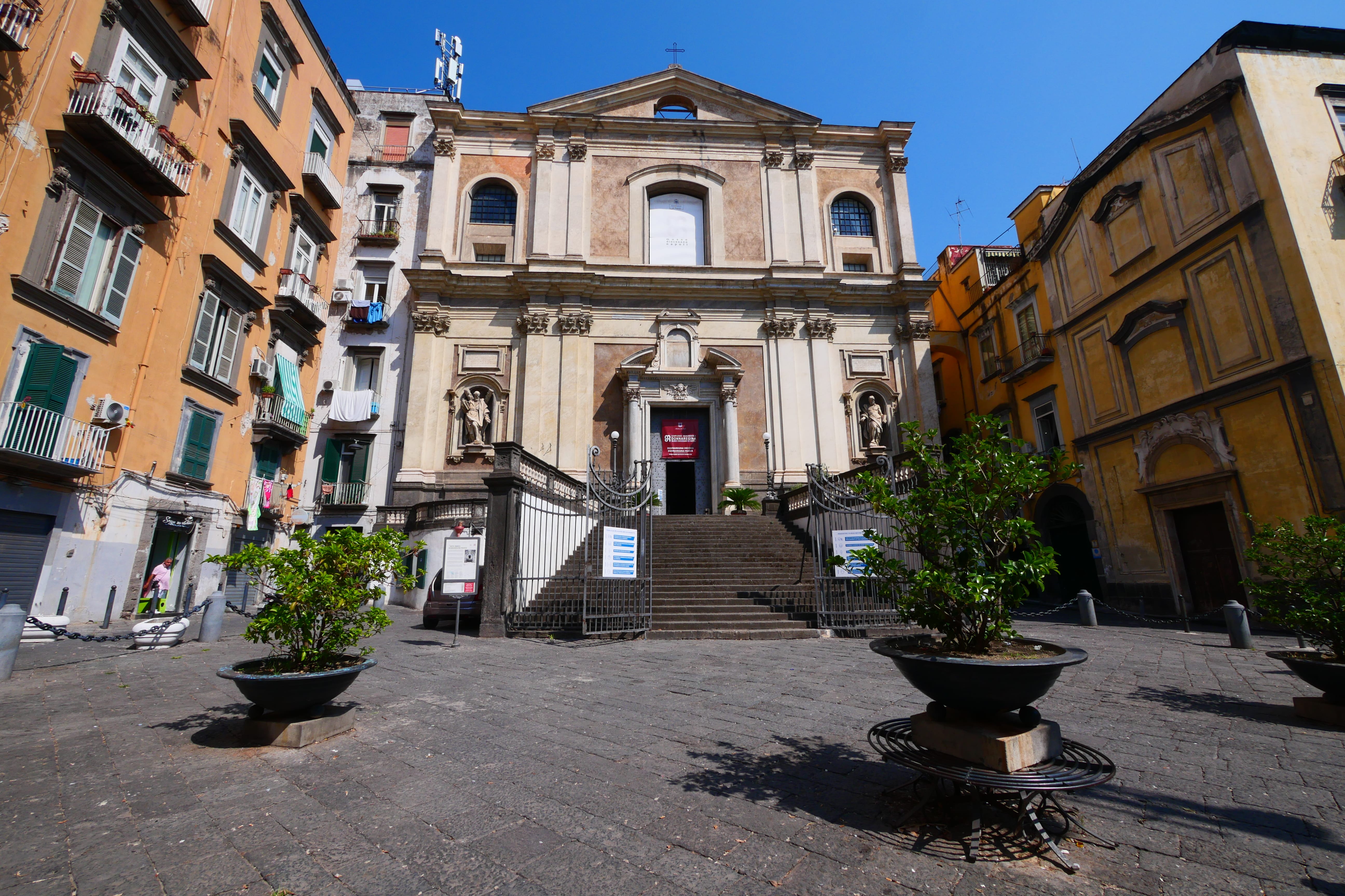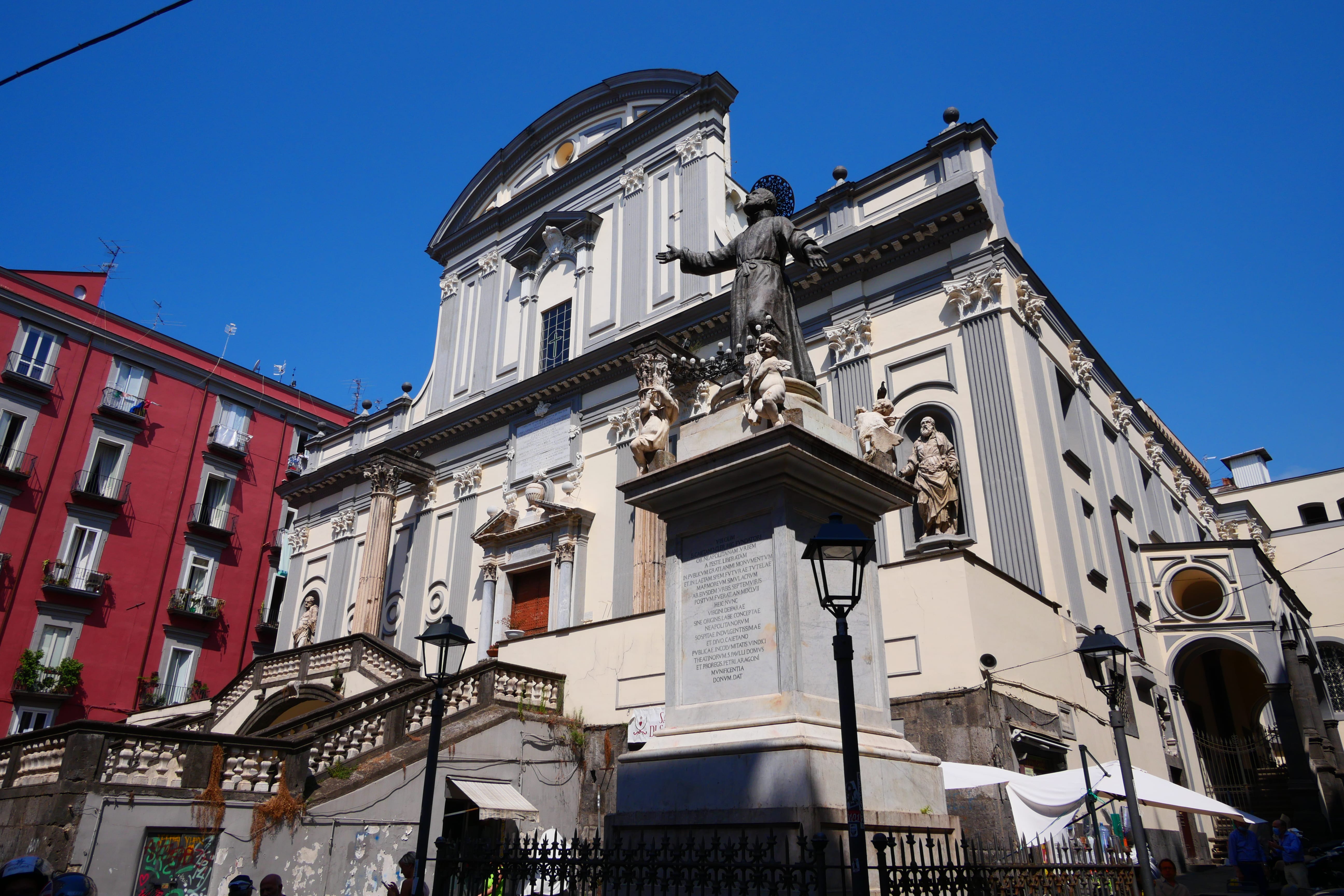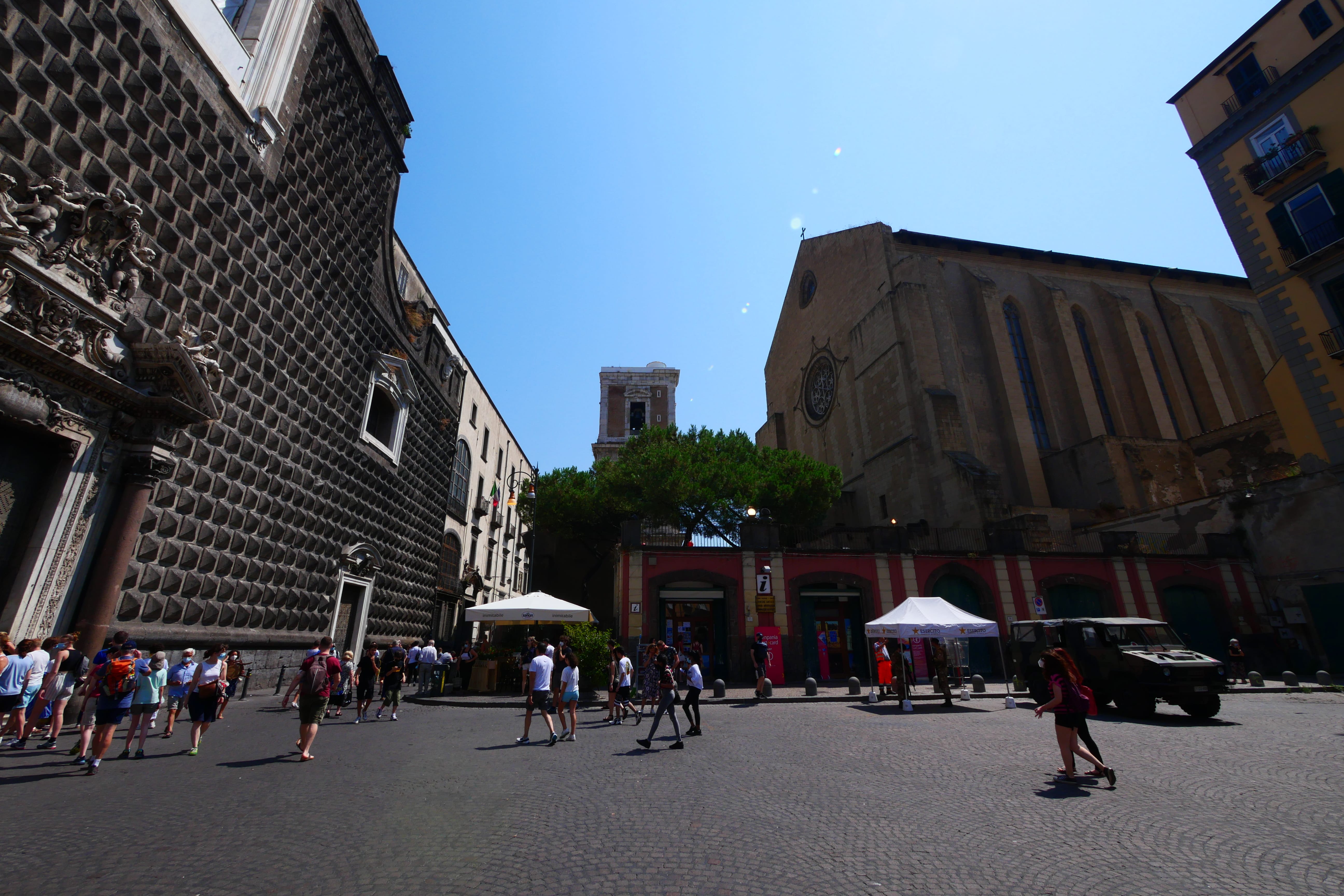 Un peu plus loin, nous arriverons à la Basilique Santa Chiara qui est le plus grand monument gothique de Naples. L’intérieur est magnifiquement décoré et très lumineux ce qui, n’est pas ce à quoi nous nous attendions en voyant l’extérieur. En effet, celui-ci est beaucoup plus simple et austère. Nous avions également vu qu’il était possible de visiter le cloître qui devait présenter de nombreuses colonnes et fresques qui en font un endroit particulièrement kitsch mais également surprenant. Nous avons cependant trouver que le prix d’entrée (6€ par personne) pour simplement y passer quelques minutes et prendre des photos, n’était pas justifié.